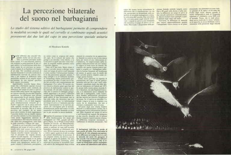 La percezione bilaterale del suono nel barbagianni Lo studio del sistema uditivo del barbagianni permette di comprendere le modalità secondo le quali nel cervello si combinano segnali acustici provenienti dai due lati del capo in una percezione spaziale unitaria di Masakazu Konishi erché abbiamo due orecchi? Dopotutto anche con un solo orecp chio si possono percepire molto bene i suoni. Vi è una funzione, tuttavia, che richiede la partecipazione di due organi uditivi: la localizzazione della direzione esatta da cui proviene un suono, come il pianto di un bambino o il ringhio di un cane. Nel cosiddetto processo di fusione binaurale il cervello confronta le informazioni ricevute da ciascun orecchio e poi traduce le differenze nella percezione unitaria di un singolo suono proveniente da una regione specifica dello spazio circostante. Approfondite ricerche hanno dimostrato che i riferimenti spaziali ricavati dal cervello umano sono costituiti da differenze nel tempo di arrivo e nell'intensità delle onde sonore che raggiungono ciascun orecchio da una data sorgente puntiforme. Le differenze sono dovute alla separazione fra gli orecchi. Quando un suono ci giunge da un punto direttamente di fronte a noi, le onde raggiungono simultaneamente entrambi gli orecchi e agiscono con la stessa intensità sulle superfici recettive che inviano informazioni al cervello. Ma se il suono proviene, per esempio, da un punto posto più a sinistra, le onde raggiungono l'orecchio destro con un ritardo rispetto all'orecchio sinistro. La loro intensità diventa anche leggermente inferiore in corrispondenza dell'orecchio destro perché, nella loro propagazione, sono state in parte assorbite o riflesse dal capo. Il modo in cui il cervello si serve delle differenze nel tempo di arrivo e nell'intensità delle onde sonore diventa ovvio quando si inviano suoni separatamente a ciascun orecchio tramite auricolari. Invece di percepire due segnali distinti, udiamo un solo segnale - un «fantasma» - che sembra avere origine in un punto all'esterno o all'interno del capo. Se gli stimoli sono egualmente intensi (di eguale volume) e simultanei, percepiamo 56 LE SCIENZE n. 298, giugno 1993 un suono come se sorgesse dal centro del capo. Se il volume del suono che giunge a un orecchio viene ridotto, o se il suo arrivo a quell'orecchio viene ritardato, la sorgente sembra spostarsi verso l'orecchio opposto. Tutto ciò è ben noto. Meno chiaro è come il cervello riesca a rilevare variazioni nel tempo di arrivo e nell'intensità e come combini l'informazione risultante in una percezione spaziale unitaria. I miei colleghi e io al California Institute of Technology stiamo analizzando questo problema da oltre 15 anni con lo studio del cervello e del comportamento del barbagianni (Tyto alba). Di recente siamo riusciti a chiarire quasi ogni fase del processo di elaborazione sonora in questo animale. (Il solo altro sistema sensoriale che si conosca in dettaglio paragonabile appartiene a un pesce.) Abbiamo scoperto che il barbagianni combina segnali uditivi di tipo posizionale non in una sola volta, ma attraverso una sorprendente serie di fasi. Le informazioni sul tempo di arrivo e l'intensità sono elaborate separatamente in vie nervose parallele che convergono solo al termine. Probabilmente anche nell'uomo e in altri mammiferi la fusione binaurale avviene per lo più secondo la stessa modalità. progettai di esaminare le basi nervose 1 della localizzazione dei suoni nel barbagianni nel 1963, quando udii Roger S. Payne, ora al Whale Conservation Institute di Lincoln, nel Massachusetts, riferire che questi uccelli riescono facilmente a catturare un topo nell'oscurità, basandosi solamente su riferimenti acustici. Mi ero laureato da poco in zoologia e volevo sapere qualcosa di più su come gli animali identifichino la posizione di una sorgente sonora, ma dovevo ancora scegliere la specie da studiare. Tre anni dopo. alla Princeton University, potei osservare di persona le incredibili capacità uditive dei barbagianni dopo averne ottenuti tre esemplari da un appassionato. Quando ne osservai uno in una stanza buia, per mezzo di una videocamera all'infrarosso, fui impressionato dalla rapidità e dalla precisione con cui l'animale volgeva la testa verso un rumore. Ne conclusi che questa risposta poteva aiutarmi a scoprire se i barbagianni utilizzino la fusione binaurale nel localizzare un suono; in questo caso, lo studio del loro cervello poteva chiarire come avvenga questa fusione. Come avevo previsto, la risposta di orientazione del capo si rivelò particolarmente utile per me e per i miei collaboratori, soprattutto dopo che ebbi allestito un laboratorio al Caltech nel 1975. In alcune delle nostre prime ricerche Eric I. Knudsen, ora alla Stanford University, e io ottenemmo prove indirette del fatto che il barbagianni, come l'uomo, deve fondere informazioni provenienti dai due orecchi per riuscire a localizzare un suono. Se si copriva un orecchio, l'animale volgeva la testa in risposta a un suono da un altoparlante, ma non si orientava esattamente verso di esso. All'inizio degli anni ottanta Andrew Moiseff e io dimostrammo inoltre che il barbagianni ricava informazioni direzionali dalle disparità nel tempo di arrivo e nell'intensità dei segnali che giungono ai due orecchi, disparità che in termini tecnici vengono rispettivamente chiamate «differenze temporali interaurali» e «differenze di intensità interaurali». Nel Il barbagianni individua la preda al buio grazie all'udito. Esso determina la traiettoria di volo adeguata paragonando le differenze nei tempi di arrivo e nelle intensità dei suoni che giungono ai due orecchi. Uno stroboscopio infrarosso che lampeggiava cinque volte al secondo ha fotografato questo barbagianni in azione nel laboratorio dell'autore. corso del nostro lavoro misurammo le differenze che si manifestavano via via che spostavamo un altoparlante sulla superficie di un globo immaginario centrato sulla testa dell'uc