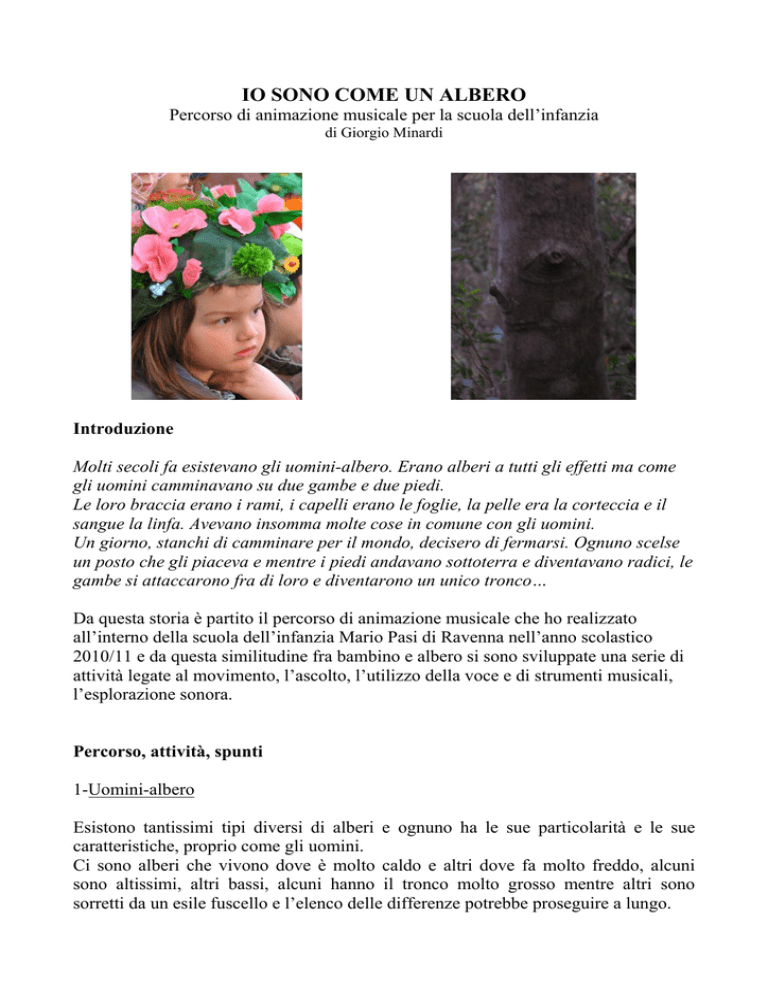 IO SONO COME UN ALBERO Percorso di animazione musicale per la scuola dell’infanzia di Giorgio Minardi Introduzione Molti secoli fa esistevano gli uomini-albero. Erano alberi a tutti gli effetti ma come gli uomini camminavano su due gambe e due piedi. Le loro braccia erano i rami, i capelli erano le foglie, la pelle era la corteccia e il sangue la linfa. Avevano insomma molte cose in comune con gli uomini. Un giorno, stanchi di camminare per il mondo, decisero di fermarsi. Ognuno scelse un posto che gli piaceva e mentre i piedi andavano sottoterra e diventavano radici, le gambe si attaccarono fra di loro e diventarono un unico tronco… Da questa storia è partito il percorso di animazione musicale che ho realizzato all’interno della scuola dell’infanzia Mario Pasi di Ravenna nell’anno scolastico 2010/11 e da questa similitudine fra bambino e albero si sono sviluppate una serie di attività legate al movimento, l’ascolto, l’utilizzo della voce e di strumenti musicali, l’esplorazione sonora. Percorso, attività, spunti 1-Uomini-albero Esistono tantissimi tipi diversi di alberi e ognuno ha le sue particolarità e le sue caratteristiche, proprio come gli uomini. Ci sono alberi che vivono dove è molto caldo e altri dove fa molto freddo, alcuni sono altissimi, altri bassi, alcuni hanno il tronco molto grosso mentre altri sono sorretti da un esile fuscello e l’elenco delle differenze potrebbe proseguire a lungo. Invitiamo i bambini a diventare uomini-albero, cioè alberi che camminano, che ad un segnale sonoro precedentemente concordato si dovranno fermare e assumere strane posizioni. Ad un altro segnale dovranno ripartire e camminare per la stanza. Ci sarà però un terzo segnale che indicherà il momento in cui gli uomini-albero decisero di fermarsi per sempre e stabilirsi in un luogo della terra. Arrivati a questo punto inizia la trasformazione degli uomini-albero in alberi veri e propri; i piedi vanno sottoterra e diventano radici, le gambe si uniscono e diventano il tronco, le braccia vanno a formare i rami. Si fa notare ai bambini quante siano le similitudini fra il loro corpo e la struttura dell’albero (senza naturalmente scendere in spiegazioni troppo scientifiche)1 : Piedi→ radici Gambe→ tronco Braccia→ rami Capelli→ foglie Pelle→ corteccia Sangue→ linfa D’altra parte esistono anche una serie di modi di dire che possono essere riferiti in qualche modo all’albero. Ad esempio: …stare con i piedi per terra, avere la testa fra le nuvole, essere rigido come un tronco, avere la chioma al vento. 1 Cfr. Guerra Lisi, Aristei, Martinelli, Continuità/2, Borla, Roma, 1992, p. 118 2- In su e in giù La struttura dell’albero è rivolta in due direzioni: alto e basso. Mentre le radici vanno sottoterra, i rami si spingono verso il cielo alla ricerca della luce. Questa bidirezionalità può facilmente essere collegata al suono (grave/acuto) e al movimento (alto/basso). Prendendo spunto da un gioco della Globalità dei linguaggi2 proviamo a dare una voce all’albero; sarà però una voce che cambia a seconda della parte da cui proviene. Utilizzando le cinque vocali si passa dal grave all’acuto con la voce, contemporaneamente il corpo accompagna i suoni con dei movimenti che vanno dal basso verso l’alto a simboleggiare le parti dell’albero. U: voce profonda, radici che vanno sottoterra, posizione accasciata O: pancia dell’albero, alzarsi in piedi e fare un cerchio (il tronco) con le braccia A: rami che si aprono, aprire le braccia E: prendere la spinta, braccia indietro come rami che si preparano a crescere I: salto verso l’alto, rami che vogliono andare più vicino possibile al sole. A questa attività può essere accostato un gioco motorio in cui invece è l’ascolto di una musica a guidare il corpo verso il basso o verso l’alto.3 3- Vita sull’albero Sull’albero vivono anche molti animali: uccelli, insetti, piccoli roditori,… Alcuni creano su di esso la propria tana, altri vi si arrampicano per trovare un rifugio o un ambiente fresco (scimmie, gatti,..). Porto ai bambini un sacco pieno di piccoli strumenti e giocattoli sonori. Alcuni hanno la forma di animale, altri no. Ci sono anche richiami per uccelli. 2 Cfr. Guerra Lisi S., Il metodo della globalità dei linguaggi, Borla, Roma, 1997, pp.160-161 Per questa attività può essere utilizzata la base n.9, Su e giù, contenuta in Spaccazocchi M., In movimento, Progetti sonori, Mercatello sul Metauro, 2006 3 Ogni bambino sceglie uno strumento che rappresenta un animale che vive sull’albero e si colloca nella stanza cercando di essere un po’ distante dagli altri. I bambini sono gli alberi, sopra ad ogni albero c’è un animale che sta dormendo. Un esploratore si addentra in questo bosco di alberi-bambini e ogni volta che tocca un albero sveglia l’animale che inizierà a far sentire la sua voce. Per rendere il gioco più coinvolgente si consiglia di mettere una musica di sottofondo che crei un clima di mistero. Dopo che l’esploratore ha sentito la voce di tutti gli animali, si cambiano gli strumenti e si nomina un nuovo esploratore. 4- Suonare l’albero L’albero può anche essere suonato: attraverso attività di esplorazione e manipolazione si possono scoprire le sonorità di tronchi, rami, cortecce e foglie. Sia portando all’interno della scuola questi materiali, sia passeggiando per il giardino come fossimo ricercatori di suoni (sempre utile avere con sé un registratore). Successivamente a questa attività di esplorazione, immaginando di seguire un percorso legato all’evoluzione dell’uomo si passa ad utilizzare i legnetti (claves); uno strumento ricavato dal legno dell’albero ma lavorato dall’uomo. Prendendo spunto da un’attività proposta da Spaccazocchi4 in uno dei suoi libri proponiamo un’attività musicale più strutturata e inseribile nella categoria dei giochi di regole: il concerto degli alberi. Una piccola storia per introdurre l’attività ai bambini: “C’e
