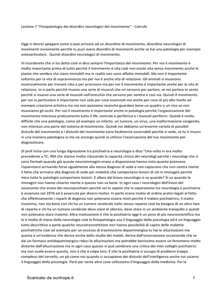 Lezione 7 "Fisiopatologia dei disordini neurologici del movimento" ‐ Cotrufo Oggi vi dovrei spiegare come si può arrivare ad un disordine di movimento, disordine neurologici di movimenti ovviamente perchè tu puoi avere disordini di movimenti anche se hai una patologia per esempio osteoarticolare. Quindi disordini neurologici di movimento. Vi ricorderete che vi ho detto cioè vi dico sempre l'importanza del movimento. Per noi il movimento è molto importante prima di tutto perchè il movimento è vita cioè non esiste vita senza movimento anche le piante che sembra che siano immobili ma in realtà non sono affatto immobili. Ma non è importante soltanto per la vita di sopravvivenza ma per noi è anche vita di relazione. Gli animali si muovono essenzialmente per trovare cibo e per procreare ma per noi il movimento è importante anche per la vita di relazione. Io vi parlo perchè muovo una serie di muscoli che mi servono per parlare, se voi parlare io sento perchè si muovo una serie di muscoli nell'orecchio che servono per sentire e così via. Quindi Il movimento per noi in particolare è importante non solo per cose essenziali ma anche per cose di più alto livello ad esempio creazione artistica ma noi non possiamo neanche guardare bene un quadro o un viso se non muoviamo gli occhi. Per noi il movimento è importante anche in patologia perchè l'organizzazione del movimento interessa praticamente tutto il SN, centrale e periferico e i muscoli periferici. Quindi è molto difficile che una patologia, come ad esempio un infarto, un tumore, un virus, una malformazione congenita, non interessi una parte del sistema di movimento. Quindi noi abbiamo un'enorme varietà di possibili disturbi del movimento e i disturbi del movimento sono facilmente osservabili perchè si vede, se tu ti muovi in una maniera patologica io me ne accorgo quindi io utilizzo l'osservazione del tuo movimento per diagnosticare. (Il prof inizia con una lunga digressione tra psichiatria e neurologia e dice:"Una volta in era molto precedente a TC, RM che stanno molto riducendo la capacità clinica dei neurologi perchè i neurologi che si sono formati quando già queste neuroimmagini erano a disposizione hanno visto quanto potevano risparmiarsi arrivando forse ugualmente alla stessa diagnosi di sede e non capiscono che non centra niente il fatto che arrivano alla diagnosi di sede per malattie che comportano lesioni di siti in immagini perchè mica tutte le patologie comportano lesioni. E allora dal bravo neurologo si va quando? Si va quando le immagini non hanno chiarito niente e questo non va bene. In ogni caso i neurologici dell'inizio del novecento che erano dei neuropsichiatri perchè voi lo sapete che la separazione tra neurologia e psichiatria è avvenuta nel 1976 ed è avvenuta per diversi motivi. In parte erano motivi di ordine pratici legati al fatto che effettivamente i reparti di degenza non potevano essere misti perchè il malato psichiatrico, il matto insomma, non sta bene con chi ha un tumore cerebrale nello stesso reparto cioè ha bisogno di un altro tipo di reparto e chi ha un tumore cerebrale deve stare al silenzio, deve stare in un ambiente tranquillo e quindi non potevano stare insieme. Altra motivazione è che la psichiatria oggi è un poco di più neuroscientifica ma lo è molto di meno della neurologia cioè la fisiopatologia usa il linguaggio della psicologia ed è un linguaggio tutto descrittivo a parte qualche neurotrasmettitore non hanno possibilità di capire delle malattie psichiatriche cioè ad esempio per un eccesso di trasmissione dopaminergica tu hai le allucinazioni ma questa è un'evidenza che deriva anche dallo studio dei malati, deriva dall'osservazione occasionale che se dai un farmaco antidopaminergico riduci le allucinazioni ma potrebbe benissimo essere un fenomeno molto distante dall'allucinazione ma in ogni caso questo vi può sembrare una critica dei miei colleghi psichiatrici ma non vuole essere questo, non è che è colpa loro. È che la psichiatria si occupa di problemi troppo complessi del cervello, un pò come noi quando ci occupiamo dei disturbi dell'intelligenza anche noi usiamo il linguaggio della psicologia. Però per tante altre cose utilizziamo il linguaggio della medicina. Poi la Scaricato da sunhope.it 1 divisione è anche un fatto culturale cioè proprio gli psichiatri intendevano essere un pò diversi dai neurologici. E poi perchè bisognava dare più cattedre. Però la cosa che io ci tengo che voi sappiate come la penso è che l'oggetto del nostro interesse è esattamente lo stesso non è che siano diversi così come posso diverso io nella mia preparazione professionale rispetto a un, non so, epatologo, siamo interessati esattamente allo stesso organo o sistema che è il cervello. Forse loro sono più interessati solo alla parte cerebrale rispetto a noi che siamo interessati anche al SNP, midollo spianle ecc. che non sono coinvolti nella follia ma comunque è esattamente lo stesso per cui è una separazione che però non ha senso che sia una frattura perchè i nostri interessi sono gli stessi anzi io penso che un giorno torneranno insieme. Allora questi neuropsichiatri dell'inizio del 1900 andavano in queste cliniche neuropsichiatriche che erano in genere separate dal resto degli ospedali e affacciandosi dal balcone iniziavano a fare diagnosi vedendo come si muovevano le persone che andavano a farsi vedere. Questo per dirvi quanto è importante l'osservazione del movimento per la diagnosi"). (il prof. riprende la lezione e inizia dalla prima diapositiva): Allora cominciamo da qualche vecchia informazione storica. Nel 1858 Jackson fece una prima osservazione condivisibile ancora oggi sul sistema motorio e cioè che il sistema motorio è un sistema gerarchico integrato. Gerarchico significa che c'è una parte che sta al di sopra e che comanda le parti sottostanti però nello stesso tempo integrato perchè ci sono feedback. E Jackson identificò l'importanza della cort