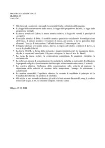 Tavola periodica degli elementi 0 IA 4,003 1 1,008 H 1 2 6,941 Li 3 3 22,99 Na 11 4 39,10 K 19 5 85,47 Rb 37 6 132,9 Cs 55 7 (223) Fr 87 II A Metalli Metalloidi Non metalli 9,012 Be 40,08 44,96 Ca Sc 21 87,62 88,91 Y Sr 38 39 137,3 Ba 138,9 La 57 (226) Ra 88 10,81 12,01 14,01 26,98 III A 20 56 VB 5 24,31 Mg IV B B 4 12 III B (227) Ac 89 Serie dei lantanidi Serie degli attinidi IV A VA 120 50,94 Ti 22 91,22 Zr 40 178,5 Hf 72 (257) Rf 104 V 23 92,91 41 Nb 180,9 Ta 73 (260) Db 105 140,1 Ce 58 232,0 Th 90 VI A 52,00 Cr 24 95,94 Mo 42 183,9 W 74 (263) Sg 106 140,9 Pr 59 (231) Pa 91 VII A 54,94 Mn 25 (98) Tc 43 186,2 Re 75 (262) Bh 107 144,2 Nd 60 (238) U 92 VIII 55,85 Fe 26 101,1 Ru 44 190,2 Os 76 (265) Hs 108 (147) Pm 61 (237) Np 93 58,47 Co 27 102,9 Rh 45 192,2 Ir 77 IB 58,69 Ni 28 106,4 Pd 46 195,1 Pt 78 63,55 Cu 29 107,9 Ag 47 197,0 Au 79 II B 65,39 Zn 30 112,4 Cd 48 200,5 Hg 80 Al 13 69,72 Ga 31 114,8 In 49 204,4 Tl 81 C 6 28,09 Si 14 72,59 Ge 32 118,7 Sn 50 207,2 Pb 82 N 7 30,97 P 15 74,92 As 33 121,8 Sb 51 209,0 Bi 83 VI B VII B 16 19,00 O 8 32,07 S 16 78,96 Se F 9 35,45 Cl 17 79,90 Br 34 35 127,6 126,9 Te 52 (210) Po 84 I 53 (210) At 85 He 2 20,18 Ne 10 39,95 Ar 18 83,80 Kr 36 131,3 Xe 54 (222) Rn 86 (266) Mt 109 150,4 Sm 62 (242) Pu 94 152,0 Eu 63 (243) Am 95 157,3 Gd 64 (247) Cm 96 158,9 Tb 65 (247) Bk 97 162,5 Dy 66 (249) Cf 98 164,9 Ho 67 (254) Es 99 167,3 68 Er (253) Fm 100 168,9 Tm 69 (256) Md 101 173,0 Yb 70 (254) No 102 175,0 Lu 71 (257) Lr 103 Classificazione periodica degli elementi chimici conosciuti. Proposta originariamente nel 1869 da Dmitrij I. Mendeleev, il quale sviluppò l’intuizione che le proprietà degli elementi fossero funzione periodica del loro peso atomico, questa tavola è stata più volte aggiornata nel corso degli anni, via via che si sono scoperti nuovi elementi. Il peso atomico di un atomo è indicato nella tabella dal numero di massa, riportato sopra il simbolo di ciascun elemento chimico (il numero di massa è dato dal numero di protoni e neutroni contenuti nel nucleo dell’atomo). Tale numero di massa in questa tabella non è un intero per il fatto che si è tenuto conto dell’abbondanza in natura degli isotopi dei vari elementi (che singolarmente sono caratterizzati da un numero di massa intero): si presenta pertanto il valore medio ponderato. Il numero di massa coincide con il “peso” atomico (più precisamente: con la massa atomica), espresso in UMA (unità di massa atomica). Il numero in basso a sinistra di ciascun simbolo di elemento chimico è il numero atomico, pari al numero di protoni presenti nel nucleo di quell’elemento.