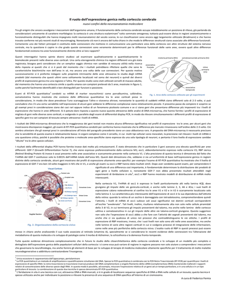 Il ruolo dell’espressione genica nella corteccia cerebrale nuovi confini della neuroanatomia molecolare Tra gli enigmi che ancora avvolgono i meccanismi dell’organismo umano, il funzionamento della corteccia cerebrale occupa indubbiamente un posizione di rilievo, già partendo da considerazioni unicamente di carattere morfologico: la corteccia è una struttura esalaminare1 tutto sommato omogenea; tuttavia può essere divisa in regioni anatomicamente e funzionalmente distinguibili che hanno impegnato molti neuroanatomici del secolo scorso, le cui classificazioni sono ancora oggi largamente utilizzate (Brodmann) e che hanno trovato conferme nei più recenti studi di neuroimaging. Nonostante ciò non è ancora del tutto chiaro in che modo le differenze strutturali siano associate alle differenze funzionali. Certamente uno dei fattori principali è costituito dalle connessioni che mettono in comunicazione una particolare area della corteccia con altre strutture del sistema nervoso centrale, ma la questione è capire in che grado queste connessioni sono veramente determinanti per le differenze funzionali delle varie aree, ovvero quali altre differenze fondamentali esistono tra aree funzionalmente distinte oltre ai loro rapporti? Questi interrogativi hanno spinto diversi studiosi ad esaminare qualitativamente e quantitativamente le biomolecole presenti nelle diverse aree corticali. Una certa eterogeneità chimica tra regioni differenti era già stata registrata; bisogna però considerare che un semplice saggio chimico non sarebbe di nessuna utilità nella ricerca della risposta ai quesiti che ci si è posti dal momento che i risultati potrebbero riflettere quelle che sono le caratteristiche biochimiche non dell’area in sé, ma ancora una volta delle sue connessioni. Per questo motivo successivamente si è preferito indagare sulle proprietà intrinseche delle aree attraverso lo studio degli mRNA prodotti (dal momento che questi ultimi sono solitamente localizzati nel soma dei neuroni) e quindi dei diversi profili di espressione genica tra una regione e l’altra. Per questo studio sono stati utilizzati cervelli di macaco adulto, dal momento che hanno una corteccia simile a quella umana con campioni prelevati da 5 aree, mostrate in figura 1, scelte perché facilmente identificabili e ben distinguibili per funzioni e posizione. Esami di RT-PCR quantitativa 2 condotti su mRNA di marker neurochimici come parvalbumina, calbindina, Fig. 1. Aree della corteccia utilizzate per gli esperimenti somatostatina hanno mostrato che esistono delle differenze quantitative tra le aree corticali prese in considerazione, in modo che dove prevalesse l’uno scarseggiasse l’altro e viceversa altrove; nonostante le quantità di suddetti mRNA siano differenti solo di 2-3 volte, si può concludere che c’è una certa variabilità nell’espressione di alcuni geni sebbene le differenze complessive siano relativamente piccole. Il prossimo passo da compiere è scoprire se gli esempi presi in considerazione siano dei casi rari oppure indice di un fenomeno piuttosto comune e se ci siano geni che presentano differenze più imponenti tra i livelli di espressione che hanno in aree differenti. Si è potuto dare risposta a questo nuovo quesito attraverso delle analisi di DNA-microarray, che hanno fornito i profili di espressione di migliaia di geni nelle diverse zone corticali, e svolgendo in parallelo degli esami di differential display PCR, in modo da rilevare simultaneamente i differenti profili di espressione di specifici geni tra vari campioni di tessuto sempre attraverso i livelli di mRNA. I risultati dei DNA-microarray dimostrano che la maggioranza dei geni testati non mostra alcuna differenza significativa nei profili di espressione tra le aree; per alcuni geni che mostravano discrepanze maggiori, gli esami di RT-PCR quantitativa condotti per conferma hanno mostrato che le differenze più marcate rimanevano nell’ordine delle 2-3 volte. Ciò sembra attestare che gli esempi presi in considerazione all’inizio del paragrafo precedente siano un caso abbastanza raro. A proposito del DNA-microarray è necessario precisare che la sensibilità di questo esame è relativamente bassa: in organi complessi come il cervello, in cui molti tipi cellulari sono mescolati, la precisione nel rilevare i livelli di mRNA è una questione critica, poiché è possibile che proteine o molecole area-specifiche siano espresse da una sola tipologia di neuroni, e pertanto il loro livello di espressione sarebbe “diluito” tra le altre specie cellulari. I risultati della differential display PCR hanno fornito invece dati molto più entusiasmanti. È stato dimostrato che in particolare 3 geni avevano una elevata specificità per aree differenti: GDF-7 (Growth Differentiation Factor 7), che viene espresso preferenzialmente dalla corteccia M1; occ1, abbondantemente espresso nella corteccia V1; RBP sierica (Retinol Binding Protein 4) invece è assai presente nelle aree associative e scarsamente presente nella corteccia V1. L’alta precisione di questa tecnica è dimostrata dal fatto che l’mRNA del GDF-7 costituisce solo lo 0.001% dell’mRNA totale dell’area M1. Questi dati dimostrano che, sebbene ci sia un’uniformità di base nell’espressione genica in regioni distinte della corteccia cerebrale, alcuni geni mostrano dei profili di espressione altamente area-specifici: per esempio l’esame di RT-PCR quantitativa ha mostrato che il livello di espressione di GDF-7 era ben 10 volte maggiore in M1 che in V1, e anche gli esami su occ1 e RBP hanno dato risultati simili. Dopo aver condotto questi esami, per comprendere il significato di una differenza così importante, è fondamentale determinare la distribuzione dei prodotti di ogni gene a livello cellulare e, nonostante GDF-7 non abbia presentato risultati attendibili negli esperimenti di ibridazione in situ3, occ1 e RBP hanno mostrato modelli di distribuzione di mRNA molto interessant