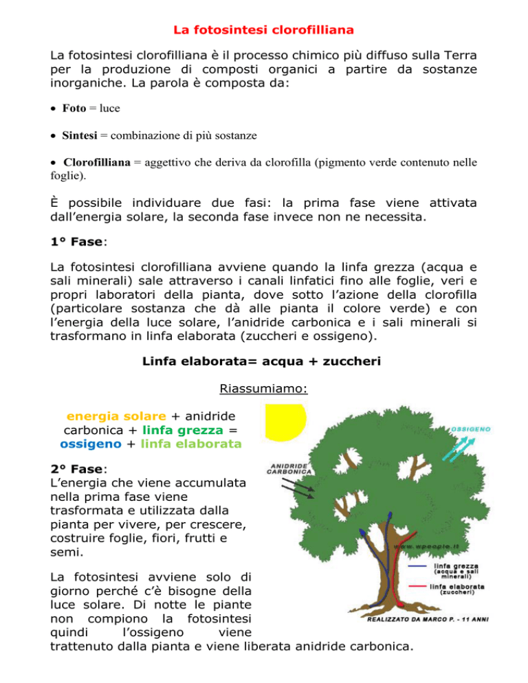 La fotosintesi clorofilliana La fotosintesi clorofilliana è il processo chimico più diffuso sulla Terra per la produzione di composti organici a partire da sostanze inorganiche. La parola è composta da: Foto = luce Sintesi = combinazione di più sostanze Clorofilliana = aggettivo che deriva da clorofilla (pigmento verde contenuto nelle foglie). È possibile individuare due fasi: la prima fase viene attivata dall’energia solare, la seconda fase invece non ne necessita. 1° Fase: La fotosintesi clorofilliana avviene quando la linfa grezza (acqua e sali minerali) sale attraverso i canali linfatici fino alle foglie, veri e propri laboratori della pianta, dove sotto l’azione della clorofilla (particolare sostanza che dà alle pianta il colore verde) e con l’energia della luce solare, l’anidride carbonica e i sali minerali si trasformano in linfa elaborata (zuccheri e ossigeno). Linfa elaborata= acqua + zuccheri Riassumiamo: energia solare + anidride carbonica + linfa grezza = ossigeno + linfa elaborata 2° Fase: L’energia che viene accumulata nella prima fase viene trasformata e utilizzata dalla pianta per vivere, per crescere, costruire foglie, fiori, frutti e semi. La fotosintesi avviene solo di giorno perché c’è bisogne della luce solare. Di notte le piante non compiono la fotosintesi quindi l’ossigeno viene trattenuto dalla pianta e viene liberata anidride carbonica. I fiori permettono alla pianta di riprodursi, dal fiore si formano i frutti e da questi i semi che daranno origine a nuove piante. Le foglie più esterne (sepali) formano il calice che protegge il fiore quando non è ancora sbocciato. Le foglie colorate (i petali) insieme formano la corolla. Qui si trovano gli organi della riproduzione. Gli stami, filamenti che finiscono con cime gialle rigonfie, sono gli organi maschili. La parte superiore degli stami è ricoperta da una polverina gialla: polline. Al centro del fiore si trova il pistillo, l’organo femminile, una specie di sacchetto rigonfio detto ovario dove si trovano gli ovuli. Per venerdì 18: sci studiare il fiore sul quaderno