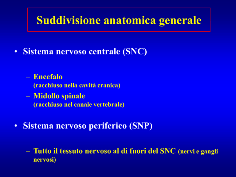 Suddivisione anatomica generale • Sistema nervoso centrale (SNC) – Encefalo (racchiuso nella cavità cranica) – Midollo spinale (racchiuso nel canale vertebrale) • Sistema nervoso periferico (SNP) – Tutto il tessuto nervoso al di fuori del SNC (nervi e gangli nervosi) Suddivisione funzionale • Sistema nervoso somatico (centrale e periferico) per il controllo delle attività volontarie •Sistema nervoso autonomo per il controllo delle attività che non sono sotto il diretto controllo della volontà (cuore, muscolatura intestinale, secrezione ghiandolare) Il sistema nervoso • Fornisce informazioni sensoriali sull’ambiente interno ed esterno • Integra le informazioni sensoriali • Coordina le attività volontarie e involontarie • Regola e controlla le strutture e gli apparati periferici • E’ sede della cognizione, delle emozioni, della memoria TESSUTO NERVOSO • È costituito da: • Cellule nervose o neuroni (100 miliardi nel cervello) – Ricevono, elaborano ed integrano informazioni =eccitabilità – Rispondono conducendo e trasmettendo impulsi nervosi =conducibilità – Sono cellule secernenti (messaggeri chimici) – Sono cellule perenni (non si dividono, i danni cerebrali sono irreversibili) • Cellule gliali o nevroglia (10 volte più numerose dei neuroni) • -non ricevono né trasmettono impulsi • -sostengono e nutrono i neuroni • -sono capaci di dividersi Struttura generale del neurone Dendriti Nucleo Corpo cellulare o pirenoforo o soma Sinapsi Assone TIPI DI NEURONI TESSUTO NERVOSO Ganglio sensitivo Neurone pseudounipolare TESSUTO NERVOSO TESSUTO NERVOSO Neuroni multipolari motori TESSUTO NERVOSO Nucleo poco colorabile TESSUTO NERVOSO Corteccia cerebrale TESSUTO NERVOSO Cellule piramidali TESSUTO NERVOSO TESSUTO NERVOSO Cellule del Purkìnje del cervelletto Struttura generale del neurone Dendriti Corpo cellulare (pirenoforo) TESSUTO NERVOSO Assone Corpo cellulare o pirenoforo o soma • Morfologia variabile (5-150 µm): – Stellata (motoneuroni) – Piramidale (corteccia cerebrale) – Piriforme (Purkìnje del cervelletto) – Sferica (gangli sensitivi) • Nucleo: – Voluminoso, sferico od ovoidale, centrale – chiaro (vuoto, vescicoloso), corrispondente alla presenza di eucromatina – Nucleolo unico, voluminoso ed intensamente basofilo sede di elevata attività di sintesi ribosomiale PIRENOFORO: citoplasma • Mitocondri numerosi (anche nei prolungamenti) • Apparato di Golgi ben sviluppato • Sostanza di Nissl: zolle basofile che si estendono ai dendriti (ma non all’assone)= reticolo endoplasmatico rugoso e molti ribosomi liberi • Microtubuli, neurofibrille (aggregati di neurofilamenti di 10 nm) (supporto meccanico, proprietà contrattili) e microfilamenti Il neurone ha una elevata attività metabolica Sostanza tigroide o sostanza di Nissl Nuclei di cellule gliali TESSUTO NERVOSO Dendrite monticolo assonico Citoplasma di un neurone TESSUTO NERVOSO TESSUTO NERVOSO Cellula di glia TESSUTO NERVOSO TESSUTO NERVOSO Citoscheletro Impregnazione argentica Dendriti TESSUTO NERVOSO • Sono espansioni del corpo cellulare • In genere multipli • Relativamente più brevi dell’assone (max 700 mm) • Si ramificano ripetutamente rimanendo nelle vicinanze del pirenoforo • Contengono tutti gli organuli (tranne Golgi e nucleo) • Sono funzionalmente e morfologicamente espansioni del corpo cellulare • Generalmente ricevono gli Presentano protrusioni citoplasmatiche stimoli tramite sinapsi chiamate spine (vedi successiva) TESSUTO NERVOSO spine Sono estroflessioni del plasmalemma sedi di contatti sinaptici con altri neuroni bottoni terminali TESSUTO NERVOSO Spine dendritiche Figura Figura16.22 16.22 B, a maggior ingrandimento, porzione di dendrite. Actina in verde, microtubuli, in rosso (barra, 5 mm). TESSUTO NERVOSO A, neurone in coltura in cui la actina g è fluorescente. I puntini fluorescenti sui dendriti sono le spine dendritiche in cui si accumula actina (barra, 15 mm). Assone • Presente in tutti i neuroni • Di solito unico, spessore da 0,1 a 20 µm • Origina da una protrusione del soma detta cono di emergenza • Di solito non emette rami collaterali in vicinanza del pirenoforo… • … ma si divide ripetutamente nel cosiddetto territorio di innervazione (distalmente) Cono di emergenza (CE) dell’assone TESSUTO NERVOSO CE PROPRIETA’ DELL’ASSONE DANNI CEREBRALI • Se è leso il corpo cellulare la cellula muore DANNO IRREVERSIBILE • Se è lesa la parte terminale dell’assone, questo può essere ricostruito RECUPERO FUNZIONALE (solo nel SNP) TESSUTO NERVOSO I neuroni sono cellule perenni • Tuttavia si è scoperto che c’è una continua nascita di neuroni (circa 1400 al giorno) in una area definita del cervello. Si tratta dell’ippocampo, area destinata alla memorizzazione. Cell. 2013 Jun 6;153(6):1219-1227. Dynamics of hippocampal neurogenesis in adult humans. Spalding KL, Bergmann O, Alkass K, Bernard S, Salehpour M, Huttner HB, Boström E, Westerlund I, Vial C, Buchholz BA, Possnert G, Mash DC, Druid H,Frisén J. Department of Cell and Molecular Biology, Karolinska Institutet, 171 77 Stockholm, Sweden. Abstract • Adult-born hippocampal neurons are important for cognitive plasticity in rodents. There is evidence for hippocampal neurogenesis in adult humans, although whether its extent is sufficient to have functional significance has been questioned. We have assessed the generation of hippocampal cells in humans by measuring the concentration of nuclear-bomb-test-derived (14)C in genomic DNA, and we present an integrated model of the cell turnover dynamics. We found that a large subpopulation of hippocampal neurons constituting one-third of the neurons is subject to exchange. In adult humans, 700 new neurons are added in each hippocampus per day, corresponding to an annual turnover of 1.75% of the neurons within the renewing fraction, with a modest decline during aging. We conclude that neurons are generated through