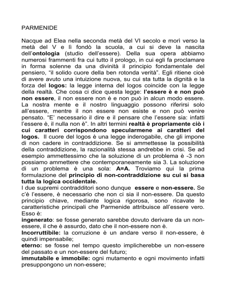 PARMENIDE Nacque ad Elea nella seconda metà del VI secolo e morì verso la metà del V e lì fondò la scuola, a cui si deve la nascita dell’ontologia (studio dell’essere). Della sua opera abbiamo numerosi frammenti fra cui tutto il prologo, in cui egli fa proclamare in forma solenne da una divinità il principio fondamentale del pensiero, “il solido cuore della ben rotonda verità”. Egli ritiene cioè di avere avuto una intuizione nuova, su cui sta tutta la dignità e la forza del logos: la legge interna del logos coincide con la legge della realtà. Che cosa ci dice questa legge: l’essere è e non può non essere, il non essere non è e non può in alcun modo essere. La nostra mente e il nostro linguaggio possono riferirsi solo all’essere, mentre il non essere non esiste e non può venire pensato. “E’ necessario il dire e il pensare che l’essere sia: infatti l’essere è, il nulla non è”. In altri termini realtà è propriamente ciò i cui caratteri corrispondono specularmene ai caratteri del logos. Il cuore del logos è una legge inderogabile, che gli impone di non cadere in contraddizione. Se si ammettesse la possibilità della contraddizione, la razionalità stessa andrebbe in crisi. Se ad esempio ammettessimo che la soluzione di un problema è -3 non possiamo ammettere che contemporaneamente sia 3. La soluzione di un problema è una sola: A=A. Troviamo qui la prima formulazione del principio di non-contraddizione su cui si basa tutta la logica occidentale. I due supremi contradditori sono dunque essere e non-essere. Se c’è l’essere, è necessario che non ci sia il non-essere. Da questo principio chiave, mediante logica rigorosa, sono ricavate le caratteristiche principali che Parmenide attribuisce all’essere vero. Esso è: ingenerato: se fosse generato sarebbe dovuto derivare da un nonessere, il che è assurdo, dato che il non-essere non è. Incorruttibile: la corruzione è un andare verso il non-essere, è quindi impensabile; eterno: se fosse nel tempo questo implicherebbe un non-essere del passato e un non-essere del futuro; immutabile e immobile: ogni mutamento e ogni movimento infatti presuppongono un non-essere; unico: se ve ne fosse un altro sarebbe qualcosa di diverso da lui, perciò un non-essere; omogeneo: se fosse in sé differenziato presupporrebbe degli intervalli di non-essere. Ma allora, come deve essere considerato il mondo che noi vediamo, che sperimentiamo come mutevole, corruttibile? Parmenide, con ferrea consequenzialità risponde che esso risulta, filosoficamente parlando, pura illusione, pura apparenza. Il problema che Parmenide pone alla filosofia successiva sarà quello di salvare i fenomeni, di rendere compatibili le esigenze del logos con quelle dei sensi, dell’essere assoluto e immobile con l’essere in divenire. Certo non si potrà fare a meno di confrontarsi col “maestro venerando e terribile” (Platone). Sulle conseguenze del logos parmenideo si esercità con grande abilità ZENONE di Elea: egli intende mostrare la contraddittorietà di chi pretende che la realtà del divenire abbia una sua consistenza, usando il procedimento della dimostrazione per assurdo, che parte dall’affermazione dei suoi oppositori per poi mostrare la contraddizione fra gli elementi che la costituiscono. Tale metodo è stato chiamato anche dialettico, termine che talora sarà usato per designare la filosofia come tale. DOMANDE Qual è il concetto fondamentale di Parmenide? Quali sono le caratteristiche dell’essere parmenideo? Cosa dice il principio di identità? Cosa dice il principio di non contraddizione? Cosa significa ontologia?