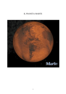 CARTA D’IDENTITA’ DEL PIANETA NOME DEL PIANETA COM’E’ DOVE SI TROVA MARTE Il nome del pianeta Marte, secondo gli scienziati, ha due origini: deve il suo nome al dio Marte della guerra o al nome “marziani”. Il suolo di Marte è ricco di ossidi di ferro, che gli danno il caratteristico colore rosso. Ciò che manca è l’ acqua, essa non è presente allo stato liquido sul pianeta, ma solo in forma di ghiaccio. Sulla superficie marziana abbondano i canali, questo fa pensare che l’ acqua sia davvero esistita in passato. La superficie di Marte è ricoperta da dune di sabbia arancione, punteggiata di pietre e massi. Forti tempeste,che durano diverse settimane, spostano enormi masse di polvere. E’ il quarto pianeta del Sistema Solare si trova ad una distanza di 228 milioni di km. QUANTO E’ GRANDE Marte è uno dei pianeti più piccoli del Sistema Solare: il suo diametro misura 6840 km(poco più di metà di quello terrestre). ATMOSFERA L’ atmosfera marziana è sottile, essa è composta da anidride carbonica, con tracce d’ azoto e pochissimo ossigeno: quindi non è respirabile. Il cielo di Marte non è azzurro, ma rossastro,infatti nell’ atmosfera è sospesa una polvere contenente ossidi di ferro. La temperatura su Marte varia di 14 gradi sotto zero durante l’ estate marziana, a meno TEMPERATURA 120 gradi in inverno, con una media di 40 gradi sotto zero. LE LUNE NOTIZIE E CURIOSITA’ Marte possiede due satelliti piuttosto piccoli e di forma irregolare: Terrore e Paura. Essi ruotano intorno a Marte rivolgendo al pianeta sempre la stessa faccia, impiegano lo stesso tempo a compiere una rotazione ed una rivoluzione. Questo fenomeno è molto comune tra i satelliti del Sistema Solare. Esso percorre la sua orbita in 687 giorni terrestri, ruota attorno al proprio asse in 24 ore e 37 minuti: il giorno marziano ha la stessa durata del nostro. Il pianeta ha un ciclo stagionale come il nostro. Le condizioni ambientali su Marte sono quelle più simili alle nostre in tutto il Sistema Solare. Si pensa che i canali fossero dei fiumi e le macchie fossero zone ricoperte di vegetazione. In realtà oggi sappiamo che le macchie sono depositi di sabbia, spostati da fortissimi venti, che soffiano sul pianeta.La collina, che erosa dai venti ha la forma di un viso umano è stata a lungo considerata la prova dell’ esistenza degli extraterrestri. Su un pezzo di roccia proveniente da Marte, in Antartide sono state trovate le tracce fossili di un organismo simile ad un batterio. L’ organismo sembra avere un’ età di 3.6 miliardi di anni, potrebbe indicare che in passato qualche forma di vita potrebbe essere esistita in passato su Marte. Il pianeta è l’ unico in tutto il Sistema Solare che possa essere colonizzato dall’ uomo. Marte è formato da grandi pianure coperte di rocce e terreno, da 3 grossi vulcani, il più alto dei quali è il triplo dell’ Everest. Col passare del tempo il Sole dovrebbe aumentare la sua luminosità e il suo calore. I ghiacciai di Marte inizieranno a sciogliersi, l’ acqua ritornerà sul pianeta. Probabilmente i terrestri dovranno trasferirsi la’ perché il nostro pianeta, a causa del surriscaldamento del Sole, sarà diventato un posto caldissimo e invivibile.