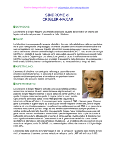 GLI ITTERI METABOLISMO DELLA BILIRUBINA E CLASSIFICAZIONE DEGLI ITTERI Fisiologia METABOLISMO DELLA BILIRUBINA La bilirubina proviene dal catabolismo dell’eme (porzione attiva dell’emoglobina e di numerosi enzimi). In condizioni fisiologiche, si ha nell’adulto la produzione di 250-350 mg/24 h di bilirubina - bilirubina prodotta giornalmente quota emocateretica (70-75%) - quota eritropoietica (6-8%) early labeled bilirubin - quota epatica (20-25%) 1. La bilirubina non coniugata in circolo La bilirubina non coniugata con acido glicuronico è la quota libera o non coniugata della bilirubina circolante e ne costituisce la massima parte. La concentrazione fisiologica della bilirubina totale circolante è 0,2 - 1,0 mg/dl Nel sangue la bilirubina è legata all’albumina, con legame non covalente, ma stabile che impedisce che la bilirubina non coniugata, liposolubile passi nei tessuti 2. Captazione epatocitaria della bilirubina Al polo sinusoidale dell’epatocita la bilirubina, liberata dall’albumina, viene captata; viene quindi trasportata al reticolo endoplasmatico, dove viene coniugata con acido glicuronico. 3. Glicuronoconiugazione E’ una reazione catalizzata dalla bilirubin-uridin-difosfato-glicuroniltransferasi (B-UGT) La bilirubina coniugata è idrosolubile, escreta in parte con le urine La bilirubinuria indica la presenza di una patologia a carico del parenchima epatico o delle vie biliari, dal momento che è provocata da un ritorno in circolo di bilirubina coniugata dall’epatocita. Catabolismo La bilirubina coniugata, escreta nella bile, raggiunge immodificata l’ileo terminale e il colon. Qui essa viene metabolizzata da enzimi della flora batterica intestinale, a formare i bilinogeni , che sono in parte eliminati con le feci . Solo l’1-4 % raggiunge il circolo sistemico e viene eliminata dal rene. GLI ITTERI Ittero è la colorazione giallastra della cute e delle mucosa dovuta a concentrazioni di bilirubina superiori a 1,5-2 mg/dl. Classicamente si distingue tra ittero e subittero: questo termine indica la colorazione giallastra delle sclere e della mucosa sottolinguale che si ha quando la bilirubinemia è compresa tra 1,5-2 e 5-6 mg/dl. CLASSIFICAZIONE PATOGENETICA DEGLI ITTERI - I ________________________________________________________________________ COMPORTAMENTO DI: PATOGENESI Bil NC Bil C biline colal trans e Bil U fecali _________________________________________________________________________ Aumento della bilirubina eritropoietica Anemie emolitiche congenite e acquisite Anemie refrattarie Porfiria congenita eritropoietica Iperbilirubinemia primitiva da shunt + + + + = = = = Aumento della bilirubina emocateretica Anemie emolitiche congenite e acquisite Infarti polmonari, grossi ematomi, ecc. +,++ + = = + = + + +,++ + = = = = = = = = = = = = Bil NC: conc. sierica della bilirubina non coniugata; Bil C: conc. sierica della bilirubina coniugata; Bil U: bilirubinuria; colal.: colalemia; trans.: livello sierico delle transaminasi CLASSIFICAZIONE PATOGENETICA DEGLI ITTERI - I COMPORTAMENTO DI: PATOGENESI biline colal trans e Bil U fecali _________________________________________________________________________ Difetti epatocitari di captazione, trasporto e coniugazione della bilirubina Ittero fisiologico dei neonati e ittero dei prematuri Ittero da latte materno Sindrome di Lucey-Driscoll Sindrome di Gilbert Sindromi di Crigler-Najjar tipo I e II Itteri epatocellulari Difetti epatocitari di escrezione della bilirubina coniugata Sindrome di Dubin-Johnson Sindrome di Rotor Itteri epatocellulari Bil NC +,++ +,++ ++ + ++ +,++ + + +,++ Bil C = = = = = +,++ =,= + +,++ +,++ +,++ = = = = = = = = + = = + = = = = = ++ = = ++ Bil NC: conc. sierica della bilirubina non coniugata; Bil C: conc. sierica della bilirubina coniugata; Bil U: bilirubinuria; colal.: colalemia; trans.: livello sierico delle transaminasi CLASSIFICAZIONE PATOGENETICA DEGLI ITTERI - II COMPORTAMENTO DI: PATOGENESI Bil NC Bil C biline e Bil U colal fecali trans Colestasi intraepatica Sindromi colestatiche su base genetica senza danno epatocellulare rilevante (colestasi intraepatica ricorrente benigna e altre) Colestasi gravidica Sindromi colestatiche su base genetica con danno epatocellulare (colestasi intraepatica progressiva familiare e altre) Colestasi “pura” da farmaci Epatiti virali e iatrogene a impronta colestatica Cirrosi biliare primitiva Cirrosi epatiche (virali, etiliche, ecc.) a impronta colestatica Colangiti Neoplasie delle vie biliari intraepatiche Compressioni ab estrinseco (epatomi, cisti,ecc) + + (-) (+) + = + + +,++ + ++ +,++ ++ +,++ +,++ + + +,++ + + + +,++ +,++ (+) +,++ (+) (-) +,++ + +,++ (+) - ++ ++ ++ + (-) (+) + +,++ +,++ + + + = + CLASSIFICAZIONE PATOGENETICA DEGLI ITTERI - II COMPORTAMENTO DI: PATOGENESI Bil NC Bil C biline e Bil U colal fecali trans Colestasi extraepatica Calcolosi del coledoco Pancreatiti croniche Neoplasie stenosanti delle vie biliari extraepatiche Compressioni ab extrinseco + + ++ + (-) (-) + + (+) = + + ++ ++ (-) = + + (+) (+) DIAGNOSI DIFFERENZIALE DEGLI ITTERI Dati anamnestici: - familiari: diagnosi di (o segni e sintomi suggestivi per ) - sindromi emolitiche - sindromi dismetaboliche epatiche ereditarie (o sistemiche con possibile patologia epatica) - sindromi colestatiche ereditarie - personali: - trasfusioni contatto con persone sicuramente o possibilmente infette viaggi in paesi “a rischio” assunzione di farmaci o di altre sostanze che possono indurre una epatopatia - esposizione a sostanze potenzialmente epatotossiche (es.sul lavoro) Segni obiettivi Cute e mucose - segni di grattamento - piccoli angiomi, spider naevi ed eritema palmare, tipici della cirrosi, per le alterazioni ormonali ad essa secondarie - petecchie e/o di ematomi, per le alterazioni dei processi di coagulazione e di lisi che si verificano in corso di cirrosi - tonalità dell’ittero Fegato - dimensioni - consistenza - caratteristiche della superficie - caratteristiche del margine