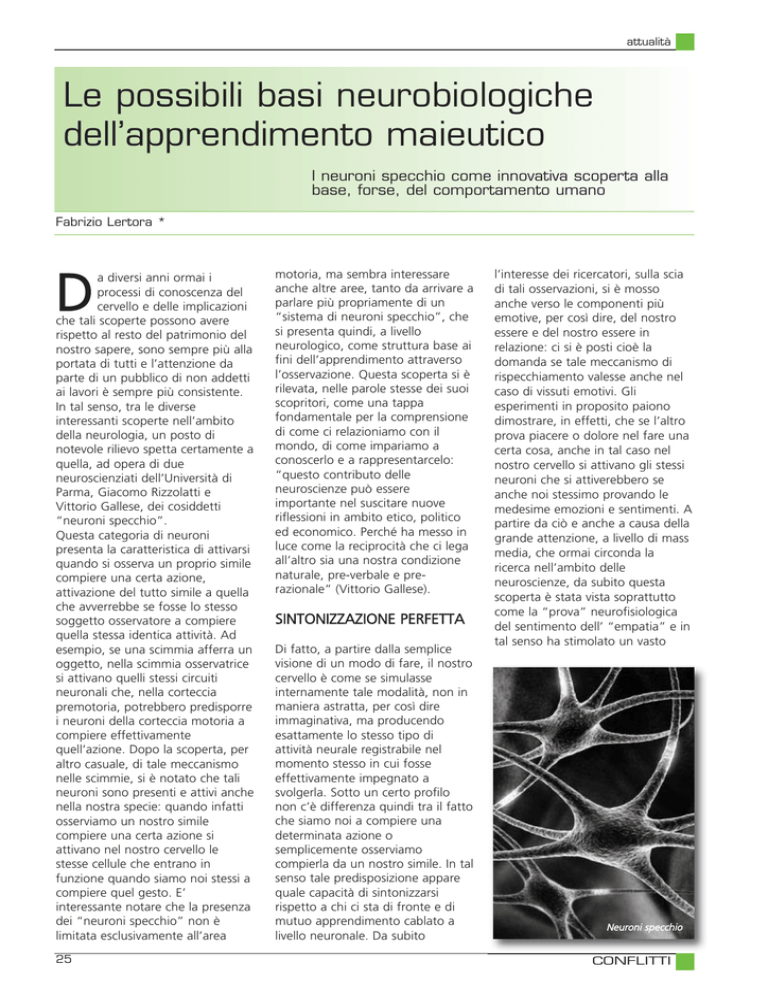 attualità Le possibili basi neurobiologiche dell’apprendimento maieutico I neuroni specchio come innovativa scoperta alla base, forse, del comportamento umano Fabrizio Lertora * D a diversi anni ormai i processi di conoscenza del cervello e delle implicazioni che tali scoperte possono avere rispetto al resto del patrimonio del nostro sapere, sono sempre più alla portata di tutti e l’attenzione da parte di un pubblico di non addetti ai lavori è sempre più consistente. In tal senso, tra le diverse interessanti scoperte nell’ambito della neurologia, un posto di notevole rilievo spetta certamente a quella, ad opera di due neuroscienziati dell’Università di Parma, Giacomo Rizzolatti e Vittorio Gallese, dei cosiddetti “neuroni specchio”. Questa categoria di neuroni presenta la caratteristica di attivarsi quando si osserva un proprio simile compiere una certa azione, attivazione del tutto simile a quella che avverrebbe se fosse lo stesso soggetto osservatore a compiere quella stessa identica attività. Ad esempio, se una scimmia afferra un oggetto, nella scimmia osservatrice si attivano quelli stessi circuiti neuronali che, nella corteccia premotoria, potrebbero predisporre i neuroni della corteccia motoria a compiere effettivamente quell’azione. Dopo la scoperta, per altro casuale, di tale meccanismo nelle scimmie, si è notato che tali neuroni sono presenti e attivi anche nella nostra specie: quando infatti osserviamo un nostro simile compiere una certa azione si attivano nel nostro cervello le stesse cellule che entrano in funzione quando siamo noi stessi a compiere quel gesto. E’ interessante notare che la presenza dei “neuroni specchio” non è limitata esclusivamente all’area 25 motoria, ma sembra interessare anche altre aree, tanto da arrivare a parlare più propriamente di un “sistema di neuroni specchio”, che si presenta quindi, a livello neurologico, come struttura base ai fini dell’apprendimento attraverso l’osservazione. Questa scoperta si è rilevata, nelle parole stesse dei suoi scopritori, come una tappa fondamentale per la comprensione di come ci relazioniamo con il mondo, di come impariamo a conoscerlo e a rappresentarcelo: “questo contributo delle neuroscienze può essere importante nel suscitare nuove riflessioni in ambito etico, politico ed economico. Perché ha messo in luce come la reciprocità che ci lega all’altro sia una nostra condizione naturale, pre-verbale e prerazionale” (Vittorio Gallese). SINTONIZZAZIONE PERFETTA Di fatto, a partire dalla semplice visione di un modo di fare, il nostro cervello è come se simulasse internamente tale modalità, non in maniera astratta, per così dire immaginativa, ma producendo esattamente lo stesso tipo di attività neurale registrabile nel momento stesso in cui fosse effettivamente impegnato a svolgerla. Sotto un certo profilo non c’è differenza quindi tra il fatto che siamo noi a compiere una determinata azione o semplicemente osserviamo compierla da un nostro simile. In tal senso tale predisposizione appare quale capacità di sintonizzarsi rispetto a chi ci sta di fronte e di mutuo apprendimento cablato a livello neuronale. Da subito l’interesse dei ricercatori, sulla scia di tali osservazioni, si è mosso anche verso le componenti più emotive, per così dire, del nostro essere e del nostro essere in relazione: ci si è posti cioè la domanda se tale meccanismo di rispecchiamento valesse anche nel caso di vissuti emotivi. Gli esperimenti in proposito paiono dimostrare, in effetti, che se l’altro prova piacere o dolore nel fare una certa cosa, anche in tal caso nel nostro cervello si attivano gli stessi neuroni che si attiverebbero se anche noi stessimo provando le medesime emozioni e sentimenti. A partire da ciò e anche a causa della grande attenzione, a livello di mass media, che ormai circonda la ricerca nell’ambito delle neuroscienze, da subito questa scoperta è stata vista soprattutto come la “prova” neurofisiologica del sentimento dell’ “empatia” e in tal senso ha stimolato un vasto Neuroni specchio CONFLITTI attualità dibattito in proposito. La scoperta dei neuroni specchio pare rafforzare, infatti, l’idea di una natura umana intrinsecamente relazionale, vale a dire di una predisposizione naturale e strutturale verso la relazione, sinteticamente e significativamente racchiusa nelle parole stesse di uno degli scopritori: “non è possibile pensare un io senza un noi”. In questa frase di Giacomo Rizzolatti sembra riecheggiare e fondare a livello neurofisiologico il paradigma dialogico e relazionale di Martin Buber (1). Appare evidente come tale scoperta e la riflessione che ne è seguita abbia immediata importanza anche in una prospettiva pedagogica; la capacità di entrare in relazione, di cooperare, di utilizzare strategie di auto apprendimento e di mutuo insegnamento, non è qualcosa che deve essere imparato ma al contrario rappresenta una competenza naturalmente cablata all’interno delle strutture e dei processi che, a livello neuronale, guidano e sostengono il nostro sviluppo. In tale direzione condizioni e scelte metodologiche quali ad esempio la didattica dialogica, la maieutica socratica, il cooperative learning appaiono, alla luce di tale scoperta, elementi fondati di una ricerca verso una maggior efficacia dell’impresa dell’insegnare e dell’apprendere. Al centro della riflessione si pone il rapporto tra osservazione, immaginazione e azione e di conseguenza lo stretto intreccio tra mente e corpo nei processi di apprendimento. Proprio il corpo pare ritrovare, in tal senso, la sua funzione di strumento fondamentale per comprendere ed apprendere. La relazione corporea e la sperimentazione sensoriale appaiono modalità privilegiate, come già ebbe a dimostrare la Montessori, per imparare. Fu proprio Maria Montessori infatti a sottolineare l’importanza di un coinvolgimento “corporeo e motorio” (e non esclusivamente cognitivo) del bambino n