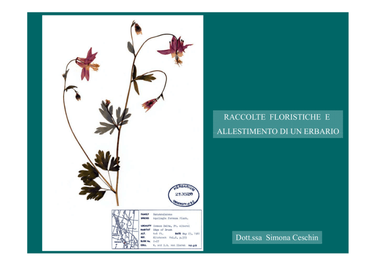 RACCOLTE FLORISTICHE E ALLESTIMENTO DI UN ERBARIO Dott.ssa Simona Ceschin IMPORTANZA DI UN ERBARIO Un erbario U b i puòò essere definito d fi it come “una “ collezione, ll i effettuata ff tt t con metodi t di scientifici, i tifi i di piante pressate ed essiccate, che vengono etichettate e conservate su fogli di carta”. Un erbario ppresenta diversi tipi p di interesse: ♣ STORICO - spesso in un erbario sono conservate piante raccolte in tempi passati e in località dove oggi non esistono più. Gli erbari, b i i cuii esemplari l i più iù antichi ti hi risalgono i l all XVI secolo l grazie i all paziente i t lavoro l di naturalisti, farmacisti e medici, rivestono tuttora un ruolo di primo piano nell’ambito della conoscenza floristica. ♣ SCIENTIFICO - l’erbario è un mezzo fondamentale di studio per la ricerca botanica: floristi, botanici sistematici e fitogeografi devono riconoscere correttamente le specie vegetali Il confronto con campioni dd’erbario vegetali. erbario accuratamente determinati risulta spesso fondamentale, soprattutto per le specie più critiche (talvolta è necessario il confronto con i “tipi”, cioè con quei campioni utilizzati per descrivere per la prima volta un taxon e che secondo le regole g della Nomenclatura Bot. Intern. devono essere depositati p in un Herbarium riconosciuto). Gli erbari sono molto utili anche per coloro che, che pur non essendo strettamente Botanici, Botanici lavorano su materiale vegetale e devono poter contare su un’esatta determinazione. ♣ APPLICATIVO - i dati segnati nelle etichette possono servire per ricavare notizie sugli usi delle piante. I campioni d’erbario possono essere utilizzati come confronto per l’identificazione di specie coltivate e per il riconoscimento di piante usate per scopi alimentari,, farmaceutici,, fitoterapeutici, p , etc. ♣ EDUCATIVO - dall’esame dei campioni d’erbario si possono ricavare informazioni sulla di ib i distribuzione d ll piante, delle i sulla ll loro l utilità ili à e soprattutto sulla ll varietà i à del d l mondo d vegetale. l Esistono erbari generali e tematici, questi ultimi possono essere ristretti ad un particolare gruppo di vegetali (erbario fanerogamico, briologico, micologico, lichenologico…). L’allestimento di un erbario può essere molto utile anche ai “botanici dilettanti” i quali potranno verificare la correttezza delle proprie determinazioni su campioni di erbari custoditi in genere presso le Università o altre istituzioni scientifiche riconosciute (es. Herbarium del Dip. di Biologia di Roma Tre, Herbarium del Dip. di Biologia Vegetale dell’Università “La Sapienza”, etc…). Realizzazione di un ERBARIO La metodologia da seguire per realizzare un erbario si articola in 4 varie fasi: ¾ raccolta sul campo delle specie vegetali ¾ identificazione dei campioni raccolti ¾ allestimento (essiccazione) ¾ sistemazione e conservazione Fase di raccolta (di campagna) Strumentazione: coltellino, vanghetta, block notes, penna, cartellini, sacchetti di plastica e scatolette 1. Non raccogliere specie presenti con pochi individui, rischiando di estinguere l’entità localmente,, ma ppreferire specie p ben rappresentate pp e diffuse. 2. Non raccogliere piante rare, endemiche e/o protette (lista specie protette Lazio). In questo caso una buona fotografia, corredata da indicazioni sulla località, data e notizie varie (abbondanza tipo di suolo, (abbondanza, suolo dati climatici ed ambientali, ambientali etc) fornisce un’ottima segnalazione ed ha il vantaggio di non depauperare l’ambiente. Fase di raccolta (di campagna) L.R. 19 settembre 1974, n. 61. Norme per la protezione della flora erbacea ed arbustiva spontanea (1) 1 Sono considerati elementi esemplari delle biocenosi del territorio laziale le seguenti specie 1. botaniche erbacee ed arbustive rare o particolarmente notevoli: Adenocarpus complicatus J. Gay - Ginestrella glandulosa. Agrotis albula (canina) Montelucci - Capellini. Allium margaritaceum S. et S. - Aglio margaritaceo. Ambrosia marittima L. - Ambrosia. Ammophila arenaria - Sparto pungente. Andrahne telephioides L. - Porcellana greca. Arisarum proboscideum Savib - Arisro codato, Gilico codato. Asplenium javorkeanum Vida - Felce rugginella, Asplenia di Javork Athamanta sicula L. - Finocchiella di Sicilia. Berteroa obliqua DC - Alisso obliquo. Biscutella didyma L. L - Biscutella didima didima. Bupleurum rollii Montelucci - Bupleuro del Rolli. Cardamine chelidonia L. - Cardamine balcanica, Billeri Balcanico. Cardamine graeca L. - Cardamine greca, Billeri greco. Cirsium monspessulanum Hill - Cardo di Montpellier. Claudium mariscus R Br - Panicastrella di palude. Corrigiola litoralis L. - Corrigiola marina Crepis lacera Ten. vel Crepis latialis Seb. - Radichiella del Lazio. Crocus imperati Ten. - Zafferano napoletano. Cynoglossum apenninum L. - Lingua di cane dell’Appennino. Cynoglossum magellense Ten. - Lingua di cane della Maiella Cytisus spinescens Presl - Ginestrella spinosa. Diotis maritima Desf. - Margherita delle dune. Erin s alpinus Erinus alpin s L. L Erino delle Alpi. Alpi Euphorbia coralloides L. - Euforbia corallina. Ferula glauca L. - Ferula azzurrina, Finocchiaccio azzurrino. Fritillaria persica L. - Giglio persiano, Giglio susino, Pennacchio persiano. Galanthus nivalis L. - Bucaneve. Galium cinereum All. - Caglio cenerino. p g gglaber L. - Dente di cane g glabro. L. - Dente di cane g glabro. Geropogon Helichrysum saxatile Mors - Elicriso delle pietre. Hesperis oblongipetale Borb. - Violacciocca laziale. Hyacinthus pendulinus Chiov. - Giacinto pendulo. Hypochaeris rubertia Fiori - Radicchiella di montagna. Iberis rollii A. Terr. - Iberide del Rolli. Imperata cylindrica P.B. - Pennacchi di palude. I i olbiensis Iris lbi i Henon H - Iride I id di Olbia, Olbi Gaggiolo G i l di Olbia. Olbi Juniperus oxycedrus zufescens LK. - Ginepro rosso. Kunadmannia sicula DC. - Finocchiella di Sicilia. Lilium bulbiferum croceum Chaix - Giglio r