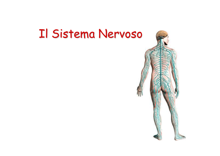 Il Sistema Nervoso Il Sistema Nervoso Il Sistema Nervoso coordina le attività della vita di relazione e svolge le seguenti funzioni: •riceve stimoli ed elabora risposte; •memorizza informazioni; •elabora ragionamenti. Il Sistema Nervoso L’unità fondamentale del sistema nervoso è il neurone una speciale cellula che trasmette gli impulsi nervosi. Il Sistema Nervoso Il neurone è formato dal corpo cellulare che contiene il nucleo e dai prolungamenti, il più lungo è l’assone, quelli più corti i dendriti; l’assone è protetto da una guaina. Il Sistema Nervoso Il neurone riceve gli stimoli attraverso i dendriti mentre attraverso l’assone invia gli impulsi ad altre cellule. Il Sistema Nervoso La sinapsi è una struttura altamente specializzata che consente la comunicazione delle cellule del tessuto nervoso tra loro (neuroni) o con altre cellule (cellule muscolari, sensoriali o ghiandole endocrine). Il Sistema Nervoso Il sistema nervoso è costituito da miliardi di neuroni che hanno come caratteristiche fondamentali: •l’eccitabilità (reagiscono agli stimoli); •la conducibilità (trasmettono gli impulsi). Il Sistema Nervoso In base alla loro funzione i neuroni si suddividono in: • neuroni sensoriali • neuroni motori • neuroni di associazione Il Sistema Nervoso 1. Neuroni sensoriali: trasmettono al sistema nervoso gli stimoli provenienti dall’esterno o da un organo interno. Il Sistema Nervoso 2. Neuroni motori: trasmettono impulsi elettrici dal sistema nervoso a muscoli e ghiandole. Il Sistema Nervoso 3. Neuroni di associazione: elaborano l’informazione e collegano i neuroni sensoriali con quelli motori. Il Sistema Nervoso Gli assoni di più neuroni sono riuniti in un fascio e formano così un nervo. Il Sistema Nervoso Il sistema nervoso dell'uomo si compone di due parti: •Sistema Nervoso Centrale •Sistema Nervoso Periferico. Sistema Nervoso Centrale Il sistema nervoso centrale è costituito dall'encefalo (racchiuso nella scatola cranica) e dal midollo spinale (racchiuso nel canale vertebrale all'interno della colonna vertebrale); è formato principalmente da neuroni di collegamento. Sistema Nervoso Centrale Il suo compito è di identificare, interpretare e integrare gli impulsi che arrivano dai neuroni sensoriali, generare una risposta adeguata e trasmetterla ai neuroni motori. È anche la sede dove si generano i ricordi e i pensieri. Sistema Nervoso Centrale L’encefalo e il midollo spinale sono protetti da tre membrane chiamate meningi. } meningi Sistema Nervoso Centrale Encefalo L’encefalo è formato dal cervello, dal cervelletto e dal midollo allungato (o bulbo). Sistema Nervoso Centrale Cervello Il cervello è diviso in due da un solco nei due emisferi destro e sinistro. Ogni emisfero è percorso da pieghe (circonvoluzioni cerebrali) che aumentano la superficie del cervello. Sistema Nervoso Centrale Encefalo Sotto il solco c’è un insieme di fibre, il corpo calloso, che collega tra loro i due emisferi. La parte più esterna, scura del cervello è chiamata corteccia cerebrale. Sistema Nervoso Centrale Encefalo La corteccia contiene i centri che controllano il movimento, la sensibilità, il pensiero, la memoria e tutte le funzioni più elevate dell’apprendimento e che consentono la vita di relazione con il mondo esterno. Sistema Nervoso Centrale Memoria La memoria è la capacità del cervello di conservare informazioni, nel breve, medio e lungo termine. Esistono due tipi di memoria: quella a breve termine e quella a lungo termine. Sistema Nervoso Centrale Cervello Il cervello viene suddiviso in quattro grandi aree, chiamate lobi, ognuna delle quali presiede a funzioni specifiche e differenziate. Sistema Nervoso Centrale Cervello Sistema Nervoso Centrale Cervello Il diencefalo è la parte più interna del cervello; controlla ed elabora gli stimoli provenienti dall’interno del corpo, grazie a due importanti gruppi di neuroni che formano le aree del cervello chiamate talamo e ipotalamo. Sistema Nervoso Centrale Cervello L’ipotalamo collega il sistema nervoso con quello endocrino, controllando la produzione di ormoni da parte della ghiandola ipofisi. Sistema Nervoso Centrale Cervelletto Il cervelletto è una formazione posta sotto gli emisferi cerebrali. Svolge funzioni di controllo dei movimenti volontari e del linguaggio. Sistema Nervoso Centrale Midollo allungato Il midollo allungato (o bulbo) collega l’encefalo al midollo spinale e contiene importanti centri nervosi che regolano, tra l’altro, le attività cardiaca e respiratoria. Sistema Nervoso Centrale Midollo spinale Il midollo allungato si prolunga verso il basso diventano midollo spinale, un cordone collocato all’interno della colonna vertebrale, che collega l’encefalo al sistema nervoso periferico. Sistema Nervoso Centrale Midollo spinale Il midollo spinale trasmette i comandi provenienti dall’encefalo e diretti ai muscoli e alle ghiandole ma ha anche una funzione propria, indipendente dall’encefalo. Sistema Nervoso Centrale Midollo spinale Cosa succede se tocchi una pentola calda? Prontamente ritrai la mano e lo fai in una frazione di secondo! Sistema Nervoso Centrale Midollo spinale Ecco cosa è successo in una frazione di secondo: 1. I ricettori della pelle ricevono gli stimoli esterni, in questo caso il forte calore. Sistema Nervoso Centrale Midollo spinale Ecco cosa è successo in una frazione di secondo: 2. I ricettori trasmettono lo stimolo ai neuroni sensoriali del braccio che arrivano fino all’interno del midollo spinale. Sistema Nervoso Centrale Midollo spinale Ecco cosa è successo in una frazione di secondo: 3. Qui l’impulso raggiunge un neurone di associazione che lo invia ai neuroni motori. Sistema Nervoso Centrale Midollo spinale Ecco cosa è successo in una frazione di secondo: 4. Questi neuroni comandano ai muscoli del braccio di contrarsi togliendo così la mano dalla pentola! Sistema Nervoso Centrale Midollo spinale Queste reazioni rapidissime sono ese