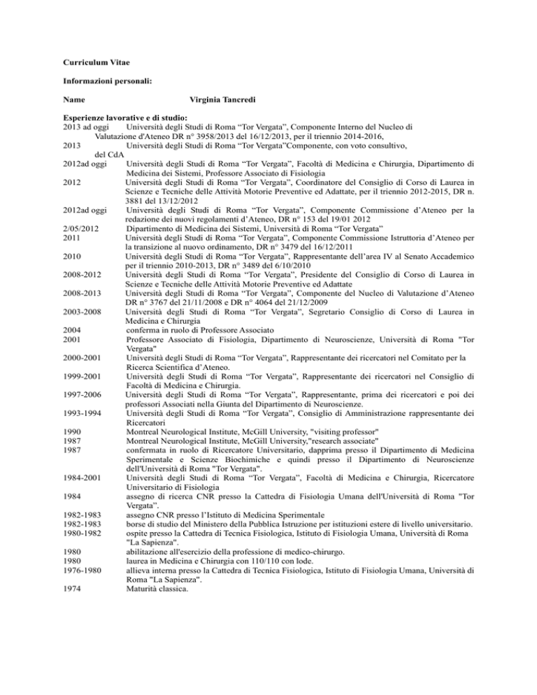 Curriculum Vitae Informazioni personali: Name Virginia Tancredi Esperienze lavorative e di studio: 2013 ad oggi Università degli Studi di Roma “Tor Vergata”, Componente Interno del Nucleo di Valutazione d'Ateneo DR n° 3958/2013 del 16/12/2013, per il triennio 2014-2016, 2013 Università degli Studi di Roma “Tor Vergata”Componente, con voto consultivo, del CdA 2012ad oggi Università degli Studi di Roma “Tor Vergata”, Facoltà di Medicina e Chirurgia, Dipartimento di Medicina dei Sistemi, Professore Associato di Fisiologia 2012 Università degli Studi di Roma “Tor Vergata”, Coordinatore del Consiglio di Corso di Laurea in Scienze e Tecniche delle Attività Motorie Preventive ed Adattate, per il triennio 2012-2015, DR n. 3881 del 13/12/2012 2012ad oggi Università degli Studi di Roma “Tor Vergata”, Componente Commissione d’Ateneo per la redazione dei nuovi regolamenti d’Ateneo, DR n° 153 del 19/01 2012 2/05/2012 Dipartimento di Medicina dei Sistemi, Università di Roma “Tor Vergata” 2011 Università degli Studi di Roma “Tor Vergata”, Componente Commissione Istruttoria d’Ateneo per la transizione al nuovo ordinamento, DR n° 3479 del 16/12/2011 2010 Università degli Studi di Roma “Tor Vergata”, Rappresentante dell’area IV al Senato Accademico per il triennio 2010-2013, DR n° 3489 del 6/10/2010 2008-2012 Università degli Studi di Roma “Tor Vergata”, Presidente del Consiglio di Corso di Laurea in Scienze e Tecniche delle Attività Motorie Preventive ed Adattate 2008-2013 Università degli Studi di Roma “Tor Vergata”, Componente del Nucleo di Valutazione d’Ateneo DR n° 3767 del 21/11/2008 e DR n° 4064 del 21/12/2009 2003-2008 Università degli Studi di Roma “Tor Vergata”, Segretario Consiglio di Corso di Laurea in Medicina e Chirurgia 2004 conferma in ruolo di Professore Associato 2001 Professore Associato di Fisiologia, Dipartimento di Neuroscienze, Università di Roma "Tor Vergata" 2000-2001 Università degli Studi di Roma “Tor Vergata”, Rappresentante dei ricercatori nel Comitato per la Ricerca Scientifica d’Ateneo. 1999-2001 Università degli Studi di Roma “Tor Vergata”, Rappresentante dei ricercatori nel Consiglio di Facoltà di Medicina e Chirurgia. 1997-2006 Università degli Studi di Roma “Tor Vergata”, Rappresentante, prima dei ricercatori e poi dei professori Associati nella Giunta del Dipartimento di Neuroscienze. 1993-1994 Università degli Studi di Roma “Tor Vergata”, Consiglio di Amministrazione rappresentante dei Ricercatori 1990 Montreal Neurological Institute, McGill University, "visiting professor" 1987 Montreal Neurological Institute, McGill University,"research associate" 1987 confermata in ruolo di Ricercatore Universitario, dapprima presso il Dipartimento di Medicina Sperimentale e Scienze Biochimiche e quindi presso il Dipartimento di Neuroscienze dell'Università di Roma "Tor Vergata". 1984-2001 Università degli Studi di Roma “Tor Vergata”, Facoltà di Medicina e Chirurgia, Ricercatore Universitario di Fisiologia 1984 assegno di ricerca CNR presso la Cattedra di Fisiologia Umana dell'Università di Roma "Tor Vergata”. 1982-1983 assegno CNR presso l’Istituto di Medicina Sperimentale 1982-1983 borse di studio del Ministero della Pubblica Istruzione per istituzioni estere di livello universitario. 1980-1982 ospite presso la Cattedra di Tecnica Fisiologica, Istituto di Fisiologia Umana, Università di Roma "La Sapienza". 1980 abilitazione all'esercizio della professione di medico-chirurgo. 1980 laurea in Medicina e Chirurgia con 110/110 con lode. 1976-1980 allieva interna presso la Cattedra di Tecnica Fisiologica, Istituto di Fisiologia Umana, Università di Roma "La Sapienza". 1974 Maturità classica. INCARICCHI DIDATTICI La Prof.ssa Tancredi è titolare di insegnamenti del SSD/BIO/09 in Corsi di laurea a ciclo, Corsi di laurea magistrale, in corsi di laurea di I livello, scule di specializzazione e dottorato di ricerca presso Università degli Studi di Roma “Tor Vergata, in Corsi di laurea magistrale, in corsi di laurea di I livello presso l’università telematica San Raffaele. ATTIVITÀ SCIENTIFICA L’interesse scientifico della Prof.ssa Tancredi verte sullo studio di alcuni sistemi neurosensoriali coinvolti nell’elaborazione dell’atto motorio. Questi studi sono di vivo interesse per le ricadute sulle scelte che devono suggerire lo svolgimento di attività sportiva in pazienti affetti da epilessia. Infatti, se prima l’atteggiamento prudenziale sconsigliava lo svolgimento di discipline sportive che possono metter a rischio l’incolumità del paziente affetto da crisi frequenti, studi recenti dimostrano l’efficacia dell’esercizio fisico nel controllo della frequenza di comparsa delle crisi stesse. L’approccio della Prof.ssa Tancredi a questi temi di ricerca è di tipo fisiopatologico, cercando di caratterizzare la funzione normale di questi sistemi attraverso lo studio delle loro alterazioni in modelli classici di patologia, quali l’epilessia generalizzata con assenze e l’epilessia del lobo temporale. In particolare, ha concentrato la propria attività sulle vie somatoestesiche talamocorticali, fondamentali per l’elaborazione dell’informazione sensitiva periferica, la regolazione dei livelli di vigilanza e attenzione, e sull’ippocampo, sede dei processi di memorizzazione dell’informazione spaziale applicata all’atto motorio. Tali tematiche di ricerca sono state affrontate in diversi modelli sperimentali “in vitro”, utilizzando tecniche elettrofisiologiche di registrazione. In particolare la Prof.ssa Tancredi ha analizzato il ruolo svolto dallo ione potassio nel modulare l’attività sincrona epilettiforme dei neuroni ippocampali, generata dall’applicazione di antagonisti dei recettori GABAa, dimostrando che l’incremento della [K+]o aumenta la frequenza di comparsa dei potenziali sicroni epilettiformi, probabilmente a causa di una riduzione in du