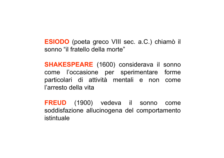 ESIODO (poeta greco VIII sec. a.C.) chiamò il sonno “il fratello della morte” SHAKESPEARE (1600) considerava il sonno come l’occasione per sperimentare forme particolari di attività mentali e non come l’arresto della vita FREUD (1900) vedeva il sonno come soddisfazione allucinogena del comportamento istintuale FISIOLOGIA DEL SONNO E DELLA VEGLIA VEGLIA La stato di veglia è una condizione fisiologica in cui l’uomo è in contatto con l’ambiente circostante, ed è in grado di rispondere a qualsiasi stimolo con azioni e reazioni adeguate. La veglia non è uno stato di coscienza unitario, per cui è possibile distinguere tre gradi di veglia caratterizzati: a) b) c) dalla quasi totale mancanza di attenzione (dormiveglia), dall’attenzione ampia e rivolta a tutto quello che accade intorno a noi, dall’attenzione rivolta a limitati aspetti della realtà. Il sonno è un fenomeno fisiologico di natura fasica caratterizzato da una profonda modificazione dell’attività elettrica cerebrale e da una perdita reversibile della coscienza e della capacità critica e discriminativa proprie della veglia. E’ uno stato di coscienza che differisce dalla veglia vigile a causa della mancanza di una reattività critica rispetto agli eventi dell’ambiente che ci circonda. E’ caratterizzato dal fatto che un individuo che sta dormendo può essere risvegliato più o meno rapidamente da stimoli sensitivi o sensoriali appropriati, proprietà questa che distingue il sonno da altri stati di alterata coscienza, come l’anestesia o il coma. Veglia e sonno sono funzioni differenti ma contemporaneamente correlate del S.N.C. Il ciclo sonno-veglia, come tante altre funzioni dell’organismo umano ed animale, è espressione di una oscillazione periodica giornaliera detta circadiana. Si ipotizzava che tale periodicità quotidiana potesse dipendere strettamente dall’ambiente; oggi, invece, sappiamo che la periodicità può continuare, anche escludendo tutti i fattori ambientali, e che la causa è il nucleo soprachiasmatico dell’ipotalamo che funge da pacemaker circadiano. Questo nucleo naturalmente è influenzato da vari fattori: ormonali, genetici e dalla temperatura corporea. Riceve, inoltre, afferenze dal sistema retino-ipotalamico per cui può essere modificato, anche, da stimoli luminosi e dal ciclo luce-buio. Il ciclo sonno-veglia perciò è legato a complessi sistemi operativi che producono stati elettrofisiologici e comportamentali in continua trasformazione i quali si identificano in due processi fondamentali collegati tra loro: il processo C ed il processo S. Il sonno è controllato da due differenti processi: •quello omeostatico determina la quantità di sonno in relazione al tempo che un individuo ha speso nella fase di veglia; •quello circadiano stabilisce a quale ora del giorno il sonno si verifica. In condizioni fisiologiche questi due sistemi interagiscono. Sulla base di tre principali modificazioni che si verificano: -a livello di tracciato Elettrencefalografico (EEG), -a livello di tono muscolare -sulla base di determinati movimenti oculari distinguiamo nel sonno due fasi: fase detta non REM (rapid eye movements) o di sonno sincronizzato o ortodosso; fase detta REM o di sonno desincronizzato o paradosso. La I fase comprende 4 stadi, e concerne circa il 75-80% del sonno totale La II fase (20-25% del sonno totale) è caratterizzata dal fatto che il SNC è sveglio e all’erta, ma è privato del contatto sensoriale con l’ambiente esterno. Elettrodi di superficie A = elettrodo al collodio B = elettrodi a placca con due tipi di raccordo con il cavo registrante C = elettrodi ad ago Stadio % sonno totale EEG EMG EOG I 2-5% rallentamento onde α tono muscolare medio-alto singoli movimenti lenti degli occhi II 45-55% comparsa dei fusi del sonno riduzione del tono muscolare assenza di movimenti oculari III 3-8% onde δ riduzione del tono muscolare assenza di movimenti oculari IV 10-15% onde δ rallentate riduzione del tono muscolare assenza di movimenti oculari Il tracciato EEGrafico è desincronizzato ed appare quindi simile a quello di un soggetto sveglio. Sono inoltre presenti atonia e paralisi locomotoria affinchè venga impedito all’organismo di nuocere a se stesso e agli altri. Nel sonno REM distinguiamo componenti toniche (che accompagnano il sonno REM per tutta la durata) e componenti fasiche. Le prime comprendono la desincronizzazione EEGrafica, l’atonia e la paralisi locomotoria; le seconde, invece, le clonie degli arti, i rapidi movimenti oculari e le onde Ponto-GenicoloOccipitali (PGO). Gli ultimi due sono particolari espressioni di uno stato di allerta generale. Il passaggio dalla veglia al sonno e viceversa si verifica grazie all’azione di due sistemi e di una serie di circuiti antagonisti che provocano sincronizzazione EEGrafica (sonno comportamentale) o desincronizzazione EEGrafica (veglia comportamentale). MECCANISMI DEL SONNO 1. Strutture nervose della veglia: aumentano il tono corticale 2. Strutture nervose del sonno: riducono il tono corticale FORMAZIONE RETICOLARE ASCENDENTE 1. Mesencefalo e parte anteriore del ponte: centri del risveglio e della veglia tonica 2. Parte posteriore del ponte e bulbo: centro ipnogeno - Responsabili degli eventi elettrici IPOTALAMO 1. Anteriore: centro ipnogeno 2. Posteriore: centro della veglia - Responsabili degli eventi comportamentali Il sistema sincronizzante potrebbe essere attivato: •dall’accumulo nel corso della veglia di un fattore ipnogeno, chiamato fattore S. probabilmente tale fattore agisce attraverso le strutture ipotalamiche anteriori, facilitando l’attivazione dei circuiti sincronizzanti. •mediante l’azione ipnogena provocata da stimoli sensitivi o sensoriali ripetuti in modo monotono o la stimolazione ripetuta a bassa frequenza di fibre afferenti dai meccanocettori cutanei (fibre di gruppo II) producono addormentamento. Di contro, la stimolazione di fibre nocicettive (fibre di gruppo III), producono risve