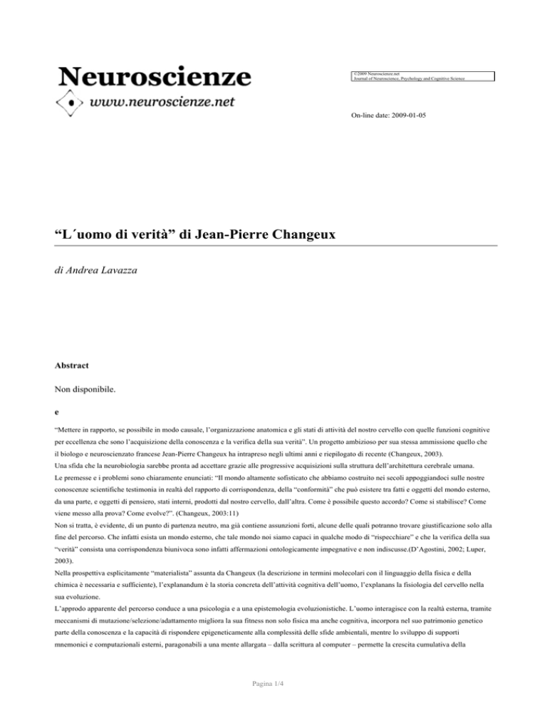 ©2009 Neuroscienze.net Journal of Neuroscience, Psychology and Cognitive Science On-line date: 2009-01-05 “L´uomo di verità” di Jean-Pierre Changeux di Andrea Lavazza Abstract Non disponibile. e “Mettere in rapporto, se possibile in modo causale, l’organizzazione anatomica e gli stati di attività del nostro cervello con quelle funzioni cognitive per eccellenza che sono l’acquisizione della conoscenza e la verifica della sua verità”. Un progetto ambizioso per sua stessa ammissione quello che il biologo e neuroscienzato francese Jean-Pierre Changeux ha intrapreso negli ultimi anni e riepilogato di recente (Changeux, 2003). Una sfida che la neurobiologia sarebbe pronta ad accettare grazie alle progressive acquisizioni sulla struttura dell’architettura cerebrale umana. Le premesse e i problemi sono chiaramente enunciati: “Il mondo altamente sofisticato che abbiamo costruito nei secoli appoggiandoci sulle nostre conoscenze scientifiche testimonia in realtà del rapporto di corrispondenza, della “conformità” che può esistere tra fatti e oggetti del mondo esterno, da una parte, e oggetti di pensiero, stati interni, prodotti dal nostro cervello, dall’altra. Come è possibile questo accordo? Come si stabilisce? Come viene messo alla prova? Come evolve?”. (Changeux, 2003:11) Non si tratta, è evidente, di un punto di partenza neutro, ma già contiene assunzioni forti, alcune delle quali potranno trovare giustificazione solo alla fine del percorso. Che infatti esista un mondo esterno, che tale mondo noi siamo capaci in qualche modo di “rispecchiare” e che la verifica della sua “verità” consista una corrispondenza biunivoca sono infatti affermazioni ontologicamente impegnative e non indiscusse.(D’Agostini, 2002; Luper, 2003). Nella prospettiva esplicitamente “materialista” assunta da Changeux (la descrizione in termini molecolari con il linguaggio della fisica e della chimica è necessaria e sufficiente), l’explanandum è la storia concreta dell’attività cognitiva dell’uomo, l’explanans la fisiologia del cervello nella sua evoluzione. L’approdo apparente del percorso conduce a una psicologia e a una epistemologia evoluzionistiche. L’uomo interagisce con la realtà esterna, tramite meccanismi di mutazione/selezione/adattamento migliora la sua fitness non solo fisica ma anche cognitiva, incorpora nel suo patrimonio genetico parte della conoscenza e la capacità di rispondere epigeneticamente alla complessità delle sfide ambientali, mentre lo sviluppo di supporti mnemonici e computazionali esterni, paragonabili a una mente allargata – dalla scrittura al computer – permette la crescita cumulativa della Pagina 1/4 “cultura”. (Barkow, Cosmides, Tooby, 1992; Pinker, 1997). Ovvero, come dice l’Autore, sono “sopravvissute le specie capaci, a partire dal loro patrimoni genetico, di formarsi dell’ambiente circostante rappresentazioni sufficientemente ‘vere’ da garantire loro l’omeostasi e la possibilità di riprodursi”. L’intera realtà cognitiva si spiega in questi termini, la difficoltà riguarda la comprensione dei meccanismi specifici all’opera nel cervello. (Popper, 1983). E Changeux si propone di fare luce su di essi, proprio perché la sua sintesi originale si occupa della “scatola nera” del sistema nervoso centrale (Snc) che i teorici lasciano inesplorata. Il primo elemento fondamentale di novità rispetto al modello evoluzionistico classico riguarda l’attività neuronale spontanea. “Il cervello si comporta naturalmente come un sistema autonomo che proietta in permanenza informazione verso il mondo esterno, invece di riceverne passivamente gli influssi. L’attività intrinseca spontanea del cervello è una delle sue principali componenti. Essa si manifesta attraverso potenziali d’azione prodotti spontaneamente dalle cellule nervose” (Changeux, 2003:28). Responsabili di tale attività sono gli oscillatori molecolari, costituiti da almeno due proteine-canale antagoniste strettamente accoppiate. Le fluttuazioni lente del potenziale elettrico della membrana neuronale da essi prodotte, al di là di una certa soglia, scatenano scariche spontanee. L’altra caratteristica essenziale del cervello è la sua plasticità. “Il termine designa la generica capacità del neurone e delle sue sinapsi di cambiare proprietà in funzione del loro stato di attività. Questa proprietà fondamentale contraddice l’impressione ingenua secondo la quale il cervello sarebbe una sorta di automa rigido costituito esclusivamente da rotelle e ingranaggi” (Changeux, 2003:30). Dall’”apertura” del sistema nervoso discende la sua “motivazione”. “[Il cervello] opera anche in senso contrario, come produttore di rappresentazioni che vengono proiettate sul mondo esterno. L’attività spontanea di insiemi specializzati di neuroni spinge l’organismo a esplorare e a sperimentare continuamente l’ambiente fisico, sociale e culturale, a cogliere le risposte e a confrontarle con quanto ha in memoria. Di conseguenza il cervello sviluppa sorprendenti capacità di ‘autoattivazione’ e quindi di autoorganizzazione” (Changeux, 2003:37). Si tratta, a quanto sembra, di una capacità cablata nel Snc dall’evoluzione darwiniana la cui storia filogenetica meriterebbe di essere indagata e le cui tappe non sono facilmente ricostruibili, né il metodo da seguire individuato con certezza (Sterelny, 2004). Uno dei meccanismi chiave messo in evidenza da Changeux è quello della “ricompensa mentale”. In studi famosi e più recenti (Olds, 1958; Di Chiara, 1999) si è accertato che la liberazione di dopamina nel corpo striato (e nel nucleo accumbens in particolare) produce il “piacere della ricompensa” che può essere associato alle droghe ma anche a comportamenti conoscitivi. Fondamentale è la cosiddetta anticipazione: uomo e animale imparano a prevedere la ricompensa e a cercare le condizioni in cui possono ottenerla, e questa cap
