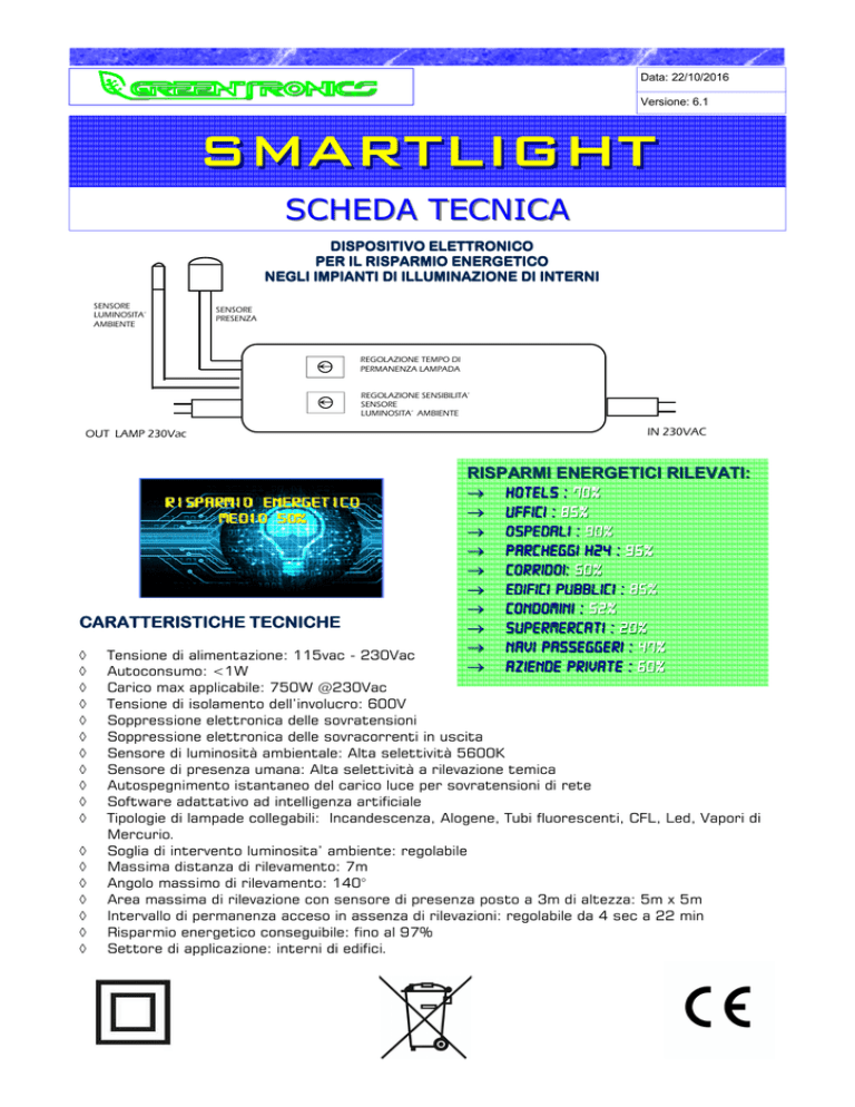 Data: 22/10/2016 Versione: 6.1 SMARTLIGHT SCHEDA TECNICA DISPOSITIVO ELETTRONICO PER IL RISPARMIO ENERGETICO NEGLI IMPIANTI DI ILLUMINAZIONE DI INTERNI SENSORE LUMINOSITA’ AMBIENTE SENSORE PRESENZA REGOLAZIONE TEMPO DI PERMANENZA LAMPADA REGOLAZIONE SENSIBILITA’ SENSORE LUMINOSITA’ AMBIENTE OUT LAMP 230Vac CARATTERISTICHE TECNICHE ◊ ◊ ◊ ◊ ◊ ◊ ◊ ◊ ◊ ◊ ◊ ◊ ◊ ◊ ◊ ◊ ◊ ◊ IN 230VAC RISPARMI ENERGETICI RILEVATI: → HOTELS : 70% → UFFICI : 85% → OSPEDALI : 90% → PARCHEGGI H24 : 95% → CORRIDOI: 50% → EDIFICI PUBBLICI : 85% → CONDOMINI : 52% → SUPERMERCATI : 20% → NAVI PASSEGGERI : 47% → AZIENDE PRIVATE : 60% Tensione di alimentazione: 115vac - 230Vac Autoconsumo: <1W Carico max applicabile: 750W @230Vac Tensione di isolamento dell’involucro: 600V Soppressione elettronica delle sovratensioni Soppressione elettronica delle sovracorrenti in uscita Sensore di luminosità ambientale: Alta selettività 5600K Sensore di presenza umana: Alta selettività a rilevazione temica Autospegnimento istantaneo del carico luce per sovratensioni di rete Software adattativo ad intelligenza artificiale Tipologie di lampade collegabili: Incandescenza, Alogene, Tubi fluorescenti, CFL, Led, Vapori di Mercurio. Soglia di intervento luminosita’ ambiente: regolabile Massima distanza di rilevamento: 7m Angolo massimo di rilevamento: 140° Area massima di rilevazione con sensore di presenza posto a 3m di altezza: 5m x 5m Intervallo di permanenza acceso in assenza di rilevazioni: regolabile da 4 sec a 22 min Risparmio energetico conseguibile: fino al 97% Settore di applicazione: interni di edifici. Data: 22/10/2016 Versione: 6.1 SMARTLIGHT SCHEDA TECNICA SCHEMA DI INSTALLAZIONE IN OUT Il dispositivo SMARTLIGHT è universale perchè: ⇒ Si può collegare alla stragrande maggioranza di tipologie di lampade: alogene, fluorescenti, incandescenza, CFL, LED, ecc. ⇒ Può essere installato in tutti gli ambienti: abitazioni, uffici, stabilimenti, magazzini, garage, parcheggi sotterranei, alberghi, villaggi turistici, ristoranti, supermercati, scuole, centri commerciali, condomini, rampe di scale, pensiline, corridoi, aeroporti, navi, stazioni ferroviarie, ecc. ⇒ Può essere installato in qualsiasi impianto elettrico: non è rilevante che la lampada sulla quale è installato sia comandata da un interruttore semplice, piuttosto che da un relè passopasso-passo, o da un deviatore, o da un crepuscolare, o da un timer o da un sistema di telecontrollo, ecc Possibilità di pagamento in comode rate mensili, inferiori al risparmio mensile ottenuto, mediante formula di Noleggio Operativo SMARTLIGHT, oltre ai Certificati Bianchi, gode in alternativa delle detrazioni fiscali del 65% (ECOBONUS per privati e aziende) e degli incentivi del 40% del Nuovo Conto Termico (per le Pubbliche Amministrazioni) in quanto sistema di Building Automation. Per il GSE “la migliore soluzione per l’efficienza energetica negli impianti di illuminazione” con 1 solo anno di rientro dall’investimento 100% MADE IN ITALY Per ulteriori chiarimenti e informazioni di carattere tecnico: E-mail: [email protected]