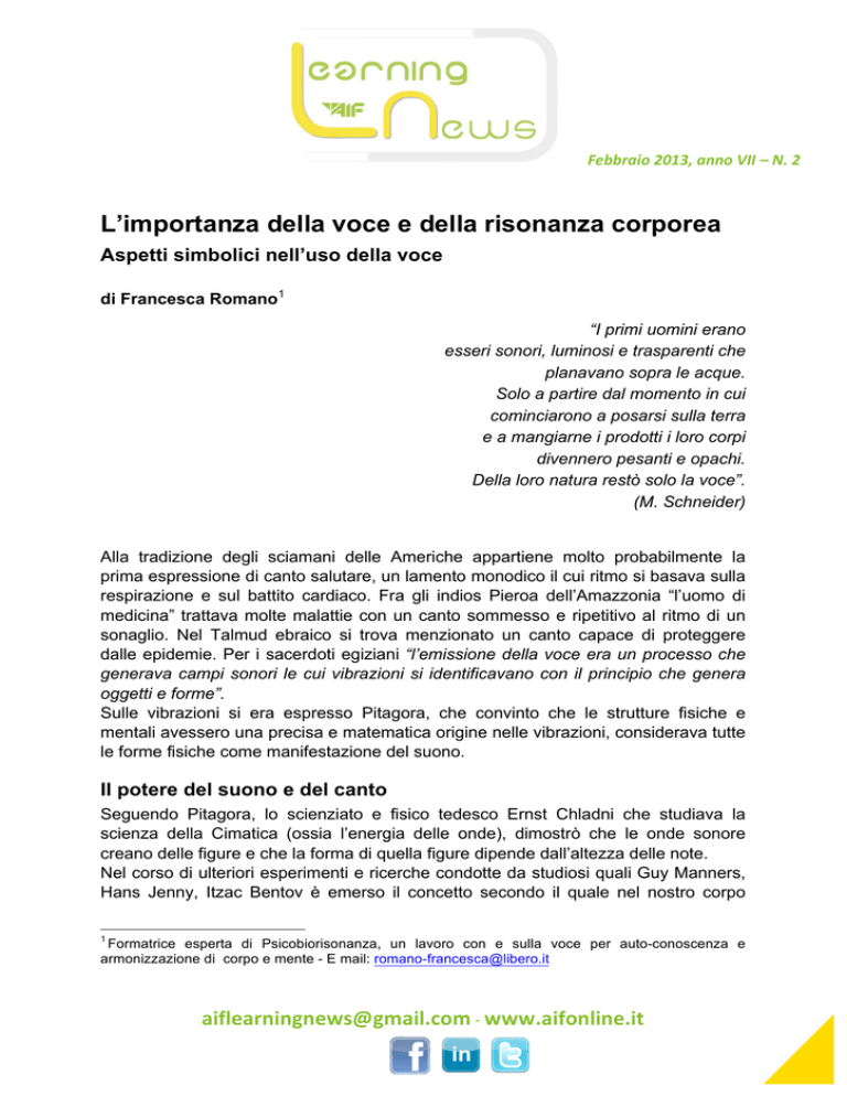 Febbraio 2013, anno VII – N. 2 L’importanza della voce e della risonanza corporea Aspetti simbolici nell’uso della voce di Francesca Romano1 “I primi uomini erano esseri sonori, luminosi e trasparenti che planavano sopra le acque. Solo a partire dal momento in cui cominciarono a posarsi sulla terra e a mangiarne i prodotti i loro corpi divennero pesanti e opachi. Della loro natura restò solo la voce”. (M. Schneider) Alla tradizione degli sciamani delle Americhe appartiene molto probabilmente la prima espressione di canto salutare, un lamento monodico il cui ritmo si basava sulla respirazione e sul battito cardiaco. Fra gli indios Pieroa dell’Amazzonia “l’uomo di medicina” trattava molte malattie con un canto sommesso e ripetitivo al ritmo di un sonaglio. Nel Talmud ebraico si trova menzionato un canto capace di proteggere dalle epidemie. Per i sacerdoti egiziani “l’emissione della voce era un processo che generava campi sonori le cui vibrazioni si identificavano con il principio che genera oggetti e forme”. Sulle vibrazioni si era espresso Pitagora, che convinto che le strutture fisiche e mentali avessero una precisa e matematica origine nelle vibrazioni, considerava tutte le forme fisiche come manifestazione del suono. Il potere del suono e del canto Seguendo Pitagora, lo scienziato e fisico tedesco Ernst Chladni che studiava la scienza della Cimatica (ossia l’energia delle onde), dimostrò che le onde sonore creano delle figure e che la forma di quella figure dipende dall’altezza delle note. Nel corso di ulteriori esperimenti e ricerche condotte da studiosi quali Guy Manners, Hans Jenny, Itzac Bentov è emerso il concetto secondo il quale nel nostro corpo 1 Formatrice esperta di Psicobiorisonanza, un lavoro con e sulla voce per auto-conoscenza e armonizzazione di corpo e mente - E mail: [email protected] [email protected] -­‐ www.aifonline.it fisico ogni atomo ha una propria frequenza naturale e che tessuti e fluidi si mantengono in base al principio della risonanza a alla conseguente interazione degli armonici. Sono stati individuati cinque sistemi risonanti nel corpo: sistema cuoreaorta; oscillazioni del cranio; onde nei ventricoli; corteccia sensoria: campo magnetico in ciascun emisfero; da essi derivano altri suoni (quelli che il feto ascolta nel grembo materno) come quello della circolazione del sangue, del sistema nervoso, della respirazione del sistema digestivo, delle pulsazioni del cuore e dei movimenti delle ossa. Ma è del secolo scorso la grande attenzione al potere del suono e del canto: le ricerche e gli studi condotti negli Stati Uniti dall’American Academy of Neurology, indicano il canto come possibile terapia per casi di dislesssia, autismo, Alzheimer e Parkinson. Si sottolinea che le nostre funzioni mentali, emozionali e sensoriali sono codificate nella voce in modo determinato proprio come lo sono le informazioni nei nostri geni. Alcuni patologi suggeriscono che canticchiare a bocca chiusa e cantare ripuliscono il cervello stimolandone il “drenaggio”. Le vibrazioni della laringe e l’aria nel tratto vocale sono trasmesse parzialmente nel cranio massaggiando così il cervello. Tale massaggio permette un maggior fluido di liquido cerebrospinale attraverso il cervello e aiuta a rimuovere materiale di scarto. Se in Francia gli studi dell’otorinolaringoiatra A. Tomatis sottolineano che il canto agisce sul sistema nervoso e regola la pressione e il battito cardiaco, in Svizzera sono state condotte ricerche sperimentali volte ad osservare le dinamiche che intercorrono tra le variazioni dell’intensità del suono vocale e le variazioni dei dati di risposta bioenergetica dell’organismo umano. Il gruppo di ricerca ha osservato processi di bio-risonanza a cui collega principi di medicina quantistica ed elementi di psicologia Vedica sulla natura del suono. Alla luce degli studi a cui abbiamo accennato, non ci si può non chiedere quale effetto abbia il suono sulle minime strutture cellulari ed atomiche: nel nostro organismo ogni molecola vibra, ogni particella e ogni elemento del corpo risuona con frequenze esterne provenienti dalla natura, dalla terra, dall’atmosfera e che provvedono al nostro equilibrio vitale. Nel dialogo tra corpo e psiche il suono della voce può intervenire sulla fluttuazione delle vibrazioni e può sbloccare, trasformare e riequilibrare. I presupposti La vibrazione della voce è stato il punto di partenza della mia ricerca ed è l’elemento chiave del mio attuale metodo di lavoro che nasce da un percorso personale e che si basa sui seguenti presupposti: 1) il canto – e in special modo il canto lirico di cui spiegherò più avanti - prende corpo da appoggi anatomici che hanno significati simbolici; 2) l’ascolto – attraverso l’orecchio quale strumento di percezione uditiva e incredibile complesso neurotico - è la principale guida nel canto e rappresenta il ponte che conduce a sé e agli altri, via d’accesso per l’interiorizzazione e l’espressione. 3) il respiro naturale – ossia quel meccanismo che ci abbandona nell’età pre-scolare per lasciar posto a contratture e chiusure - nel canto ritrova il suo ritmo ancestrale in [email protected] -­‐ www.aifonline.it una struttura corporea composta di ossa, acqua e aria perciò vibrante come uno strumento musicale. Dunque la laringe al passaggio dell’aria vibra e fa vibrare la colonna vertebrale che mobilita il corpo intero in una dinamica in cui il canto diventa espressione autentica di libertà interiore. Sottolineo il belcanto perché il cantante lirico utilizza ossa e muscoli del proprio corpo in modo funzionale. Infatti la propagazione ossea del suono e l’azione dinamica dell’intreccio muscolare attraverso l’utilizzo dell’aria consentono di sviluppare potenzialità della voce che l’essere umano non conosce. Accade che il corpo si apre per consentire all’aria di fluire e alle corde di….mettersi a cantare! Mi soffermo sull’util