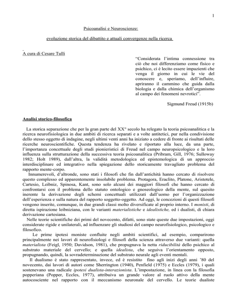 1 Psicoanalisi e Neuroscienze: evoluzione storica del dibattito e attuali convergenze nella ricerca A cura di Cesare Tulli “Considerata l’intima connessione tra ciò che noi differenziamo come fisico e psichico, ci è lecito essere impazienti che venga il giorno in cui le vie del conoscere e, speriamo, dell’influire, apriranno il cammino che guida dalla biologia e dalla chimica dell’organismo al campo dei fenomeni nevrotici”. Sigmund Freud (1915b) Analisi storico-filosofica La storica separazione che per la gran parte del XX° secolo ha relegato la teoria psicoanalitica e la ricerca neurofisiologica in due ambiti di ricerca separati e a volte antitetici, pur nella condivisione dello stesso oggetto di indagine, negli ultimi venti anni ha iniziato a cedere di fronte ai risultati delle ricerche neuroscientifiche. Questa tendenza ha rivelato e riportato alla luce, da una parte, l’importanza concettuale degli studi pionieristici di Freud nel campo neuropsicologico e la loro influenza sulla strutturazione della successiva teoria psicoanalitica (Pribram, Gill, 1976; Sulloway 1982; Holt 1989), dall’altra, la validità metodologica ed epistemologica di un approccio interdisciplinare ed integrativo nella spiegazione dello storicamente travagliato problema del rapporto mente-corpo. Innumerevoli, d’altronde, sono stati i filosofi che fin dall’antichità hanno cercato di risolvere questo complesso ed apparentemente insolubile problema. Protagora, Eraclito, Platone, Aristotele, Cartesio, Leibniz, Spinosa, Kant, sono solo alcuni dei maggiori filosofi che hanno cercato di confrontarsi con il problema dello statuto ontologico e gnoseologico della mente, sul quesito inerente la derivazione degli schemi concettuali utilizzati dall’uomo per l’organizzazione dell’esperienza e sulla natura del rapporto soggetto-oggetto. Ad oggi, le concezioni di questi filosofi vengono inserite, comunque, in due grandi classi molto diversificate al proprio interno. I monisti, di diretta ispirazione leibniziana, con le varianti materialistiche e idealistiche, ed i dualisti, di chiara derivazione cartesiana. Nelle teorie scientifiche dei primi del novecento, difatti, sono state queste due impostazioni, oggi considerate rigide e unilaterali, ad influenzare gli studiosi del campo neurofisiologico, psicologico e filosofico. Le prime ipotesi moniste confluite negli ambiti scientifici, ad esempio, comparirono principalmente nei lavori di neurofisiologi e filosofi della scienza attraverso due varianti: quella materialista (Feigl, 1950; Davidson, 1981), che propugnava la netta riducibilità dello psichico al substrato materiale del cervello; e quella idealista, che seguiva l’orientamento opposto, propugnando, quindi, la sovradeterminazione del substrato neurale agli eventi mentali. Il dualismo è stato rappresentato, invece, ed è resistito fino agli inizi degli anni ’80 del novecento, dai lavori di autori come Sherrington (1940), Penfield (1975) e Eccles (1979), i quali sostenevano una radicale ipotesi dualista-interazionista. L’impostazione, in linea con la filosofia popperiana (Popper, Eccles, 1977), attribuiva un grande valore al ruolo attivo della mente autocosciente nel rapporto con il meccanismo neuronale del cervello. Le teorie dualiste 2 interazioniste, comunque, pur rendendo possibile un notevole avanzamento degli studi sulle basi neurali della coscienza, ottennero l’effetto di acuire le distanze tra le ipotesi deterministe della psicoanalisi classica e la ricerca neuropsicologica, amplificando le difficoltà comunicative tra i due campi. Le concezioni popperiane, infatti, si schieravano apertamente contro l’idea di una possibile inclusione della psicoanalisi nel rango delle scienze empiriche. In un celebre passo, a proposito della scientificità degli orientamenti freudiani o adleriani, ad esempio Popper disse: “Esse semplicemente non sono controllabili, sono inconfutabili. Non c'è alcun comportamento umano immaginabile che può contraddirle. Ciò non significa che Freud e Adler non vedessero correttamente certe cose: personalmente non ho dubbi che molto di quanto essi affermano ha una considerevole importanza, e che potrà svolgere un suo ruolo un giorno, in una scienza psicologica controllabile. Ma questo non significa che le 'osservazioni cliniche', che gli analisti ingenuamente considerano come conferme delle loro teorie, di fatto confermino quest'ultime più di quanto facessero le conferme quotidiane riscontrate dagli astrologi nella loro pratica” (1972, p. 68-69). Questa frattura, inoltre, si nutrì dei numerosi contributi di tutti quegli psicoanalisti che, mettendo in evidenza l’inadeguatezza esplicativa della componente energetica della teoria freudiana, decisero di abbandonare il proposito scientista, abbracciando le correnti ermeneutiche. L’insieme di questi fattori contribuì all’affermazione, nel campo neurofisiologico, di questa tendenza, senza una opportuna valutazione delle revisioni che alcuni teorici avevano applicato, a partire dagli anni ’40, all’intero edificio concettuale psicoanalitico, contribuendo anche al rafforzamento dei pregiudizi sulla scarsa scientificità delle teorie psicoanalitiche sia in ambito specialistico che nell’opinione pubblica. Da un punto di vista prettamente neuroscientifico, invece, negli ultimi decenni del novecento si è assistito ad un arricchimento nella complessità e nella profondità delle spiegazioni. Ampie sono state le dimostrazioni e le convalide empiriche, confermate dai lavori di numerosi studiosi, che hanno constatato la maggiore validità epistemologica di un approccio monista o emergentista per la spiegazione del rapporto mente-cervello. I sostenitori più illustri dell’attuale orientamento monista possono essere considerati Edelman e Damasio, di quello emergentista invece, le cui prime formulazioni le ritroviamo in Morgan (1923) e Broad (1925), negli ultimi anni del novecento sono state adottate da autori quali