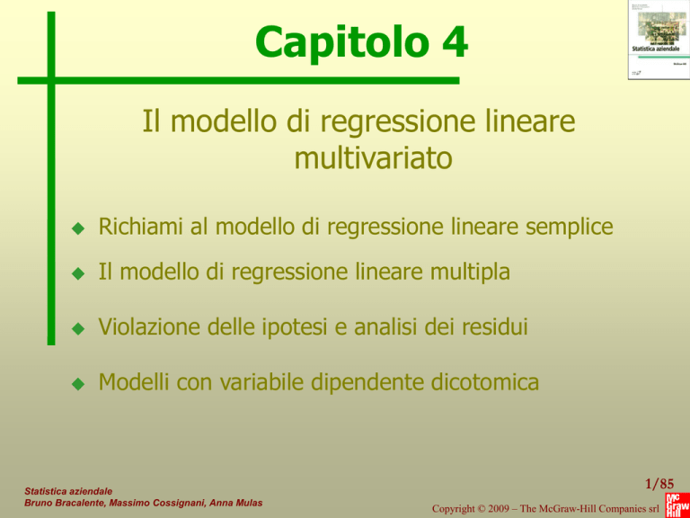 Capitolo 4 Il modello di regressione lineare multivariato Richiami al modello di regressione lineare semplice Il modello di regressione lineare multipla Violazione delle ipotesi e analisi dei residui Modelli con variabile dipendente dicotomica Statistica aziendale Bruno Bracalente, Massimo Cossignani, Anna Mulas 1/85 Copyright © 2009 – The McGraw-Hill Companies srl L’analisi di regressione Obiettivo: investigare sulle relazioni empiriche tra variabili per analizzare le cause che possono spiegare un dato fenomeno I modelli utilizzati sono basati su funzioni lineari nei parametri del tipo Y = α + β X Alcune funzioni non lineari sono riconducibili a lineari attraverso opportune trasformazioni delle variabili: Y = α Xβ log Y = log α + β log X Anche in caso di relazioni non lineari e non linearizzabili una prima analisi fondata su forme funzionali lineari è un utile punto di partenza per passare poi a eventuali modelli più complessi Statistica aziendale Bruno Bracalente, Massimo Cossignani, Anna Mulas 2/85 Copyright © 2009 – The McGraw-Hill Companies srl L’analisi di regressione Regressione semplice: una sola variabile indipendente o esplicativa; Regressione multipla: più di una variabile indipendente Esempio: effetti sulle vendite di un supermercato derivanti da una azione di promozione Da un campione di supermercati si rilevano le vendite settimanali e la spesa settimanale per promozione regressione semplice Se si ritiene che anche altre cause influiscano sulle vendite si rilevano anche altre variabili regressione multipla Obiettivi conoscitivi: c’è una relazione significativa tra il volume delle vendite e la spesa per promozione (e le altre variabili) ? Sulla base di tale relazione come prevedere il volume delle vendite a seguito di una spesa settimanale per promozione di 1500 euro ? Statistica aziendale Bruno Bracalente, Massimo Cossignani, Anna Mulas 3/85 Copyright © 2009 – The McGraw-Hill Companies srl Le fasi di un’analisi di regressione lineare - Si ipotizza una relazione funzionale lineare tra una variabile oggetto di studio (variabile dipendente o risposta) e una o più altre variabili (indipendenti o esplicative) - Si stimano i parametri di tale relazione funzionale sulla base dei dati campionari a disposizione - Si effettuano i test statistici sulla significatività dei parametri e si valuta la bontà dell’adattamento del modello ai dati - Si effettuano altre analisi di conferma sulla validità delle assunzioni su cui si basa la stima del modello (linearità e altro) - Eventualmente, sulla base del modello stimato e di valori ipotizzati per le variabili indipendenti si stimano i valori previsti per la variabile dipendente Statistica aziendale Bruno Bracalente, Massimo Cossignani, Anna Mulas 4/85 Copyright © 2009 – The McGraw-Hill Companies srl Il modello di regressione lineare semplice - Richiami Su un campione di n unità sono osservati i valori relativi a due variabili: Y variabile dipendente o variabile risposta X variabile indipendente o variabile esplicativa Esempio: Y volume delle vendite; X spesa per promozione Campione di supermercati: Diagramma di dispersione: Vendite (x100 euro) Spesa prom (x10 euro) 300 43.2 48 250 132 134 155 122 13 100.9 80 187.4 99 185 77 Vendite 76 200 150 100 50 0 0 60.7 50 82.9 44 61.3 25 Statistica aziendale Bruno Bracalente, Massimo Cossignani, Anna Mulas 20 40 60 80 100 120 140 -50 Spesa_prom 5/85 Copyright © 2009 – The McGraw-Hill Companies srl Il modello di regressione lineare semplice Relazione lineare ipotizzata: Yi X i ui i = 1, 2,…, n α e β: parametri del modello di regressione α: intercetta; β: coefficiente di regressione u: termine di errore (discrepanze tra valori osservati di Y e quelli derivanti da una relazione esatta con X). Comprende: - errori di specificazione (alla spiegazione esatta di Y in genere concorrono moltissime variabili esplicative, ma solo la principale di esse – o le principali nel caso della regressione multipla – sono inseribili nel modello); - errori di misura o di risposta presenti nella variabile Y Statistica aziendale Bruno Bracalente, Massimo Cossignani, Anna Mulas 6/85 Copyright © 2009 – The McGraw-Hill Companies srl Le ipotesi del modello Yi X i ui i = 1, 2,…, n ui: variabili casuali che si ipotizzano: - distribuite normalmente - a media E(ui) = 0 - varianza costante E(ui2) = σ2u - covarianza nulla E(ui , uj) = 0 X è assunta non affetta da errore di misura Statistica aziendale Bruno Bracalente, Massimo Cossignani, Anna Mulas 7/85 Copyright © 2009 – The McGraw-Hill Companies srl La retta di regressione stimata In base alle n osservazioni campionarie: stime dei parametri α e β del modello di regressione, indicate con a e b Stimati i parametri, la relazione che lega le due variabili corrisponde a una particolare retta nel piano: Ŷ a bX retta di regressione stimata dove: Yˆ indica l’ordinata teorica corrispondente ad un dato valore di X il coefficiente a - o intercetta - rappresenta l’ordinata all’origine della retta il coefficiente di regressione b è il coefficiente angolare della retta Statistica aziendale Bruno Bracalente, Massimo Cossignani, Anna Mulas 8/85 Copyright © 2009 – The McGraw-Hill Companies srl La stima dei parametri La retta stimata è tanto più adatta a descrivere la relazione tra le due variabili quanto più i punti osservati sono vicini a tale retta, ovvero quanto minori sono i “residui campionari” Esempio: Regressione di Vendite da Spesa_prom (R²=0,507) 300 250 Yi Vendite 200 ei : residui | ei 150 Yˆi a bX i 100 campionari 50 0 0 20 40 60 80 -50 100 Xi 120 140 Spesa_prom Statistica aziendale Bruno Bracalente, Massimo Cossignani, Anna Mulas 9/85 Copyright © 2009 – The McGraw-Hill Companies srl La stima dei parametri Criterio dei minimi quadrati (OLS): a e b sono scelti in modo da minimizzare la somma dei quadrati dei residui campionari ei Yi Yˆi Yi a bX i n n i 1 i 1 f (a, b) ei2 Yi a bX i 2 Le derivate parziali di