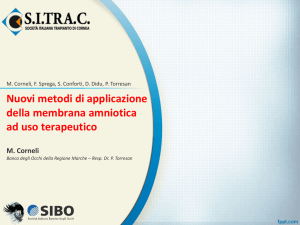 LA MEMBRANA AMNIOTICA: UTILIZZO IN OCULISTICA MEMBRANA AMNIOTICA COSTITUITA DA UN SINGOLO STRATO DI CELLULE EPITELIALI CHE POGGIANO SU DI UNA MEMBRANA BASALE CHE A SUA VOLTA SI CONTINUA CON UNO STROMA AVASCOLARE MACROSCOPICAMENTE SI PRESENTA COME UN SOTTILE FOGLIETTO TRASPARENTE ELASTICO E RESISTENTE MEMBRANA AMNIOTICA APPLICAZIONE La membrana amniotica viene fissata generalmente con suture riassorbibili. La membrana amniotica si riassorbirà spontaneamente Il trattamento postoperatorio consiste nell'utilizzo di farmaci antibiotici. Non ci sono rischi particolari né effetti collaterali significativi; i disagi sono limitati. In molti casi occorre però ripetere il trattamento più volte (ulcere recalcitranti) e combinarlo all'utilizzo di una lente a contatto terapeutica ad uso permanente MEMBRANA AMNIOTICA PROPRIETA’ TESSUTO NON IMMUNOGENIGO PUO’ ESSERE TRAPIANTATO SENZA BISOGNO DI TERAPIA IMMUNOSOPPRESSIVA E SENZA RISCHIO DI RIGETTO. HA PROPRIETA’ ANTIADESIVE BATTERIOSTATICHE ANTIFLOGISTICHE RIDUCE L’ANGIOGENESI INIBISCE I FIBROBLASTI RIDUCENDO LA FORMAZIONE DI CICATRICI PREVIENE LA DEGRADAZIONE DEL COLLAGENE FAVORISCE LA RIEPITELIZZAZIONE MEMBRANA AMNIOTICA CAMPI DI UTILIZZO NELLA PATOLOGIA DELLA SUPERFICIE OCULARE RICOSTRUZIONE DELLA CONGIUNTIVA TRATTAMENTI DEI DIFETTI EPITELIALI CORNEALI RESISTENTI AL TRATTAMENTO TRATTAMENTO DELLE ULCERE CORNEALI TORPIDE NON INFETTIVE TRATTAMENTO DELLE CHERATALGIE PER ALLEVIARE IL DOLORE PLASTICA CONGIUNTIVALE Es. nelle USTIONI OCULARI con RETRAZIONI CONGIUNTIVALI ricostruzione della congiuntiva per ristabilire la corretta motilità oculare e chiusura palpebrale. >>>la membrana amniotica può rappresentare una alternativa alla congiuntiva dell’occhio adelfo e alla mucosa buccale, generalmente usati per la ricostruzione. Condizioni necessarie: La reazione cicatriziale ed infiammatoria devono essere silenti Presenza di congiuntiva sana per la colonizzazione della membrana innestata. DIFETTI EPITELIALI CORNEALI PERSISTENTI E ULCERE TROFICHE NON INFETTIVE 1. 2. 3. Presenta PROPRIETA’ TROFICHE PER L’EPITELIO CORNEALE Favorisce LA MIGRAZIONE E LA ADESIONE DELLE CELLULE EPITELIALI (grazie alle caratteristiche della membrana basale) Svolge UN RUOLO DI PROTEZIONE FISICA (no bendaggio né lac). Condizioni necessarie: Escludere la natura infettiva Limbus preservato per la rigenerazione dell’epitelio ULCERA CORNEALE TRATTAMENTO DEL DOLORE DA PATOLOGIA CORNEALE PUO’ RAPPRESENTARE UN ECCELLENTE RIMEDIO CONTRO IL DOLORE SECONDARIO CHERATOPATIA DI VARIA NATURA CHE PROVOCA INFIAMMAZIONE O ESPOSIZIONE DELLE TERMINAZIONI NERVOSE CORNEALI. Conclusioni La membrana amniotica ci consente di trattare senza alcun rischio >>--difetti epiteliali persistenti >>--ulcere corneali non infettive Nella ricostruzione congiuntivale la membrana amniotica funziona come substrato per la crescita di cellule residenti (è necessario che il tessuto attorno all’innesto sia trofico). E’ un utilissimo bendaggio temporaneo della cornea quando non si vuole ricorrere all’uso di LAC, di TARSORRAFIA o al RICOPRIMENTO CONGIUNTIVALE.