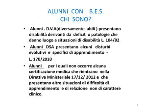 Bisogni Educativi Speciali S.C. di NEUROPSICHIATRIA dell’INFANZIA e dell’ADOLESCENZA Direttore Dr. Marco Rolando Dr.ssa Silvia Giordani Bussoleno, 30 settembre 2013 CAPACITA’ RELAZIONALI AMBIENTE SOCIO-CULTURALE DISPONIBILITA ’ EMOTIVA ISTRUZIONE SCOLASTICA AMBIENTE FAMILIARE DOTAZIONE COGNITIVA EQUILIBRIO AFFETTIVO (umore) CARATTERISTICHE DI PERSONALITA’ Modello biopsicosociale (Engel, 1977) Ogni condizione di salute o di malattia è la conseguenza dell’interazione tra fattori biologici, psicologici e sociali. Modello biopsicosociale (Engel, 1977) Ogni condizione di salute o di malattia è la conseguenza dell’interazione tra fattori biologici, psicologici e sociali. Approccio globale alla malattia e al trattamento. Modello biopsicosociale (Engel, 1977) Ogni condizione di salute o di malattia è la conseguenza dell’interazione tra fattori biologici, psicologici e sociali. Approccio globale alla malattia e al trattamento. Funzionamento biologico Insieme delle funzioni degli organi periferici e del SNC Modello biopsicosociale (Engel, 1977) Ogni condizione di salute o di malattia è la conseguenza dell’interazione tra fattori biologici, psicologici e sociali. Approccio globale alla malattia e al trattamento. Funzionamento biologico Insieme delle funzioni degli organi periferici e del SNC Funzionamento psicologico Caratteristiche di personalità, stato affettivo e cognitivo Modello biopsicosociale (Engel, 1977) Ogni condizione di salute o di malattia è la conseguenza dell’interazione tra fattori biologici, psicologici e sociali. Approccio globale alla malattia e al trattamento. Funzionamento biologico Insieme delle funzioni degli organi periferici e del SNC Funzionamento psicologico Caratteristiche di personalità, stato affettivo e cognitivo Funzionamento sociale Comportamento della persona in relazione alla famiglia, agli amici, al contesto socio-culturale ICF - Classificazione Internazionale del Funzionamento, della Disabilità e della Salute Modello di riferimento per la descrizione del funzionamento e della disabilità associati alle condizioni di salute (malattie, disturbi, lesioni, traumi, ecc.). ICF - Classificazione Internazionale del Funzionamento, della Disabilità e della Salute Modello di riferimento per la descrizione del funzionamento e della disabilità associati alle condizioni di salute (malattie, disturbi, lesioni, traumi, ecc.). Il funzionamento e la disabilità di una persona sono concepiti come un’interazione dinamica tra le condizioni di salute e i fattori contestuali (fattori personali e ambientali – facilitatori o barriere). ICF - Classificazione Internazionale del Funzionamento, della Disabilità e della Salute Modello di riferimento per la descrizione del funzionamento e della disabilità associati alle condizioni di salute (malattie, disturbi, lesioni, traumi, ecc.). Il funzionamento e la disabilità di una persona sono concepiti come un’interazione dinamica tra le condizioni di salute e i fattori contestuali (fattori personali e ambientali – facilitatori o barriere). Distinzione tra capacità e performances. ICF - Classificazione Internazionale del Funzionamento, della Disabilità e della Salute Modello di riferimento per la descrizione del funzionamento e della disabilità associati alle condizioni di salute (malattie, disturbi, lesioni, traumi, ecc.). Il funzionamento e la disabilità di una persona sono concepiti come un’interazione dinamica tra le condizioni di salute e i fattori contestuali (fattori personali e ambientali – facilitatori o barriere). Distinzione tra capacità e performances. “Ogni persona, in qualunque momento della vita, può avere una condizione di salute che in un contesto sfavorevole diventa disabilità.” Direttiva MIUR 27/12/2012 Attenzione al funzionamento della persona nel suo contesto. Riferimento al modello ICF e alla prospettiva biopsicosociale. Spostamento del focus dalla disabilità intesa come menomazione fisica o psichica ai bisogni dell’ambiente e della persona. Ridefinizione del tradizionale approccio all’integrazione scolastica, basato sulla certificazione della disabilità. Direttiva MIUR 27/12/2012 “L’area dello svantaggio scolastico è molto più ampia di quella riferibile esplicitamente alla presenza di deficit. In ogni classe ci sono alunni che presentano una richiesta di speciale attenzione per una varietà di ragioni” Attenzione al funzionamento della persona nel suo contesto. Riferimento al modello ICF e alla prospettiva biopsicosociale. Spostamento del focus dalla disabilità intesa come menomazione fisica o psichica ai bisogni dell’ambiente e della persona. Ridefinizione del tradizionale approccio all’integrazione scolastica, basato sulla certificazione della disabilità. Direttiva MIUR 27/12/2012 Bisogni educativi speciali (Special Educational Needs) Disabilità Disturbi evolutivi specifici Svantaggio socioeconomico, linguistico, culturale Direttiva MIUR 27/12/2012 Bisogni educativi speciali (Special Educational Needs) Disabilità Disturbi evolutivi specifici Svantaggio socioeconomico, linguistico, culturale Direttiva MIUR 27/12/2012 Bisogni educativi speciali (Special Educational Needs) Disabilità (L.104/92) • • • • • Patologie neurologiche organiche Ritardi cognitivi Disturbi dello spettro autistico Deficit sensoriali Gravi disturbi della condotta Direttiva MIUR 27/12/2012 Bisogni educativi speciali (Special Educational Needs) Disabilità Disturbi evolutivi specifici Svantaggio socioeconomico, linguistico, culturale Direttiva MIUR 27/12/2012 Bisogni educativi speciali (Special Educational Needs) Disabilità Disturbi evolutivi specifici Svantaggio socioeconomico, linguistico, culturale Direttiva MIUR 27/12/2012 Bisogni educativi speciali (Special Educational Needs) Disturbi evolutivi specifici • Disturbi specifici • DSA • Disturbi specifici del linguaggio • Disturbo della coordinazione motoria • Altre problematiche severe che possono compromet