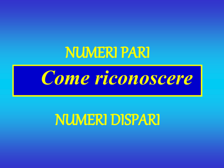 NUMERI PARI Come riconoscere E NUMERI DISPARI Colora di giallo tutti i multipli di due Essere multiplo di due significa avere come divisore il due. 2 0 Quando cioèsitermina una cifra che è Un numero dice paricon quando la cifra PARI 2, 4, 6, 8. delle unità è 0, 6 8 4 I numeri rimasti non colorati sono numeri dispari OSSERVA BENE!! 1 5 Un numero si dice dispari Quando cioè termina con una quando la cifra delle unità è cifra che è DISPARI 1, 3, 5, 7, 9. 7 9 3 Ecco 4 mele Il numero pari è perfettamente divisibile a metà Ecco 5 mele Il numero si dice dispari quando non è divisibile perfettamente a metà Come si comportano i numeri Pari + pari = pari BRAVO! 2+4=6 2 + 6 4 Come si comportano i numeri Pari + dispari = dispari BENE!! 2+3=5 2 + 5 3 Come si comportano i numeri Dispari + Pari = Dispari GIUSTO!! 3+2=5 3 + 5 2 Come si comportano i numeri Dispari + dispari = pari PERFETTO! 3+1=4 3 + 4 1 + P D P P D D D P