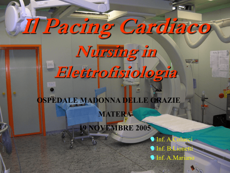 Il Pacing Cardiaco Nursing in Elettrofisiologia OSPEDALE MADONNA DELLE GRAZIE MATERA 19 NOVEMBRE 2005 Inf. A.Colucci Inf. B.Lionetti Inf. A.Mariano IL PACING CARDIACO E’ LA STIMOLAZIONE COSTANTE ED EFFICACE DELLA DEPOLARIZZAZIONE CARDIACA IN ARMONIA CON IL RITMO CARDIACO NATURALE. ATTIVAZIONE NORMALE DEL CUORE Nodo del seno Atrio sin onda P onda T Atrio dx Ventr. sinistro Nodo AV Branca destra Ventr. dx Complesso QRS Branca sinistra Nodo del seno Atrio sin onda P onda T Atrio dx Ventr. sinistro Nodo AV Branca destra Ventr. dx Complesso QRS Branca sinistra Nodo del seno Atrio sin onda P onda T Atrio dx Ventr. sinistro Nodo AV Branca destra Ventr. dx Complesso QRS Branca sinistra QUANDO SI ESEGUE IL PACING? IN QUALSIASI EVENTO IN CUI IL PACEMAKER NATURALE CARDIACO E’ ECCESSIVAMENTE LENTO O INAFFIDABILE E NON RISPONDE AL TRATTAMENTO FARMACOLOGICO. CLASSIFICAZIONE Pacing invasivi Pacing epicardico Pacing transesofageo Pacing transvenoso temporaneo Pacing transvenoso definitivo Pacing non invasivi Pacing transcutaneo Percussion pacing PERCUSSION PACING Quando si applica? Asistolia ventricolare con onde P presenti sul tracciato Nella pratica poco utilizzato . Come si applica ? Somministrare colpi leggeri a livello del precordio sulla parete inferiore del margine sternale sinistro. IL PACING TRANSCUTANEO Utilizzato frequentemente nel trattamento delle bradiaritmie spinte e nelle asistolie in situazioni di emergenza. VANTAGGI SVANTAGGI SCARSA TOLLERABILITA’ PARAMEDICI MINIMO ADDESTRAMENTO TEMPI RAPIDI FACILE SECUZIONE BASSA % COMPLICANZE Cosa occorre ? Monitor defibrillatore-stimolatore Placche pregellate multiuso MONITOR MULTIFUNZIONE in modalità stimolazione POSIZIONAMENTO PLACCHE ANTERO-POSTERIORE (solo pacing) Placca anteriore posizionata sul torace a sx, a metà strada tra l’apofisi xifoide e il capezzolo sx in corrispondenza della sede V2V3. Placca posteriore posizionata subito sotto la scapola sx lateralmente alla colonna vertebrale, allo stesso livello di quella anteriore. ANTERO-LATERALE (defibrillazione e pacing) Placca anteriore posizionata al di sotto della clavicola dx. Placca laterale posizionata sulla linea ascellare media all’altezza del capezzolo sx, posizione V6. PLACCHE PREGELLATE MULTIUSO PROCEDURA RIMOZIONE PELI (NO TRICOTOMIA) PULIRE ED ASCIUGARE LA CUTE APPLICARE LE PLACCHE MULTIUSO (ANTEROLATERALE) SELEZIONARE LA MODALITA A DOMANDA/FISSA IMPOSTARE FREQUENZA (60/90 b/m) REGOLARE AL MINIMO L’ENERGIA mA( 50-100 mA) ACCENDERE LO STIMOLATORE AUMENTARE L’ENERGIA SINO A QUANDO SUL MONITOR COMPARE LO SPIKE SEGUITO DA UN COMPLESSO QRS LARGO E DA UNA ONDA T. APPREZARE LA PRESENZA DI UN POLSO CENTRALE/PERIFERICO PACING EPICARDICO La stimolazione epicardica può essere atriale, ventricolare o coinvolgere entrambe le camere. Utilizzata in cardiochirurgia nel trattamento delle bradiaritmie e nella prevenzione delle F.A post-operatorie . PACING TRANSESOFAGEO Utilizzato in prevalenza per applicazioni cliniche diagnostiche, valutazione della conduzione A-V e come terapia d’urgenza per alcuni tipi di tachicardie sopraventricolari (Overdrive pacing) PACING TRANSESOFAGEO ELETTROCATETERE TRANSESOFAGEO CENTRALINA DI CONNESSIONE POLIGRAFO STIMOLATORE PROCEDURA Introdurre l’elettrocatetere per via nasofaringea Invitare il pz a deglutire Connettere l’elettrocatetere alla centralina Verificare sul monitor la presenza dell’elettrogramma Accendere lo stimolatore esterno dopo averlo impostato. Catetere decapolare intraesofageo PACING TEMPORANEO TRANSVENOSO L’impianto di uno stimolatore temporaneo si rende necessario in molte patologie ritenute transitorie come l’intossicazione da digitale, nelle complicanze dell’IMA, nei blocchi atrio-ventricolari oltre come terapia d’emergenza. MATERIALE OCCORENTE Stimolatore Cateteri Pile Introduttori vario Fch Aghi angiografici Anestetico locale Materiale sterile vario Sol.antisettica iodata Siringhe (5cc/10cc) Farmaci per l’urgenza Strumentario per isolare vena a cielo aperto PROCEDURA Incanulare una vena di grosso calibro mediante tecnica Seldinger (femorale,succlavia) Posizionare l’introduttore Successivamente infilare il catetere e sotto il controllo radioscopico farlo scorrere sino a raggiungere l’apice del vdx Si collega il catetere allo stimolatore e si procede con la stimolazione partendo da una soglia bassa e aumentando poco per volta fin quando compare lo spike sul monitor e relativo QRS largo seguito da un’onda T. Il catetere viene fissato, applica una medicazione sterile e si invia il pz al reparto di competenza. (monitoraggio ecg,Pa) PACING TRANSVENOSO DEFINITIVO COS’ E’ UN PACEMAKER ? Il termine pacemaker deriva dall’unione di: – pace = passo – maker = generatore E’ una protesi cardiaca per il ripristino ed il mantenimento della normale attività cardiaca. E’ un dispositivo elettronico che emette impulsi elettrici che, condotti al cuore attraverso un “filo” (elettrocatetere), lo stimolano artificialmente. IL PACEMAKER Blocco di connessione Connettore Atriale I/O Connettore Ventricolare I/O Protezione da Defibrillatore Circuito Batteria Antenna della Telemetria INDICAZIONI AD IMPIANTO DI PACEMAKER ANOMALIA DELLA GENERAZIONE DELL’IMPULSO Bradicardia sinusale (< 40/min durante veglia) Incompetenza cronotropa (< 100/min da sforzo) 1 sec Pausa sinusale (> 3 sec) 1 sec BRADIARITMIE: MALATTIA DEL NODO DEL SENO Nodo del seno Nodo AV Bradicardia sinusale; Blocco seno atriale INDICAZIONI AD IMPIANTO DI PACEMAKER Disfunzione del sistema di conduzione elettrico BAV totale, blocco atrio-ventricolare avanzato, BAV II grado Mobitz 2, blocco trifascicolare (BBD alt. a BBS, BBD+EAS al a BBD+EPS, blocco bifascicolare con sincope 1 sec ( 3 sec durante veglia) BRADIARITMIE: BLOCCO ATRIOVENTRICOLARE Nodo del seno Blocco atrio-ventricolare soprahisiano (BAV I, II grado LW); QRS stretto Blocco atrio-ventricolare sottohisiano (BAV II Mobitz 2 o avanzato, III grado); QRS largo) Nodo AV Fascio di his IL PACEMAKER Funz
