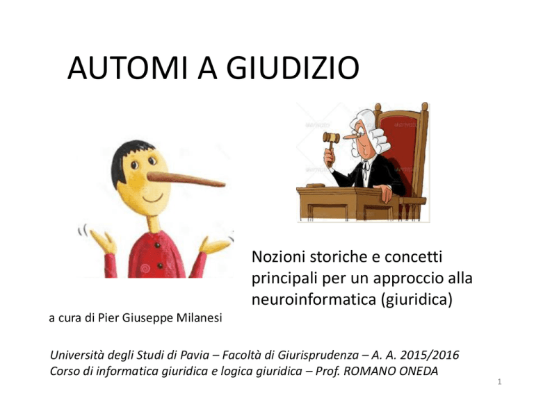 AUTOMI A GIUDIZIO Nozioni storiche e concetti principali per un approccio alla neuroinformatica (giuridica) a cura di Pier Giuseppe Milanesi Università degli Studi di Pavia – Facoltà di Giurisprudenza – A. A. 2015/2016 Corso di informatica giuridica e logica giuridica – Prof. ROMANO ONEDA 1 L’INTEGRAZIONE UOMO/MACCHINA - 1 PREMESSA E’ indubbio che in futuro robot e softbot interagiranno sempre più strettamente con gli esseri umani, non solo condizionandone i comportamenti (e perciò «automatizzando» l’umano), ma addirittura guadagnando sempre più livelli di autonomia nel momento stesso in cui le macchine saranno in grado di operare sulla base di metodologie di apprendimento non supervisionato, ossia in modo sempre più autonomo e induttivo. Valutazione dell’apprendimento. Il problema, prima ancora che sul piano tecnico, può essere proposto in termini epistemologici, se non addirittura «pedagogici» (nel caso specifico si dovrebbe parlare di … automatagogici!). La domanda è: che cosa significa «corretto apprendimento»? prevedendo in tal modo che l’automa possa conseguire un «diploma» che ne attesti il buon livello di preparazione utile a svolgere particolari mansioni. Il PAC-learning (Probably Approximately Correct learning) è una procedura matematica di analisi dell’apprendimento meccanico introdotto nel 1984 da L. Valiant e successivamente perfezionato in conseguenza dei livelli di complessità degli automi. 2 L’INTEGRAZIONE UOMO/MACCHINA - 2 PREMESSA Questioni etico- giuridiche. Un soggetto può essere definito «responsabile» di x solo se ha il pieno controllo su x. L’attribuzione di responsabilità ad una macchina che apprende è una recente acquisizione del diritto all’interno di una più vasta problematica sulla responsabilità in cui la catena causale che provoca un danno non è chiaramente riconoscibile per cui nessun soggetto è palesemente identificabile come «colpevole» Sul piano canonico, l’attribuzione di responsabilità che più si avvicina al caso degli automi sarebbe assimilabile alla «responsabilità del tutore» o del genitore nei confronti del minore o del possessore di animali per i danni che questi soggetti possano arrecare. Tuttavia, trattandosi di macchine – e perciò in ultima istanza prodotti che vengono fabbricati e venduti – la catena di responsabilità diventa più complessa anche in nome del principio storico ubi commoda, ibi incommoda (chi ricava dei vantaggi, deve farsi carico anche degli svantaggi.) Si può parlare in questo caso di responsabilità retrospettiva. Tuttavia, a seguito dell’incremento del grado di autonomia degli automi che loro di operare scelte elaborando una «propria esperienza» - anche sulla base di una capacità di calcolo superiore alla nostra – il discorso sulla «responsabilità» si fa estremamente più complesso. 3 AUTOMI - 1 CONCETTI Un automa è una macchina in grado di operare da sola oppure una macchina a meccanismo controllato, studiata per eseguire un numero determinato di operazioni in risposta ad istruzioni predeterminate. L’automa consiste di stati e transizioni. A fronte di un segno di input, l’automa compie una transizione ad un altro stato, secondo una funzione di transizione. La teoria degli automi è strettamente connessa con la teoria dei linguaggi formali. Un automa è la rappresentazione finita di un linguaggio formale che può aspirare a infinite configurazioni. Per questo sono spesso classificati a seconda della classe di linguaggi che sono in grado di riconoscere. La caratteristica-base di queste macchine è che accettano un set finito di input e producono un set finito di output e possono presentare un determinato set di stati la cui definizione dipende dal tipo di automa. Automa a stati finiti. Un automa di questo tipo è di tipo deterministico, caratterizzato da stati che contengono un numero finito di elementi ; è in grado di gestire una quantità di memoria che non è però in grado di conservare. Un banale esempio può essere offerto da un distributore di bevande che riceve monetine (input) e può presentare 3 stati a) monete insufficienti b) monete sufficienti con distribuzione di bevanda c) monete eccedenti con distribuzione di bevande e restituzione della somma eccedente. 4 CONCETTI AUTOMI - 2 Macchina di Turing. Descrive un automatismo computazionale che sta alla base della architettura dei moderni computer. Essa è costituita da una testina scorrevole nei due sensi su un nastro costituito da un numero infinito di celle contenente simboli di un alfabeto (ad esempio binario) con cui la testina opera - in modalità lettura/scrittura/cancellazione/sostituzione. Ogni posizione della testina corrisponde ad uno «stato» della macchina associato alle istruzioni circa l’operazione che la testina deve eseguire su quella cella e allo spostamento verso un’altra cella (o stato) Il gioco della vita. E’ la versione più nota di un «automa cellulare». Rappresenta un implementazione della macchina di Turing. E’ un gioco nel senso che è la macchina che gioca di sola modificando i propri stati a seconda della configurazione assunta dallo stato precedente. Le singole cellule nascono, muoiono, si conservano in base a dei parametri determinati dal rapporto con le cellule più vicine. 5 IL CONCETTO DI «APPRENDIMENTO» CONCETTI Cosa significa «apprendere». Apprendere significa avere la possibilità di modificare le proprie risposte comportamentali a seguito della interazione con l’ambiente. Queste modificazioni, sulla base della esperienza, tendono infine a costruire o a consolidare schemi generali di risposta a determinati set di impulsi ambientali. E’ un processo complesso, non riconducibile alla sola capacità di reagire ad uno stimolo o di conservare una esperienza. «Apprendere» significa piuttosto «far tesoro» della passata esperienza per poter gestire l’esperienza stessa in modo tale da perseguire, in tempi sempre più rapidi, degli ob