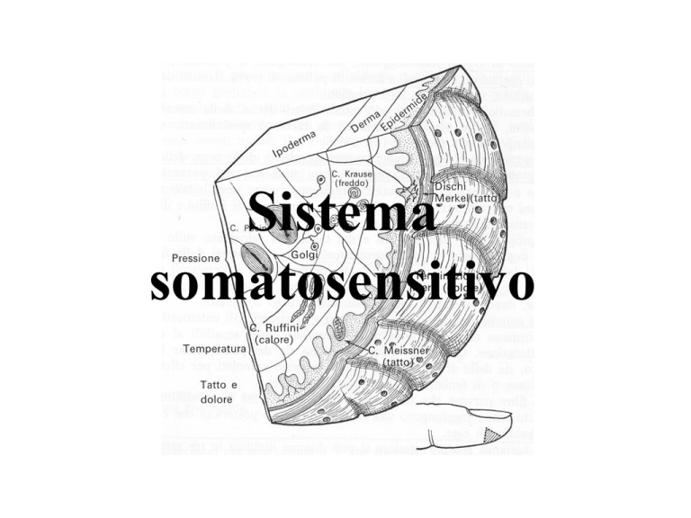 Sistema somatosensitivo Sensi somatici Sono quelli che si trovano distribuiti su tutto il corpo. Sono associati ai visceri, alla pelle, ai muscoli e alle articolazioni. Essi includono: • Tatto • Pressione • Propriocezione • Temperatura • Dolore Tatto e Pressione: I recettori tattili e pressori sono dei meccanocettori, ampiamente distribuiti nella pelle. Tre dei recettori coinvolti nel tatto e nella pressione sono: Terminazioni nervose libere Terminazioni dendritiche di neuroni sensoriali, interposte tra le cellule epiteliali della pelle: importanti per la percezione degli oggetti che sono a contatto con la pelle e sopratutto per la percezione del dolore. Corpuscoli di Meissner consistono in terminazioni di nervi sensoriali circondate da tessuto connettivo; sensibili alle sensazioni tattili localizzate: importanti nella percezione di leggeri stimoli tattili discriminativi. Corpuscoli del Pacini Corpuscoli lamellari, circondati da diversi strati di tessuto connettivo; comuni nel derma profondo e nel tessuto sottocutaneo, nei tendini e nei legamenti; stimolati da forti pressioni. A livello cutaneo esistono recettori specifici per svariati tipi di stimoli Si tratta di terminazioni nervose libere eventualmente munite di cellule accessorie Corpuscolo di Meissner Corpuscolo di Pacini capsula Manicotto di mielina Singola fibra nervosa Temperatura: I termocettori sono localizzati immediatamente al di sotto della pelle e sono ampiamente distribuiti; includono due tipi di terminazioni nervose per la percezione delle variazioni di temperatura: • Recettori per il caldo • Recettori per il freddo. • Temperature < 10° C e >25° C stimolano recettori dolorifici. Dolore: Il senso del dolore è generato dai nocicettori, che sono terminazioni nervose libere stimolate da un danneggiamento del tessuto; ampiamente distribuiti sulla pelle e nei tessuti degli organi interni. Essi hanno una funzione protettiva poichè il dolore è generalmente percepito come una sensazione spiacevole ed è un segnale per localizzare e rimuovere la causa del danneggiamento. Possono venir attivati da stimoli meccanici, termici, chimici Sono gli unici che mancano di adattamento Propriocezione: È il senso della postura; permette di percepire la localizzazione e la velocità del movimento di una parte del corpo rispetto ad un’altra. • Organi tendinei del Golgi, si trovano a livello delle giunzioni dei tendini con i muscoli. • Fusi muscolari, localizzati nei muscoli scheletrici, sono importanti meccanocettori propriocettivi. Come viene trasformata l’energia meccanica in energia elettrica dai recettori tattili? Prendiamo come esempio un corpuscolo di Pacini 1a fase: lo stimolo meccanico (pressione) deforma la membrana del corpuscolo 2a fase: si aprono dei canali cationici, il Na+ entra e si depolarizza il recettore 3a fase: se il potenziale del recettore generato nel segmento iniziale è sopra soglia,vengono generati dei potenziali d’azione che si propagano lungo l’assone segmento iniziale assone soglia recettore pressione Potenz d’azione/sec Come viene codificata l’ampiezza dello stimolo? pressione soglia i) Mediante una codificazione in frequenza: Maggiore è la pressione, tanto più il recettore depolarizza, tanto maggiore è il numero di potenziali d’azione /secondo che sono generati. Per questo a livello dell’encoder sono necessari canali KA ii) Dal numero di fibre reclutate: Tante più fibre nervose raggiungono la soglia quanto maggiore è la pressione applicata Saturazione legge di Weber-Fechner Potenz d’azione/sec S=K ln(I/I) pressione soglia Notare che la relazione tra il numero di potenziali d’azione per secondo (frequenza) e la pressione è non lineare: tende a saturare per pressioni elevate. Pertanto il cambiamento nel n. di PdA/s tra 1 e 2 gm è più grande che tra 100 e 101 gm. Definizione di campo recettivo di un neurone è quell’area recettoriale la cui stimolazione modifica la frequenza di scarica del neurone stesso A B molte cellule dei NCD poche cellule dei NCD molti a 1 1a1 campo recettivo campo recettivo Campo recettivo piccolo Campo recettivo grande grande discriminazione tattile bassa discriminazione tattile NCD ≡ Nuclei delle colonne dorsali (bulbo) Adattamento nei meccanocettori Stimolo Adattamento lento (AL) Adattamento rapido (AR) Con l’adattamento il numero di PdA/s si riduce nel tempo. Ciò avviene in parte perché si adatta il potenziale del recettore a causa di modificazioni meccaniche, e in parte per la presenza a livello dell’encoder di canali del K+ Ca2+-attivati. L’adattamento aumenta la percezione dei cambiamenti di pressione. Così, ad es., la pressione costante degli abiti sul corpo non viene quasi più percepita. Esistono recettori ad adattamento rapido ed altri ad adattamento lento Adattamento Adattamento rapidolento Pelo Recettori di superficie/piccolo c. r. Recettori profondi/grande c. r. Recettori piliferi o Recettori del Meissner Corpuscoli del Pacini La sensazione è quella di una vibrazione Attivati da vibrazioni diffuse – ad es. il tocco della punta di una matita AR localizzata Usati per riconoscere la composizione di un oggetto Dischi del Merkel Usati per la percezione fine dei bordi delle AL superfici Corpuscoli del Ruffini Attivati dallo stiramento della pelle – usati per segnalare la posizione delle articolazioni delle dita Esperimento di percezione della struttura di un oggetto Prendete due fogli di carta vetro di ruvidità diversa Sfregando la punta delle dita sulla superficie potete facilmente distinguere quale dei due fogli è più ruvido. Lo sfregamento è necessario per attivare i recettori del Meissner ad adattamento rapido. Lo sfregamento produce vibrazioni quando i grani passano ripetitivamente su ciascun recettore. I recettori del Meissner hanno piccoli campi recettivi e quindi una discriminazione spaziale fine. Adesso piazzate la punta delle dita stabilmente su ciascun foglio. Noterete che è più difficile stabilire qua