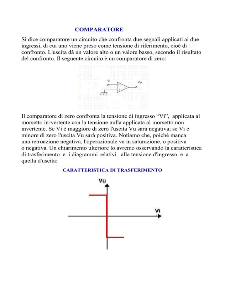 COMPARATORE Si dice comparatore un circuito che confronta due segnali applicati ai due ingressi, di cui uno viene preso come tensione di riferimento, cioè di confronto. L'uscita dà un valore alto o un valore basso, secondo il risultato del confronto. Il seguente circuito è un comparatore di zero: Il comparatore di zero confronta la tensione di ingresso “Vi”, applicata al morsetto in-vertente con la tensione nulla applicata al morsetto non invertente. Se Vi è maggiore di zero l'uscita Vu sarà negativa; se Vi è minore di zero l'uscita Vu sarà positiva. Notiamo che, poiché manca una retroazione negativa, l'operazionale va in saturazione, o positiva o negativa. Un chiarimento ulteriore lo avremo osservando la caratteristica di trasferimento e i diagrammi relativi alla tensione d'ingresso e a quella d'uscita: CARATTERISTICA DI TRASFERIMENTO DIAGRAMMA DI TENSIONI Per realizzare un comparatore con tensione di riferimento diversa da zero, basta collegare un generatore di tensione al morsetto non invertente, secondo il seguente schema: da tale schema si vede che la commutazione avviene quando la Vi è maggiore o minore della tensione di riferimento Vr , come vediamo dai seguenti diagrammi: COMPARATORI DI LIVELLO: CARATTERISTICA DI TRASFERIMENTO DIAGRAMMA TENSIONI Tale tipo di comparatore è molto semplice, tuttavia presenta l'inconveniente di essere molto sensibile ai disturbi. TORNA AL SOMMARIO