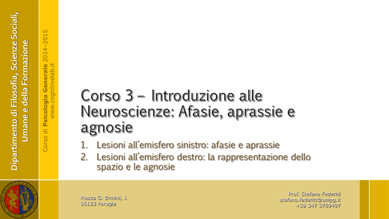 Corso di Psicologia Generale 2014–2015 www.cognitivelab.it Dipartimento di Filosofia, Scienze Sociali, Umane e della Formazione 1. 2. Lesioni all’emisfero sinistro: afasie e aprassie Lesioni all’emisfero destro: la rappresentazione dello spazio e le agnosie Piazza G. Ermini, 1 06123 Perugia Prof. Stefano Federici [email protected] +39 347 3769497 Lesioni all’emisfero sinistro: afasie e aprassie 2 Afasie e Aprassie Agnosie 3 › L’emisfero dominante svolge i compiti più importanti nel coordinare e dirigere una successione di azioni che, prese tutte insieme, costituiscono un comportamento finalizzato. – Una lesione della parte posteriore dell’area 5 del lobo parietale dell’emisfero dominante altera molto più gravemente l’esecuzione di risposte motorie apprese (aprassia) di quanto non faccia una identica lesione localizzata nell’emisfero non dominante. – Analogamente, una lesione della regione frontale dell’emisfero dominante può alterare profondamente l’esecuzione di movimenti fini, finalizzati, di entrambe le mani. 4 › Paul Broca(1824–1880) e altri studiosi osservarono che le persone con lesioni all’emisfero sinistro manifestavano la perdita delle abilità di verbalizzazione molto più spesso dei soggetti che avevano subito un danno analogo all’emisfero destro. – Di frequente le persone con lesioni all’emisfero sinistro non sono più in grado di sviluppare discorsi coerenti o di comprendere ciò che gli altri dicono, pur conservando intatte le capacità sensoriali e motorie. › Mentre era all’apice della carriera, il compositore russo Shebalin fu colpito da un ictus (la rottura di un vaso sanguigno entro i distretti cerebrali), che gli procurò un danno permanente a una porzione della corteccia dell’emisfero sinistro. – Da quel momento Shebalin ebbe sempre gravi difficoltà a esprimersi verbalmente e a comprendere i discorsi degli altri, ma continuò a creare grande musica. › La sua Quinta sinfonia, composta dopo essere stato colpito dall’ictus, fu definita dal grande compositore Dmitri Shostakovic «un brillante lavoro creativo, da cui traspaiono le emozioni più elevate, grande ottimismo e una forte carica vitale» (Gardner, 1974). 5 6 L’emiparesi e l’emianopsia associate alle afasie • Tratto da: Basso, A. (2003). Le afasie. 7 Tratto da: Basso, A. (2003). Le afasie. 8 › Carl Wernicke(1848–1905) nel 1876 descriveva un nuovo tipo di afasia – L’afasia di Wernicke è caratterizzata da un disturbo della comprensione del linguaggio e non della pronuncia delle parole. – Mentre i pazienti di Broca capivano ma non riuscivano a parlare, quelli di Wernicke parlavano ma non riuscivano a capire. – Il nuovo tipo di afasia era dovuto a lesioni della parte posteriore del lobo temporale dove questo si unisce al lobo parietale e a quello occipitale. 9 10 Tratto da: Basso, A. (2003). Le afasie. 11 › L’aprassia è un disturbo neurologico del movimento complesso che non si spiega con deficit dei sistemi motori elementari o sensoriali (Rothi & Heilman, 1997). – L’aprassia è considerata indipendente da altri sintomi quali l’emiplegia o deficit visivi come l’emianopsia o la negligenza. 12 › L’aprassia è l’incapacità di compiere un movimento mirato a uno scopo, pur essendo integre l’intelligenza e la motilità, e pur rendendosi il paziente pienamente conto di quel che deve fare. – L’aprassia ideativa o d’uso l’incapacità di compiere azioni successive con diversi oggetti per raggiungere un determinato scopo come servire a tavola. – Le aprassie ideomotorie difficoltà di scegliere gli elementi motori che costituiscono un movimento, con un ordinamento sequenziale corretto come sfilarsi una calza. › L’aprassia per l’abbigliamento, cioè l’incapacità di vestirsi ordinatamente, risulta generalmente da una lesione del lobo parietale destro. 13 Aprassia orale (bucco-facciale) • incapacità di compiere movimenti volontari della lingua e delle labbra. Aprassia degli arti • Incapacità di compiere con l’arto sano gesti intenzionali se non coerenti con il contesto. Aprassia d’uso • Incapacità nell’uso di utensili. Dissociazione automaticovolontaria • Il gesto è compiuto correttamente se coerente con il contesto. • 14 Tratto da: Basso, A. (2003). Le afasie. Lesioni all’emisfero destro: la rappresentazione dello spazio e le agnosie 15 › Come gli oggetti accessibili mediante i sensi o mnemonici vengono rappresentati al nostro interno? Verranno indagati: – Lo spazio personale che è la rappresentazione neurale della superficie corporea. – Lo spazio peripersonale che è lo spazio che può essere raggiunto con un semplice movimento del braccio – Lo spazio extrapersonale che comprende lo spazio, più vasto, formato dall’ambiente circostante – Rappresentazioni immaginarie o mnemoniche dello spazio relazioni spaziali generate a livello della corteccia associativa del lobo parietale posteriore. 16 › La corteccia cerebrale possiede una mappa del corpo per ciascuna delle modalità somatosensitive. A livello della corteccia somatosensitiva primaria esistono ben 4 mappe quasi complete, ognuna delle quali è localizzata in una della quattro aree di Brodmann 1, 2, 3a e 3b. – Tutto ciò permette di spiegare perché una lesione circoscritta all’area 1 provochi deficit delle capacità discriminative tattili, mentre un piccola lesione dell’area 2 interferisca con la capacità di riconoscere le caratteristiche della superficie e della forma degli oggetti manipolati. 17 18 › La rappresentazione interna dello spazio personale è modificabile dall’esperienza: – In scimmie che venivano addestrate a toccare un disco rotante con il dito medio per ottenere pezzetti di cibo come ricompensa, l’uso della punta del dito rafforzava ed espandeva le connessioni fra le regioni cutanee stimolate e la corteccia. – Dopo la deafferentazione mediante sezione di tutti i nervi sensitivi dell’arto superi
