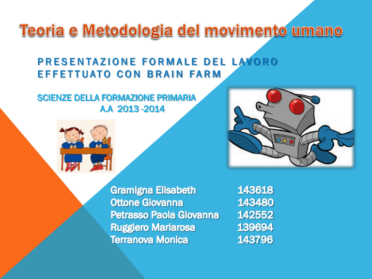 P R E S E N TA Z I O N E F O R M A L E D E L L AVO RO E F F E T T U ATO C O N B R A I N FA R M SCIENZE DELLA FORMAZIONE PRIMARIA A.A 2013 -2014 ROBOTICA EVOLUTIVA La robotica è una scienza che si occupa di studiare e sviluppare metodologie che permettano a un robot o ad un agente di eseguire i compiti specifici. Gli agenti intelligenti e robot sono studiati dall’intelligenza artificiale, ovvero quel settore dell’informatica che riproduce in un computer quei tipi di comportamento che, quando sono assunti dagli esseri umani, vengono considerati frutto della loro intelligenza. Il robot è … un agente artificiale attivo il cui ambiente è il mondo reale e che possiede dei sensori che rispondono all’ambiente stesso. Nell’uomo invece, questi sensori sono rappresentati dai sensi. Altri componenti del robot sono gli attuatori, i quali consentono il movimento nell’ambiente. Questi sono nell’uomo i muscoli. Il nome robot deriva dal ceco « robota », lavoro forzato, nome dato dallo scrittore Karel Capek. Il nostro lavoro viene svolto in un ambiente virtuale, perciò non si tratta di robot fisici ma virtuali. COS’È UN AGENTE ? Un agente è costituito da un programma software ed eventualmente da un supporto hardware, che: - Interagisce con l’ambiente circostante ed è reattivo agli stimoli di tale ambiente; - È capace di prendere decisioni, e di agire in modo autonomo, con il fine di raggiungere un obiettivo; - È in grado di comunicare con altri agenti, è quindi capace di avere interazione sociale. L’agente può agire in diversi ambienti: - Un ambiente fisico, reale o artificiale (Robot) ; - Un ambiente software (Agente software ) ; - Un ambiente virtuale ( Agente artificiale ). Abbiamo realizzato un progetto usando il software « Brain Farm » che permette di poter progettare, partendo da un livello di esperienza informatica limitato, un cervello artificiale capace di controllare un robot. Dopo aver creato un robot di partenza abbiamo effettuato cinque diversi esperimenti in ciascuno dei quali è stato cambiato un parametro del robot di volta in volta. BRAIN FARM: COME SI USA? I nostri esperimenti sono stati effettuati seguendo dei passaggi ben precisi. È stato necessario definire inizialmente il corpo del robot scegliendone uno tra i quattro disponibili. La nostra scelta è ricaduta sul modello di robot « MaxRobot » . Per ognuno dei cinque esperimenti abbiamo impostato la rete, ovvero gli input e gli output della mente del robot. In un passo successivo abbiamo selezionato il tipo di addestramento della rete ; il terzo step ha previsto la scelta dell’ambiente nel quale è stato possibile inserire degli ostacoli ( muri, cilindri ). Infine abbiamo caricato il progetto e proceduto all’addestramento e quindi all’ evoluzione della rete. LA NOSTRA IPOTESI DI LAVORO Abbiamo ipotizzato che cambiando i parametri in ogni esperimento si potesse arrivare a registrare diversi tipi di comportamento del robot. Inoltre abbiamo ipotizzato che aumentando o diminuendo il numero di neuroni nella mente del robot potesse migliorare o peggiorare la sua prestazione. LA NOSTRA MODALITA’ DI LAVORO Abbiamo adottato una modalità di lavoro di gruppo di tipo COLLABORATIVO, ovvero ognuno di noi ha contribuito a realizzare ogni singola parte del lavoro complessivo. In questo modo abbiamo ottenuto i risultati necessari grazie ai quali abbiamo avuto modo di confermare l’ ipotesi da noi prestabilita. IMPOSTAZIONE DELL’ESPERIMENTO 1 Nel primo esperimento abbiamo realizzato i seguenti passaggi: 1) Prima fase : Corpo e cervello Nome: Maxrobot Neuroni output: 2 Neuroni interni: 1 Sensori infrarossi: 3 2) Seconda fase : Modalità di addestramento Ground sensors: 0 Evoluzione ( parametri di evoluzione ) Camera sensors: 3 Abilità: esplorazione Genitori: 2 Figli: 2 Generazioni: 50 Lunghezza della vita: 100 Mutazione genetica: bassa Popolazione = (n° genitori) x (n° figli) = 4 Nell’immagine di fianco è possibile visualizzare la rete neurale composta da un solo neurone del primo robot. 3) Terza fase : Ambiente 2 cilindri 4) Quarta fase : Progetta e avvia l’esperimento Nell’immagine di fianco è rappresentato l’ambiente virtuale. ESPERIMENTO 1 I risultati raggiunti nel primo esperimento sono i seguenti: 0,46875 26,25,00 15 15,25 18,05 22,25 21,25 22,05 18,05 25,75 31,75 0,927083333 27,75 20,25 20,05 26,05,00 29 27 25,25,00 24 0,59375 19,25 16 24,25,00 18,25 21,25 1,01041666 7 19,05 19,25 24,25,00 23 0,88541666 7 21,05 31,75 27,05,00 27,75 28,75 19 25 0,92708333 3 IMPOSTAZIONE DELL’ESPERIMENTO 2 Nel secondo esperimento abbiamo realizzato i seguenti passaggi: 1) Prima fase : Corpo e cervello Nome: Maxrobot Neuroni output: 2 Neuroni interni: 2 Sensori infrarossi: 3 2) Seconda fase : Modalità di addestramento Evoluzione ( parametri di evoluzione ) Ground sensors: 0 Abilità: esplorazione Camera sensors: 3 Genitori: 2 Figli: 2 Generazioni: 50 Lunghezza della vita: 100 Mutazione genetica: bassa Popolazione = (n° genitori) x (n° figli) = 4 Nell’immagine di fianco è rappresentata la rete neuronale del robot del secondo esperimento. 3) Terza fase : Ambiente 2 cilindri 4) Quarta fase : Progetta e avvia l’esperimento ESPERIMENTO 2 I risultati raggiunti nel secondo esperimento sono i seguenti: 0,385416667 13,25 0,760416667 23,25 22,25 23 18,25 19,25 19 21,05 19,05 26,75 27,75 27,25,00 29,05,00 25,75 0,71875 18 21,05 14,05 22,25 0,677083333 15,25 19,25 14 13,05 26,05,00 22,25 19,05 17,25 18,25 12,05 1,010416667 26,75 0,760416667 30 17,05 22 20 IMPOSTAZIONI DELL’ESPERIMENTO 3 Nel terzo esperimento abbiamo realizzato i seguenti passaggi: 1) Prima fase : Corpo e cervello Nome: Maxrobot Neuroni output: 2 Neuroni interni: 1 Sensori infrarossi: 3 2) Seconda fase : Modalità di addestramento Ground sensors: 0 Evoluzione ( parametri di evoluzione ) Camera sensors: 3 Abilità: esplorazione Genitori: 2 Figli: 2 Generazioni: 50 Lunghezza della vita: 100 Mutazione genetica: MEDIA Popolazione = (n° genit