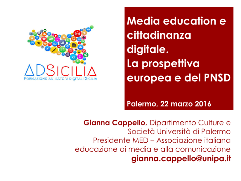 Media education e cittadinanza digitale. La prospettiva europea e del PNSD Palermo, 22 marzo 2016 Gianna Cappello, Dipartimento Culture e Società Università di Palermo Presidente MED – Associazione italiana educazione ai media e alla comunicazione [email protected] Tesi e sintesi degli argomenti Tesi di fondo: dinanzi alle sfide posta dalla società globalizzata, l’educazione – ridefinita in termini mediaeducativi – può contribuire alla costruzione di una cittadinanza in grado di interagire in maniera attiva e responsabile nella società digitale Parleremo dunque di Media Education e di cittadinanza digitale, e dell’inevitabile intreccio tra le due passando per una breve riflessione sui più recenti approcci di ricerca riguardo al rapporto tra media e ragazzi sulle prospettive mediaeducative e di cittadinanza digitale del PNSD sui rischi della deriva tecnologica Per cominciare… Opacità del rapporto tra media e minori (nascosti nella luce) Oltre le dicotomie: apocalittici vs. integrati Non si tratta di limitare e/o censurare un accesso ai media che si va facendo sempre più facile e pervasivo… … ma non si tratta nemmeno di celebrarlo come risorsa neutrale e incondizionata di arricchimento, di apertura al mondo, di auto-determinazione... Oltre il mito dei nativi digitali Non affronta il digital divide (il gap di partecipazione) Presuppone che i ragazzi sappiano riflettere attivamente sulle loro esperienze mediali e sulla complessità dei media come istituzioni sociali (il problema della trasparenza, video Dove-Evolution, video mago belga) Presuppone che i ragazzi sappiano da soli sviluppare le norme etiche per interagire con un ambiente molto complesso e variegato come la rete (la sfida etica*) *I link ipertestuali sono visibili nella modalità di visualizzazione “presentazione” Oltre le dicotomie Eppure questa retorica dicotomizzante persiste. Perché? Racconta storie semplici che, in un’epoca di complessità, ci dicono di lineari rapporti causa-effetto… Trova nei media una facile via d’uscita E dunque… Cosa rispondere alla domanda "i media sono un rischio o un'opportunità"? sono sia un rischio che un’opportunità Minimizzare i rischi – Massimizzare le opportunità il ruolo della Media Educati on/Media Literacy Ladder of opportunities Verso una definizione Progressivo superamento di una visione protezionistica e moralistica a favore di un approccio più interlocutorio e aperto alla complessità delle pratiche di consumo dei media La Raccomandazione UE Raccomandazione della Commissione Europea sull’alfabetizzazione mediatica (media literacy) nell’ambiente digitale per un’industria audiovisiva e dei contenuti più competitiva e per una società della conoscenza inclusiva* (2009) Ho isolato tre affermazioni importanti che ci aiutano a definire la Media Literacy: * http://eur-lex.europa.eu/legal-content/IT/TXT/PDF/?uri=CELEX:32009H0625&from=IT La Media Literacy 1. La Media Literacy è un fattore importante per la cittadinanza attiva nell'odierna società dell'informazione (art. 3) 2. La Media Literacy si riferisce alla capacità di accedere ai media, di capire e valutare criticamente i diversi aspetti dei media e i loro contenuti e di creare comunicazioni in una varietà di contesti (art. 11) 3. La Media Literacy è un'abilità fondamentale non solo per i giovani, ma anche per adulti e anziani, genitori, insegnanti e professionisti dei media (art. 15) European Association for Viewers Interests (EAVI)Viaggio nella Media Literacy La ME nel PNSD Raccomandazione-PNSD-Documento “Nuova Visione per l’Educazione” proposto dal World Economic Forum (2013) Il digitale è: “sia una Foundational Literacy (nuova alfabetizzazione di base), sia come veicolo cruciale per lo sviluppo delle cosiddette Competencies e Qualities (Competenze e Attitudini)” “La visione di competenze digitali riprende il paradigma dell’educazione ai media e con i media” “[Il digitale] ad un livello più alto, [è] agente attivo dei grandi cambiamenti sociali, economici e comportamentali, di economia, diritto e architettura dell’informazione, e che si traduce in competenze di “cittadinanza digitale” essenziali per affrontare il nostro tempo” Le domande della ME (Jenkins, 2010) Come fare affinché ogni bambino abbia accesso alle competenze ed esperienze necessarie per partecipare a pieno titolo nella vita sociale, culturale e politica della società? (il gap di partecipazione) Come fare affinché ogni bambino sia in grado di costruire e articolare la sua comprensione di come i media modellano la sua percezione del mondo? (il problema della trasparenza) Come fare affinché ogni bambino sia a conoscenza dei valori e delle norme che dovrebbero regolare il suo comportamento in rete? (la sfida etica) 3 modalità di azione e 4 aree di studio Tre modalità di azione nella ME: 1. Una modalità interpretativa (analisi testuale) 2. Una modalità delle scienze sociali (analisi contestuale) 3. Una modalità creativa (produzione creativa) E quattro aree di studio: 1. 2. 3. 4. Produzione Linguaggio Rappresentazione Audience Fine Prima Parte DOMANDE??!!! I media a scuola: i rischi della visione strumentale e tecno-utopistica Soprattutto con l’avvento delle tecnologie didattiche si è affermata una visione strumentale e tecno-utopistica del loro ruolorisorsa “taumaturgica” Stravolgimento prassi educative tradizionali all’insegna di uno sperimentalismo selvaggio, spesso privo di spessore pedagogico-culturalesemplice “addestramento” informaticoconfonde l’innovazione con la semplice infrastrutturazione e adozione Citazione di Calvani (1999) I media a scuola: oltre la visione strumentale e tecno-utopistica La natura sociotecnica dei sistemi mediali richiede una maturità sociotecnica che va tutta costruita La questione dell’accesso e del digital divide va compresa e ridefinita nei termini di un accesso qualificato e del superamento del digital divide critico-culturale. No