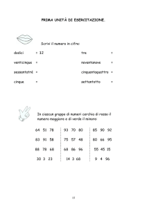 INTRODUZIONE ALL’ALGEBRA ESERCIZIO 1 Traduci dalla lingua italiana alla lingua matematica le seguenti frasi (non occorre calcolare il risultato) 1) Togli 3 da 7 2) Togli a 3 il 7 3) Scrivi il prodotto di 10 e 5 4) Scrivi il doppio di 13 5) Fai il doppio della somma fra 3 e 5 6) Fai la somma di 3 col doppio di 5 7) Scrivi il quadrato del triplo di 2 8) Scrivi il triplo del quadrato di 4 9) Togli 3 dal quadruplo di 15 10) Togli il quadruplo di 3 da 15 ESERCIZIO 2 Traduci dalla lingua italiana alla lingua matematica le seguenti frasi: 1) Togli x da y 2) Scrivi il prodotto di a e b 3) Fai il doppio di n 4) Fai il doppio della somma di a e b 5) Fai la somma di a col doppio di b 6) Scrivi il quadrato di x 7) Scrivi il quadrato del triplo x 8) Scrivi il triplo del quadrato di x 9) Scrivi il successivo di z 10) Togli t dal quadruplo di s 11) Togli il quadruplo di t da s ESERCIZIO 3 Traduci dalla lingua matematica alla lingua italiana le seguenti frasi: 1 a 2 a 2) 2 1 3) 2a 1) 4) a : 2 5) x + 3y 6) (a + b) · 3 7) (a + b)2 8) a2 + b2 ESERCIZIO 4 Scrivi le frasi matematiche che corrispondono a queste traduzioni: 1. La somma di y col cubo del triplo di x 2. La somma di 3 con la metà di x 3. Il prodotto fra il quadrato di x ed il cubo della differenza fra a e b, ESERCIZIO 5 Traduci dal linguaggio naturale al linguaggio algebrico le seguenti frasi: 1) a è doppio di b 2) a è la metà di b 3) a è il successivo di b 4) a supera b di 5 unità 5) a è il quadrato di b 6) il doppio di a è il numero che precede b ESERCIZIO 6 Anna, Beatrice e Clara sono sorelle. Di loro sappiamo che Anna è la maggiore, Beatrice ha 2 anni meno di Anna e 3 anni più di Clara. a) indica con tre lettere le età delle sorelle e esprimi in formule le relazioni fra le loro età b) se le tre sorelle assieme hanno 35 anni, sapresti dire qual è l’età di ciascuna di loro? Spiega il tuo ragionamento. ESERCIZIO 7 Nella nostra scuola, gli studenti sono 6 volte i professori.Scegli due lettere per indicare il numero degli studenti e quello dei professori. Esprimi con una formula la relazione fra il numero degli studenti e quello dei professori ESERCIZIO 8 Al bar della scuola, ogni 5 pizzette vendute si preparano 3 caffè. Scegli 2 lettere per rappresentare il numero delle pizzette ed il numero dei caffè. Esprimi con una formula la relazione fra il numero delle pizzette e quello dei caffè. ESERCIZIO 9 Se n è dispari, cosa sai dire di: a) n + 1 b) n ― 1 c) 2n d) 3n e) 2n + 1 f) 3n + 1 g) n2 ESERCIZIO 10 1 Sai che a = b + 7 e che b = 5. Che cosa puoi dedurre? 2 Sai che a + b = 117 Che cosa puoi dire di a + b + 2 ? 3 Sai che n ― 318 = 572 Che cosa puoi dire di n ― 319 ? 4 Sai che a + b = c e che a + b + c = 50 Che cosa puoi dedurre? ESERCIZIO 11 Come puoi scegliere a e b affinché 27 + a + b sia: a) Pari b) Dispari ESERCIZIO 12 Sai che n è un numero naturale. Per quali valori di n l’espressione 5n + 3 risulta: a) Pari b) Multipla di 3 c) Multipla di 5 d) Dispari