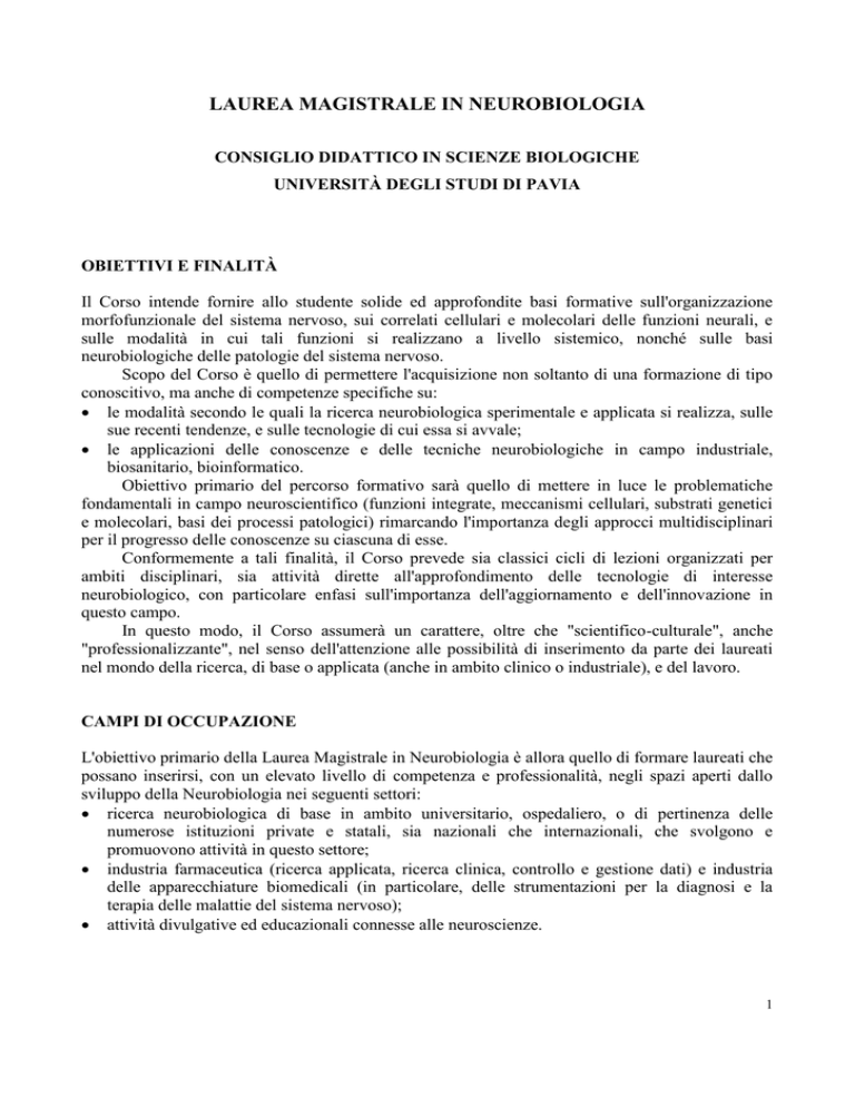 LAUREA MAGISTRALE IN NEUROBIOLOGIA CONSIGLIO DIDATTICO IN SCIENZE BIOLOGICHE UNIVERSITÀ DEGLI STUDI DI PAVIA OBIETTIVI E FINALITÀ Il Corso intende fornire allo studente solide ed approfondite basi formative sull'organizzazione morfofunzionale del sistema nervoso, sui correlati cellulari e molecolari delle funzioni neurali, e sulle modalità in cui tali funzioni si realizzano a livello sistemico, nonché sulle basi neurobiologiche delle patologie del sistema nervoso. Scopo del Corso è quello di permettere l'acquisizione non soltanto di una formazione di tipo conoscitivo, ma anche di competenze specifiche su: le modalità secondo le quali la ricerca neurobiologica sperimentale e applicata si realizza, sulle sue recenti tendenze, e sulle tecnologie di cui essa si avvale; le applicazioni delle conoscenze e delle tecniche neurobiologiche in campo industriale, biosanitario, bioinformatico. Obiettivo primario del percorso formativo sarà quello di mettere in luce le problematiche fondamentali in campo neuroscientifico (funzioni integrate, meccanismi cellulari, substrati genetici e molecolari, basi dei processi patologici) rimarcando l'importanza degli approcci multidisciplinari per il progresso delle conoscenze su ciascuna di esse. Conformemente a tali finalità, il Corso prevede sia classici cicli di lezioni organizzati per ambiti disciplinari, sia attività dirette all'approfondimento delle tecnologie di interesse neurobiologico, con particolare enfasi sull'importanza dell'aggiornamento e dell'innovazione in questo campo. In questo modo, il Corso assumerà un carattere, oltre che "scientifico-culturale", anche "professionalizzante", nel senso dell'attenzione alle possibilità di inserimento da parte dei laureati nel mondo della ricerca, di base o applicata (anche in ambito clinico o industriale), e del lavoro. CAMPI DI OCCUPAZIONE L'obiettivo primario della Laurea Magistrale in Neurobiologia è allora quello di formare laureati che possano inserirsi, con un elevato livello di competenza e professionalità, negli spazi aperti dallo sviluppo della Neurobiologia nei seguenti settori: ricerca neurobiologica di base in ambito universitario, ospedaliero, o di pertinenza delle numerose istituzioni private e statali, sia nazionali che internazionali, che svolgono e promuovono attività in questo settore; industria farmaceutica (ricerca applicata, ricerca clinica, controllo e gestione dati) e industria delle apparecchiature biomedicali (in particolare, delle strumentazioni per la diagnosi e la terapia delle malattie del sistema nervoso); attività divulgative ed educazionali connesse alle neuroscienze. 1 REQUISITI DI INGRESSO Al corso di Laurea Magistrale in Neurobiologia può accedere, senza debito formativo, chi è in possesso di uno dei seguenti titoli: diploma di laurea triennale in Scienze Biologiche, di qualunque indirizzo, conseguito presso un’Università italiana; diploma di laurea triennale in Biotecnologie, di qualunque indirizzo, conseguito presso un’Università italiana; diploma di laurea quinquennale in Scienze Biologiche (vecchio ordinamento). Per chi è in possesso di diplomi di laurea diversi da quelli elencati, i requisiti minimi per l’ammissione alla Laurea Magistrale in Neurobiologia sono costituiti dall’acquisizione, nel corso del precedente curriculum universitario, dei seguenti crediti formativi: Discipline matematiche, fisiche e informatiche: Discipline chimiche: Discipline biologiche animali, biologia cellulare e dello sviluppo: Discipline biomolecolari: Discipline fisiologiche e biomediche: 12 CFU 15 CFU 15 CFU 18 CFU 9 CFU È comunque prevista in questi casi una specifica valutazione della carriera pregressa del candidato ed eventualmente della sua preparazione personale, al fine di verificare la sussistenza dei requisiti minimi per l’ammissione. ESAME FINALE Per il conseguimento della laurea magistrale il laureando dovrà presentare e discutere in pubblico, ad una commissione appositamente designata, una dissertazione scritta (tesi) il cui argomento, concordato con uno dei docenti del corso di studio (relatore) deve essere il risultato di una sperimentazione pratica della durata di 18 mesi svolta in un laboratorio definito con il relatore. L'elaborato dovrà essere congruente con gli obiettivi formativi del Corso e volto all'approfondimento di tematiche di specifico interesse neurobiologico. IMMATRICOLAZIONE Per quanto concerne le domande di immatricolazione, l’ammontare di tasse e contributi, i benefici erogati dall’ISU, gli studenti dovranno fare riferimento alla Segreteria della Facoltà. 2 Schema del percorso didattico Primo anno, primo semestre Neurocitologia e neurochimica (BIO/06, BIO/14) Mod. Neurocitologia e neuroistologia (BIO/06; Prof.ssa Scherini) Mod. Neurochimica (BIO/14; Prof.ssa Curti) 12 CFU (6) (6) Neurogenesi e neuromorfologia comparata (BIO/06) Mod. Neurogenesi e neuromorfologia comp. (Prof.ssa Bernocchi) Mod. Metodi neurocitochimici (Prof.ssa Bottone) 9 CFU (6) (3) Biofisica di membrana e elettrofisiologia (BIO/09; Prof. Toselli) 9 CFU Primo anno, secondo semestre Neuroanatomia umana (BIO/16; Prof.ssa Bottone) 6 CFU Neurofisiologia cellulare (BIO/09) Mod. Fisiologia del neurone (Prof. Magistretti) Mod. Fisiologia dei recettori sensoriali (Prof.ssa Perin) 9 CFU (6) (3) Neurofarmacologia molecolare (BIO/14; Prof.ssa Curti) 6 CFU Secondo anno, primo semestre Neurofisiologia dei sistemi integrati (BIO/09) Mod. Fisiologia del sistema nervoso (Prof.ssa Rossi) (6 CFU) 3 Neurogenetica e neuroimmunologia (BIO/18, BIO/06) Mod. Neurogenetica (BIO/18; Prof. Comincini) Mod. Neuroimmunologia (BIO/06; Prof.ssa Nano) 9 CFU (3) (6) Neuropatologia (MED/26) Mod. I (Prof. Ceroni) Mod. II (Prof. Blandini) 6 CFU (3) (3) Secondo anno, secondo semestre Neuropsicofarmacologia (BIO/14; Prof. Tonini) 6 CFU Basi neurali del comportamento e neuropsicologia (M-PSI/02; Prof. Biella) 6 CFU Neurofisiologia dei sistemi integrati (BIO/09) Mod. Teorie funzionali del sistem