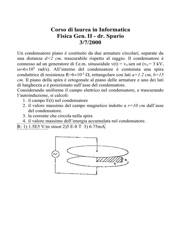 Corso di laurea in Informatica Fisica Gen. II - dr. Spurio 3/7/2000 Un condensatore piano è costituito da due armature circolari, separate da una distanza d=2 cm, trascurabile rispetto al raggio. Il condensatore è connesso ad un generatore di f.e.m. sinusoidale v(t) = vo sen t (vo = 3 kV, 6105 rad/s). All’interno del condensatore è contenuta una spira conduttrice di resistenza R=610-3 , rettangolare con lati a=1.2 cm, b=15 cm. Il piano della spira è ortogonale al piano delle armature e uno dei lati di lunghezza a è posizionato sull’asse del condensatore. Considerando uniforme il campo elettrico nel condensatore, e trascurando l’autoinduzione, si calcoli: 1. il campo E(t) nel condensatore 2. il valore massimo del campo magnetico indotto a r=10 cm dall’asse del condensatore. 3. la corrente che circola nella spira 4. il valore massimo dell’energia accumulata nel condensatore. R: 1) 1.5E5 V/m sint 2)5 E-8 T 3) 6.75mA