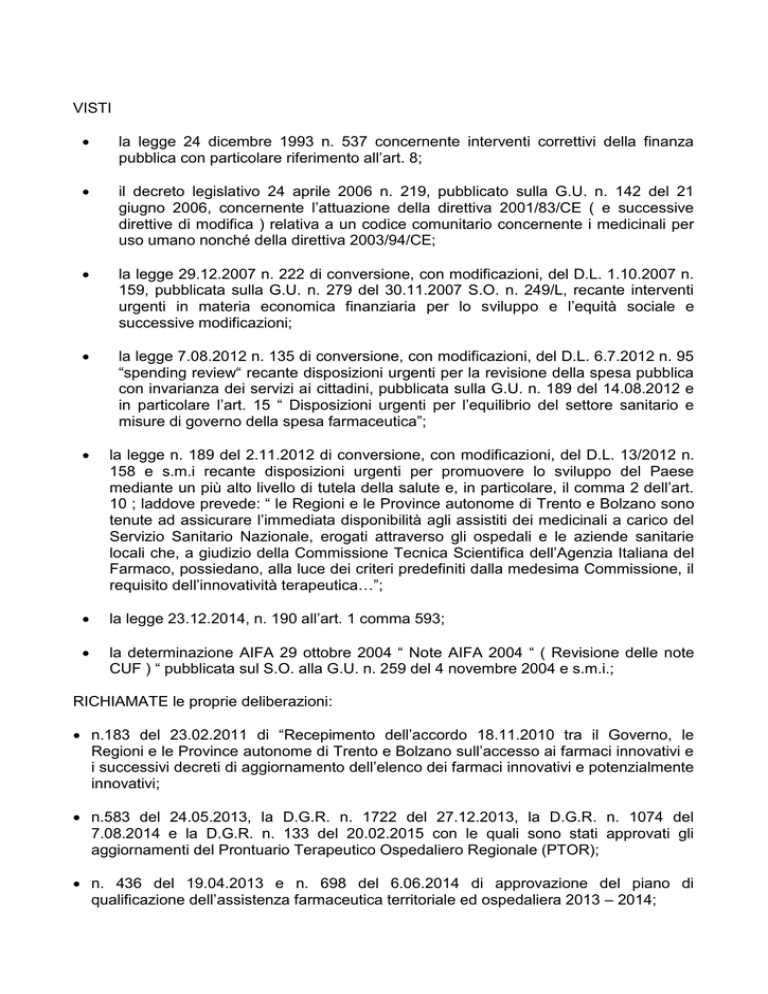 VISTI la legge 24 dicembre 1993 n. 537 concernente interventi correttivi della finanza pubblica con particolare riferimento all’art. 8; il decreto legislativo 24 aprile 2006 n. 219, pubblicato sulla G.U. n. 142 del 21 giugno 2006, concernente l’attuazione della direttiva 2001/83/CE ( e successive direttive di modifica ) relativa a un codice comunitario concernente i medicinali per uso umano nonché della direttiva 2003/94/CE; la legge 29.12.2007 n. 222 di conversione, con modificazioni, del D.L. 1.10.2007 n. 159, pubblicata sulla G.U. n. 279 del 30.11.2007 S.O. n. 249/L, recante interventi urgenti in materia economica finanziaria per lo sviluppo e l’equità sociale e successive modificazioni; la legge 7.08.2012 n. 135 di conversione, con modificazioni, del D.L. 6.7.2012 n. 95 “spending review“ recante disposizioni urgenti per la revisione della spesa pubblica con invarianza dei servizi ai cittadini, pubblicata sulla G.U. n. 189 del 14.08.2012 e in particolare l’art. 15 “ Disposizioni urgenti per l’equilibrio del settore sanitario e misure di governo della spesa farmaceutica”; la legge n. 189 del 2.11.2012 di conversione, con modificazioni, del D.L. 13/2012 n. 158 e s.m.i recante disposizioni urgenti per promuovere lo sviluppo del Paese mediante un più alto livello di tutela della salute e, in particolare, il comma 2 dell’art. 10 ; laddove prevede: “ le Regioni e le Province autonome di Trento e Bolzano sono tenute ad assicurare l’immediata disponibilità agli assistiti dei medicinali a carico del Servizio Sanitario Nazionale, erogati attraverso gli ospedali e le aziende sanitarie locali che, a giudizio della Commissione Tecnica Scientifica dell’Agenzia Italiana del Farmaco, possiedano, alla luce dei criteri predefiniti dalla medesima Commissione, il requisito dell’innovatività terapeutica…”; la legge 23.12.2014, n. 190 all’art. 1 comma 593; la determinazione AIFA 29 ottobre 2004 “ Note AIFA 2004 “ ( Revisione delle note CUF ) “ pubblicata sul S.O. alla G.U. n. 259 del 4 novembre 2004 e s.m.i.; RICHIAMATE le proprie deliberazioni: n.183 del 23.02.2011 di “Recepimento dell’accordo 18.11.2010 tra il Governo, le Regioni e le Province autonome di Trento e Bolzano sull’accesso ai farmaci innovativi e i successivi decreti di aggiornamento dell’elenco dei farmaci innovativi e potenzialmente innovativi; n.583 del 24.05.2013, la D.G.R. n. 1722 del 27.12.2013, la D.G.R. n. 1074 del 7.08.2014 e la D.G.R. n. 133 del 20.02.2015 con le quali sono stati approvati gli aggiornamenti del Prontuario Terapeutico Ospedaliero Regionale (PTOR); n. 436 del 19.04.2013 e n. 698 del 6.06.2014 di approvazione del piano di qualificazione dell’assistenza farmaceutica territoriale ed ospedaliera 2013 – 2014; n. 161 del 26.02.2016 ad oggetto: “Indirizzi operativi per le attività sanitarie e sociosanitarie per l’anno 2016 “; n. 526 del 10.06.2016 ad oggetto: “D.G.R. n. 161/2016. Ulteriori indirizzi operativi alle ASL, Istituti ed Enti del SSR sull’assistenza farmaceutica territoriale ed ospedaliera e sui dispositivi medici e assistenza protesica “; VISTI ed espressamente richiamati i sotto indicati provvedimenti dell’Agenzia Italiana del Farmaco: Determina 12 luglio 2016 ad oggetto: “Classificazione ai sensi dell’art. 8, comma 10, della legge 24 dicembre 1993, n. 537, del medicinale per uso umano << Duaklir Genuair >>, pubblicata sulla G.U. n. 180 del 3.08.2016, per il trattamento della broncopneumopatia cronica ostruttiva (BPCO); Determina 18 luglio 2016 ad oggetto:” Riclassificazione, ai sensi dell’art. 8, comma 10, della legge 24 dicembre 1993 n. 537 del medicinale per uso umano <<Spiolto Respimat>>, pubblicata sulla G.U. n. 191 del 17.08.2016 per il trattamento della broncopneumopatia cronica ostruttiva (BPCO); RILEVATO che i provvedimenti sopra indicati stabiliscono che la prescrizione, a carico del SSN, delle confezioni dei suddetti medicinali classificati in fascia A avvenga previo rilascio di diagnosi e piano terapeutico da parte dei centri specialistici, universitari o delle Aziende Sanitarie individuati dalle Regioni; RICHIAMATE, altresì, le proprie deliberazioni: - n. 704 del 21.05.2015 con la quale sono stati individuati i centri prescrittori dei medicinali “Ultibro Breezhaler “ e “ Xoterna Breezhaler “ (p.a. indacaterolo/glicopirronio bromuro) per l’indicazione terapeutica: “Trattamento broncodilatatore di mantenimento per allievare i sintomi nei pazienti adulti con malattia polmonare ostruttiva cronica (BPCO) “; - n. 1005 del 21.09.2015 con la quale sono stati, tra l’altro, individuati i centri prescrittori dei medicinali “Anoro“ e “Laventair“ (p.a. umeclidinio + vilanterolo) per la stessa indicazione terapeutica; -n. 1208 del 3.11.2015 con la quale sono stati integrati i centri prescrittori dei medicinali “Anoro ” e “ Laventair “; RITENUTO, pertanto, di dover provvedere ad individuare i centri prescrittori dei medicinali: << Duaklir Genuair >> e <<Spiolto Respimat>> per il trattamento della broncopneumopatia cronica ostruttiva (BPCO); DATO ATTO dell’istruttoria effettuata dall’Agenzia Sanitaria regionale; Su proposta del Vice Presidente e Assessore alla Sanità, Politiche socio sanitarie e terzo settore, Sicurezza, Immigrazione e Emigrazione; DELIBERA Di individuare i sotto indicati Centri specialistici regionali ai fini della prescrizione, a carico del SSN, delle confezioni dei medicinali << Duaklir Genuair >> e <<Spiolto Respimat>> classificati in fascia A per il trattamento della broncopneumopatia cronica ostruttiva (BPCO); ASL 1 Inperiese S.C. Pneumologia presidio ospedaliero di Imperia S.C. Medicina presidio ospedaliero di Imperia S.C. Medicina presidio ospedaliero di Sanremo S.C. Medicina presidio ospedaliero di Bordighera ASL 2 Savonese S.C. Medicina Interna 1 ed Ematologia presidio ospedaliero “ San Paolo “ S.C. Medicina Interna 2 cure intermedie presidio ospedaliero “ San Paolo 