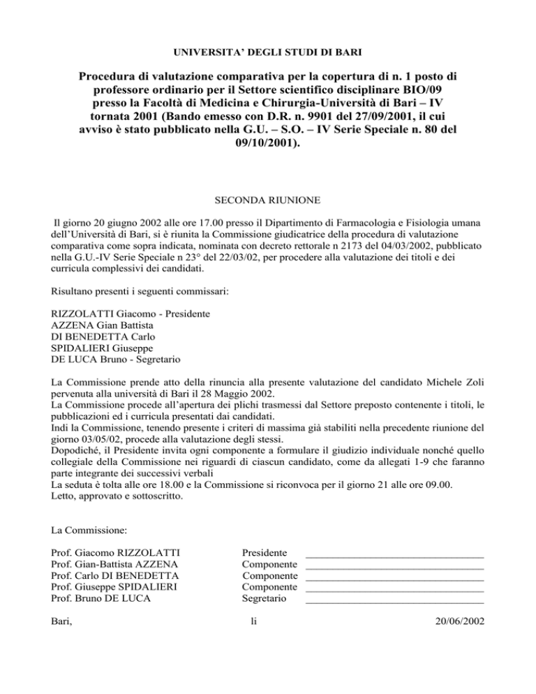 UNIVERSITA’ DEGLI STUDI DI BARI Procedura di valutazione comparativa per la copertura di n. 1 posto di professore ordinario per il Settore scientifico disciplinare BIO/09 presso la Facoltà di Medicina e Chirurgia-Università di Bari – IV tornata 2001 (Bando emesso con D.R. n. 9901 del 27/09/2001, il cui avviso è stato pubblicato nella G.U. – S.O. – IV Serie Speciale n. 80 del 09/10/2001). SECONDA RIUNIONE Il giorno 20 giugno 2002 alle ore 17.00 presso il Dipartimento di Farmacologia e Fisiologia umana dell’Università di Bari, si è riunita la Commissione giudicatrice della procedura di valutazione comparativa come sopra indicata, nominata con decreto rettorale n 2173 del 04/03/2002, pubblicato nella G.U.-IV Serie Speciale n 23° del 22/03/02, per procedere alla valutazione dei titoli e dei curricula complessivi dei candidati. Risultano presenti i seguenti commissari: RIZZOLATTI Giacomo - Presidente AZZENA Gian Battista DI BENEDETTA Carlo SPIDALIERI Giuseppe DE LUCA Bruno - Segretario La Commissione prende atto della rinuncia alla presente valutazione del candidato Michele Zoli pervenuta alla università di Bari il 28 Maggio 2002. La Commissione procede all’apertura dei plichi trasmessi dal Settore preposto contenente i titoli, le pubblicazioni ed i curricula presentati dai candidati. Indi la Commissione, tenendo presente i criteri di massima già stabiliti nella precedente riunione del giorno 03/05/02, procede alla valutazione degli stessi. Dopodiché, il Presidente invita ogni componente a formulare il giudizio individuale nonché quello collegiale della Commissione nei riguardi di ciascun candidato, come da allegati 1-9 che faranno parte integrante dei successivi verbali La seduta è tolta alle ore 18.00 e la Commissione si riconvoca per il giorno 21 alle ore 09.00. Letto, approvato e sottoscritto. La Commissione: Prof. Giacomo RIZZOLATTI Prof. Gian-Battista AZZENA Prof. Carlo DI BENEDETTA Prof. Giuseppe SPIDALIERI Prof. Bruno DE LUCA Bari, Presidente Componente Componente Componente Segretario li _________________________________ _________________________________ _________________________________ _________________________________ _________________________________ 20/06/2002 UNIVERSITA’ DEGLI STUDI DI BARI Procedura di valutazione comparativa per la copertura di n. 1 posto di professore ordinario per il Settore scientifico disciplinare BIO/09 presso la Facoltà di Medicina e Chirurgia-Università di Bari – IV tornata 2001 (Bando emesso con D.R. n. 9901 del 27/09/2001, il cui avviso è stato pubblicato nella G.U. – S.O. – IV Serie Speciale n. 80 del 09/10/2001). TERZA RIUNIONE Il giorno 21 giugno 2002 alle ore 9.00 presso il Dipartimento di Farmacologia e Fisiologia umana dell’Università di Bari, si è riunita la Commissione giudicatrice della procedura di valutazione comparativa come sopra indicata, nominata con decreto rettorale n 2173 del 04/03/2002, pubblicato nella G.U.-IV Serie Speciale n 23° del 22/03/02, per procedere alla valutazione dei titoli e dei curricula complessivi dei candidati. Risultano presenti i seguenti commissari: RIZZOLATTI Giacomo - Presidente AZZENA Gian Battista DI BENEDETTA Carlo SPIDALIERI Giuseppe DE LUCA Bruno - Segretario Dall’analisi dei fascicoli dei singoli candidati si rileva che vi sono pubblicazioni redatte in collaborazione con membri della Commissione e che queste possono essere valutate solo se rispondenti ai criteri individuati nella prima riunione. La Commissione valuta quindi l'apporto dei singoli coautori alle pubblicazioni presentate dai candidati che risultino essere svolte con componenti della Commissione. La Commissione constata che il prof Claudio Grassi ha presentato 5 pubblicazioni in collaborazione con il prof. Azzena, il prof. Giuseppe Luppino 11 con il prof. Rizzolatti, la professoressa Diana Troiani 2 con il prof. Azzena ed il prof. Francesco Vitiello 7 con il Prof. Di Benedetta. Il Prof. Azzena dichiara che gli articoli in collaborazione con Grassi rappresentano un’evoluzione fondamentale nella produzione scientifica di Grassi, il quale, interessandosi delle tematiche relative al ruolo dell’ossido nitrico nell’ambito del sistema nervoso centrale, ha sviluppato un’importante ed autonoma attività di ricerca i cui risultati compaiono su qualificati giornali internazionali. Il ruolo del prof. Grassi nella formulazione delle ipotesi di lavoro, nel disegno sperimentale e nella discussione dei risultati è stata sempre di grande rilevanza. Il prof. Azzena dichiara che le due pubblicazioni in collaborazione con la prof. Troiani costituiscono il risultato di un’integrazione di conoscenze già acquisite indipendentemente dal prof. Azzena e dalla professoressa stessa e che il contributo della medesima è stato fondamentale per il compimento della ricerca. Il Prof. Di Benedetta dichiara che gli articoli in collaborazione con il prof. Vitiello, la cui data di pubblicazione cade fra il 1977 ed il 1989, rappresentano il momento iniziale e, successivamente, un consolidamento della evoluzione scientifica che ha portato il Prof. Vitiello dallo studio dell’ontogenesi normale e patologica del sistema nervoso centrale, ed in particolare del cervelletto, verso un’attività di ricerca più centrata sull’analisi dei fattori che influenzano, in un sistema nervoso semplice quale quello di invertebrato, la formazione e la stabilizzazione dei contatti sinaptici. Il Prof. Di Benedetta dichiara che gli studi che il Prof. Vitiello ha portato avanti nel quadro della collaborazione contenevano già gli aspetti culturali e tecnici che il candidato avrebbe successivamente coltivato ed ampliato. Ciò è messo in luce dalla produzione scientifica globale del Prof. Vitiello che è da intendersi come evoluzione autonoma della tematica di ricerca iniziale, in cui l’apporto culturale e metodologico del Prof. Vitiello era già essenziale e rilevabile. Il Prof. Rizzolatti dichiara che il contributo del prof. Luppino nei lavor