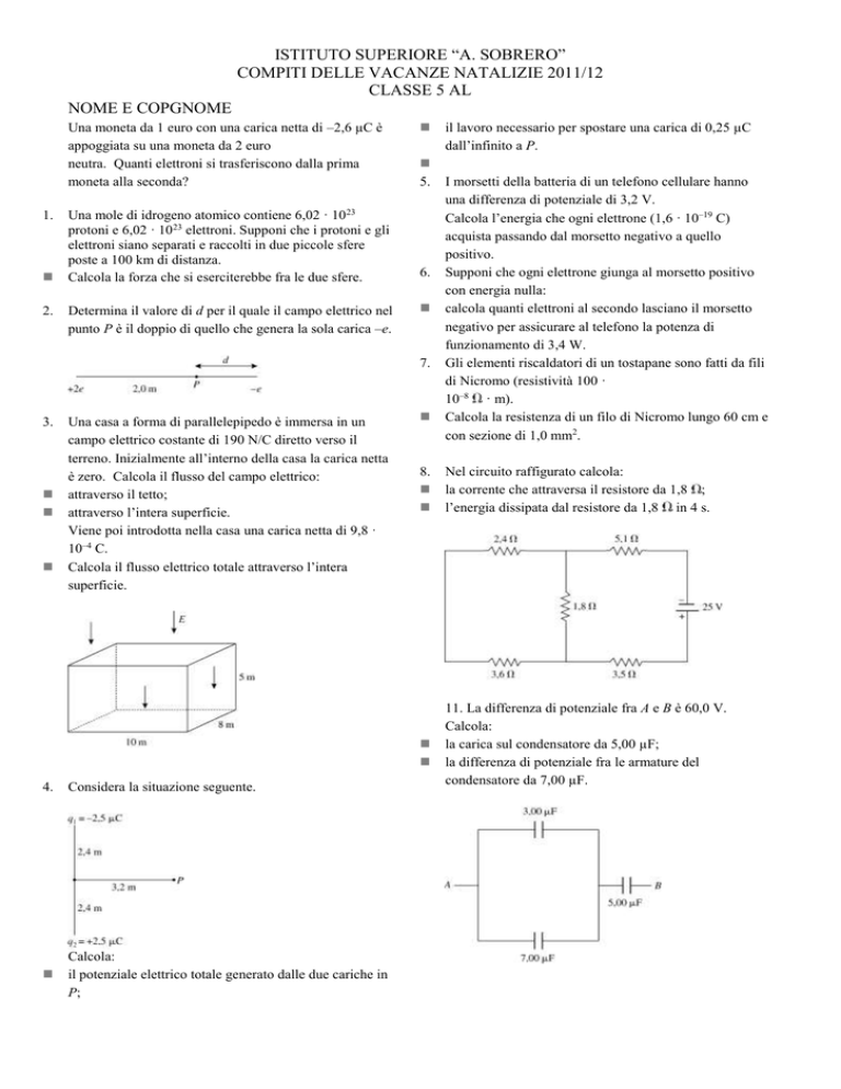 ISTITUTO SUPERIORE “A. SOBRERO” COMPITI DELLE VACANZE NATALIZIE 2011/12 CLASSE 5 AL NOME E COPGNOME Una moneta da 1 euro con una carica netta di –2,6 µC è appoggiata su una moneta da 2 euro neutra. Quanti elettroni si trasferiscono dalla prima moneta alla seconda? 1. 2. Una mole di idrogeno atomico contiene 6,02 · 10 23 protoni e 6,02 · 1023 elettroni. Supponi che i protoni e gli elettroni siano separati e raccolti in due piccole sfere poste a 100 km di distanza. Calcola la forza che si eserciterebbe fra le due sfere. Determina il valore di d per il quale il campo elettrico nel punto P è il doppio di quello che genera la sola carica –e. 5. 6. 7. 3. Una casa a forma di parallelepipedo è immersa in un campo elettrico costante di 190 N/C diretto verso il terreno. Inizialmente all’interno della casa la carica netta è zero. Calcola il flusso del campo elettrico: attraverso il tetto; attraverso l’intera superficie. Viene poi introdotta nella casa una carica netta di 9,8 · 10–4 C. Calcola il flusso elettrico totale attraverso l’intera superficie. 8. 4. Considera la situazione seguente. Calcola: il potenziale elettrico totale generato dalle due cariche in P; il lavoro necessario per spostare una carica di 0,25 µC dall’infinito a P. I morsetti della batteria di un telefono cellulare hanno una differenza di potenziale di 3,2 V. Calcola l’energia che ogni elettrone (1,6 · 10–19 C) acquista passando dal morsetto negativo a quello positivo. Supponi che ogni elettrone giunga al morsetto positivo con energia nulla: calcola quanti elettroni al secondo lasciano il morsetto negativo per assicurare al telefono la potenza di funzionamento di 3,4 W. Gli elementi riscaldatori di un tostapane sono fatti da fili di Nicromo (resistività 100 · 10–8 · m). Calcola la resistenza di un filo di Nicromo lungo 60 cm e con sezione di 1,0 mm2. Nel circuito raffigurato calcola: la corrente che attraversa il resistore da 1,8 ; l’energia dissipata dal resistore da 1,8 in 4 s. 11. La differenza di potenziale fra A e B è 60,0 V. Calcola: la carica sul condensatore da 5,00 µF; la differenza di potenziale fra le armature del condensatore da 7,00 µF.