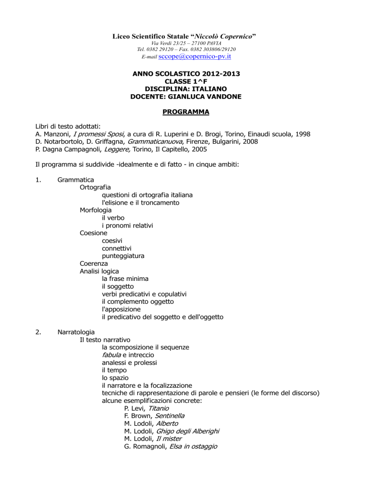 Liceo Scientifico Statale “Niccolò Copernico” Via Verdi 23/25 – 27100 PAVIA Tel. 0382 29120 – Fax. 0382 303806/29120 E-mail [email protected] ANNO SCOLASTICO 2012-2013 CLASSE 1^F DISCIPLINA: ITALIANO DOCENTE: GIANLUCA VANDONE PROGRAMMA Libri di testo adottati: A. Manzoni, I promessi Sposi, a cura di R. Luperini e D. Brogi, Torino, Einaudi scuola, 1998 D. Notarbortolo, D. Griffagna, Grammaticanuova, Firenze, Bulgarini, 2008 P. Dagna Campagnoli, Leggere, Torino, Il Capitello, 2005 Il programma si suddivide -idealmente e di fatto - in cinque ambiti: 1. Grammatica Ortografia questioni di ortografia italiana l'elisione e il troncamento Morfologia il verbo i pronomi relativi Coesione coesivi connettivi punteggiatura Coerenza Analisi logica la frase minima il soggetto verbi predicativi e copulativi il complemento oggetto l'apposizione il predicativo del soggetto e dell'oggetto 2. Narratologia Il testo narrativo la scomposizione il sequenze fabula e intreccio analessi e prolessi il tempo lo spazio il narratore e la focalizzazione tecniche di rappresentazione di parole e pensieri (le forme del discorso) alcune esemplificazioni concrete: P. Levi, Titanio F. Brown, Sentinella M. Lodoli, Alberto M. Lodoli, Ghigo degli Alberighi M. Lodoli, Il mister G. Romagnoli, Elsa in ostaggio 3. Manzoni, I Promessi Sposi Contesto storico-culturale (Illuminismo, Romanticismo) L'autore: vita, opere, linee di lettura Il romanzo storico: il genere letterario L'opera caratteristiche salienti Lettura, contestualizzazione e commento dei capp. 1-11 romanzo 4. Proposte di lettura N. Ammaniti, Io e te, Einaudi P. Maurensig, La variante di Lüneburg, Adelphi 5. Educazione alla scrittura le fasi di prescrittura, scrittura e postscrittura Il riassunto di un testo narrativo e non narrativo Il testo espositivo Il testo espositivo con documenti COMPITI 1. Grammatica: svolgere i seguenti esercizi del libro di grammatica 1, 6, 8 pag. 160s. 103 pag. 296 2, 3, 4, 5 6, 7, 8 pag. 673ss. 2. Educazione alla scrittura: 2.1 dopo aver individuato la tesi ed elaborato la scaletta, riassumere in 14-16 mezze righe due articoli di giornale a piacimento (di cui andrà fornito anche il testo) (chi ha ricevuto la sospensione del giudizio o l'aiuto di italiano deve riassumere -secondo le precedenti consegne- almeno altri due articoli di giornale, di cui andrà fornito il testo) 2.2 svolgere almeno una delle due tracce espositive, non superando le tre colonne di foglio protocollo (chi ha ricevuto la sospensione del giudizio o l'aiuto di italiano deve svolgerle entrambe): L'immigrazione caratterizza, ormai da anni, il nostro paese. Analizza il fenomeno sottolineandone gli aspetti positivi e negativi e portando opportuni esempi d'integrazione ed emarginazione. Sempre più spesso si sente parlare dell'alcolismo giovanile come un problema in grave espansione. Analizza tale fenomeno mettendo in luce le motivazioni che spingono i giovani, le conseguenze e le possibili soluzioni attuabili. 2.3 Aiutandoti con i dati delle tabella sottostanti e alla luce delle tue conoscenze fornisci un testo espositivo di massimo tre colonne sul seguente argomento: La mobilità in Italia: le varie tipologie, i loro pregi e i loro difetti città Auto privata Trasporto pubblico bicicletta pedonle Torino 64 28 1 7 Parigi 17 33 4 46 Londra 40 37 3 20 Monacodi Baviera 31 26 13 30 Copenhagen 29 15 31 25 3. Lettura di almeno due dei seguenti testi: P. Süskind, Il profumo, Bompiani D. Pennac, Diario di scuola, Feltrinelli M. Lodoli, Professori e altri professori, Einaudi N. Ammaniti, Io non ho paura, Einaudi