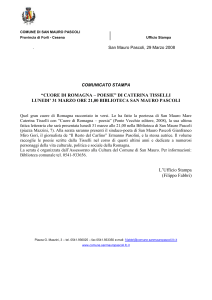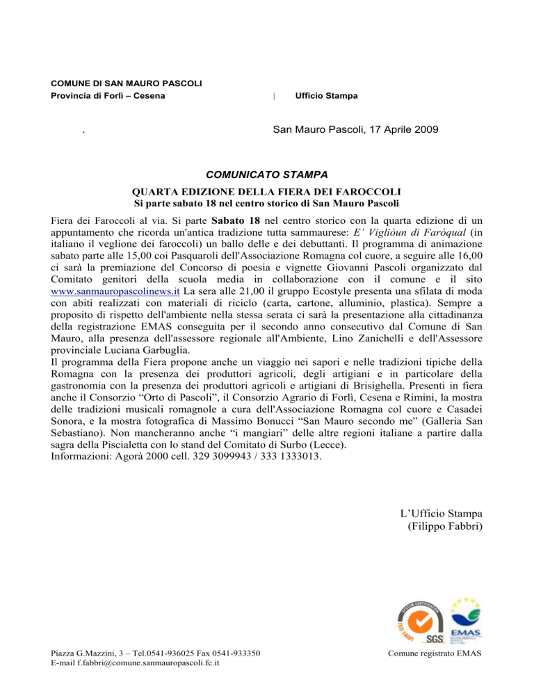 COMUNE DI SAN MAURO PASCOLI Provincia di Forlì – Cesena | . Ufficio Stampa San Mauro Pascoli, 17 Aprile 2009 COMUNICATO STAMPA QUARTA EDIZIONE DELLA FIERA DEI FAROCCOLI Si parte sabato 18 nel centro storico di San Mauro Pascoli Fiera dei Faroccoli al via. Si parte Sabato 18 nel centro storico con la quarta edizione di un appuntamento che ricorda un'antica tradizione tutta sammaurese: E’ Vigliòun di Faróqual (in italiano il veglione dei faroccoli) un ballo delle e dei debuttanti. Il programma di animazione sabato parte alle 15,00 coi Pasquaroli dell'Associazione Romagna col cuore, a seguire alle 16,00 ci sarà la premiazione del Concorso di poesia e vignette Giovanni Pascoli organizzato dal Comitato genitori della scuola media in collaborazione con il comune e il sito www.sanmauropascolinews.it La sera alle 21,00 il gruppo Ecostyle presenta una sfilata di moda con abiti realizzati con materiali di riciclo (carta, cartone, alluminio, plastica). Sempre a proposito di rispetto dell'ambiente nella stessa serata ci sarà la presentazione alla cittadinanza della registrazione EMAS conseguita per il secondo anno consecutivo dal Comune di San Mauro, alla presenza dell'assessore regionale all'Ambiente, Lino Zanichelli e dell'Assessore provinciale Luciana Garbuglia. Il programma della Fiera propone anche un viaggio nei sapori e nelle tradizioni tipiche della Romagna con la presenza dei produttori agricoli, degli artigiani e in particolare della gastronomia con la presenza dei produttori agricoli e artigiani di Brisighella. Presenti in fiera anche il Consorzio “Orto di Pascoli”, il Consorzio Agrario di Forlì, Cesena e Rimini, la mostra delle tradizioni musicali romagnole a cura dell'Associazione Romagna col cuore e Casadei Sonora, e la mostra fotografica di Massimo Bonucci “San Mauro secondo me” (Galleria San Sebastiano). Non mancheranno anche “i mangiari” delle altre regioni italiane a partire dalla sagra della Piscialetta con lo stand del Comitato di Surbo (Lecce). Informazioni: Agorà 2000 cell. 329 3099943 / 333 1333013. L’Ufficio Stampa (Filippo Fabbri) Piazza G.Mazzini, 3 – Tel.0541-936025 Fax 0541-933350 E-mail [email protected] Comune registrato EMAS