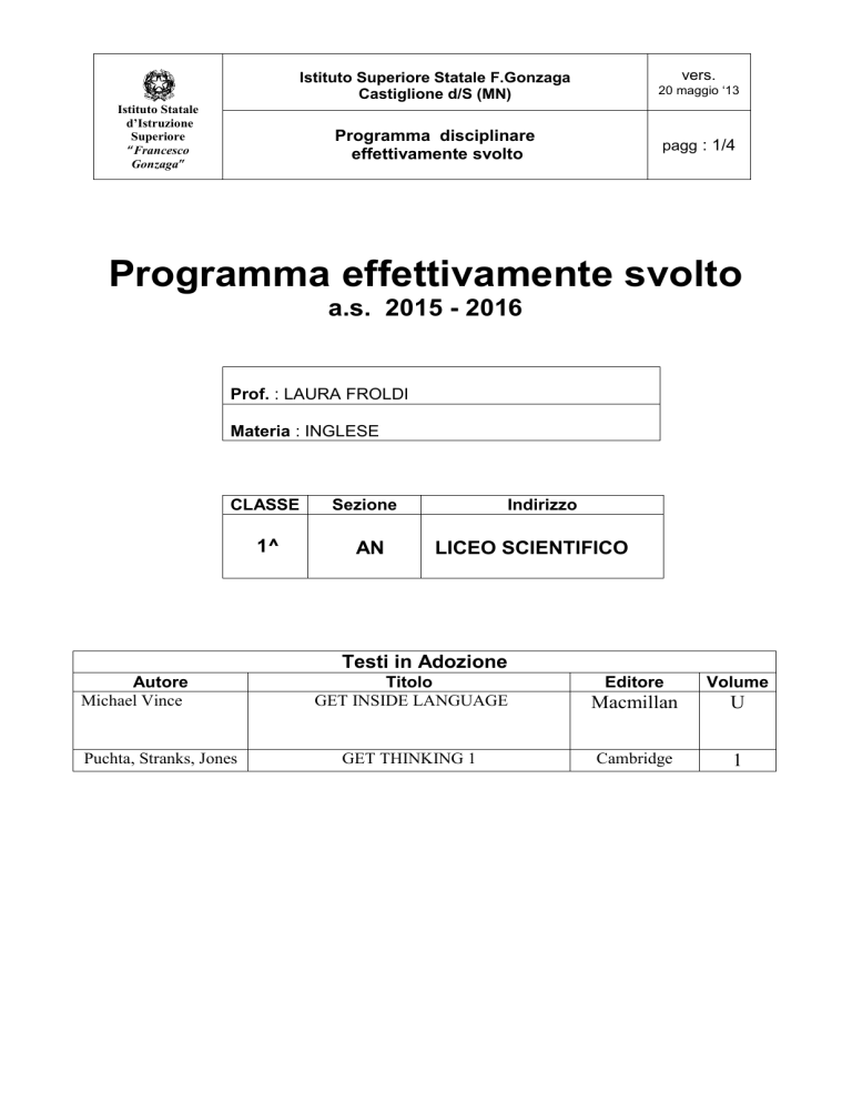 vers. Istituto Superiore Statale F.Gonzaga Castiglione d/S (MN) 20 maggio ‘13 Programma disciplinare effettivamente svolto pagg : 1/4 Istituto Statale d’Istruzione Superiore “Francesco Gonzaga” Programma effettivamente svolto a.s. 2015 - 2016 Prof. : LAURA FROLDI Materia : INGLESE CLASSE 1^ Sezione AN Indirizzo LICEO SCIENTIFICO Testi in Adozione Autore Michael Vince Puchta, Stranks, Jones Titolo GET INSIDE LANGUAGE Editore Volume Macmillan U GET THINKING 1 Cambridge 1 Moduli sviluppati con indicazioni bibliografiche Modulo WELCOME USEFUL THINGS HAVING FUN MONEY FOOD FAMILY HOUSE FRIENDS THE WORLD PLACES IN TOWN BODY GRAMMAR: Argomenti REVISION: GRAMMAR: to be; imperatives; can; subject and object pronouns; this/that/these/those; VOCABULARY: countries and nationality; classroom objects; prepositions of place; numbers; days and dates; time FUNCTIONS: personal information; classroom language GRAMMAR: have got; there is/there are; plural nouns; possessive ‘s; possessive adjectives; a/an; some/any; present simple; adverbs of frequency; like + -ing; VOCABULARY: everyday objects; adjectives; hobbies and free time activities; prepositions of time; FUNCTIONS: describing objects; agreeing and disagreeing GRAMMAR: present continuous; present simple vs. present continuous; verbs of perception and state verbs; countable and uncountable nouns; much/many/a lot of/lots of; too many/too much/(not) enough VOCABULARY: money and prices; shops; clothes; food and drink; adjectives to talk about food; FUNCTIONS: buying things; ordering food GRAMMAR: possessive adjectives and pronouns; whose and possessive ‘s; infinitive of purpose; past simple be and regular verbs; modifiers: quite, very, really; VOCABULARY: family members; feelings; parts of the house; furniture; -ed and -ing adjectives; FUNCTIONS: asking for permission; expressing emotion GRAMMAR: past simple irregular verbs; double genitive; comparative adjectives; superlative adjectives; can (ability); VOCABULARY: character adjectives; friends and friendship; past time expressions; animals; geographical features; the weather; FUNCTIONS: talking about past events; talking about ability GRAMMAR: be going to (intentions); present continuous (arrangements); adverbs of manner; will/won’t (future predictions, offers and spontaneous decisions); first conditional; VOCABULARY: places and things in town; parts of the body; health problems; when/if/as soon as; FUNCTIONS: inviting and making arrangements; making predictions; Exclamations, here it is/ here +is+noun, Letture testo in adozione Altri strumenti multimediali o bibliografici Tutte (ad eccezione di pag 66-67) 2 SOMETHING MORE Adjectives ending in -ed /-ing, infinito di scopo, present continuous per le lamentele, interrogative adjectives and pronouns, so do I /neither do I, reggenze del verbo: to/ -ing /-X , il verbo sostantivato, uso di “ancora” still/ yet/ some more, come esprimere le misure ( domande e rispote), let’s ( esortazione), stative verbs, uso di hundreds/thousands, question tags, costruzione dei verbi di volontà ( I want someone to do) uso di both …and, neither…nor, to get+adjective, costruzioni di get/make/let/ (fare), doppio accusativo, uso di a little, a few, verbi: to look/to sound/to smell/to taste; to play/togo+ing/ to do +sports; to borrow/to lend/ verbi di preferenza+ing, should per dare consigli, come esprimere l’età (...-years-old+ noun; in one’s early/mid/late+ decina), phrasal verbs e idioms analizzati in classe. Castiglione delle Stiviere, 8 giugno 2016 Il docente Laura Froldi ______________________ ( firma) 3