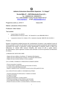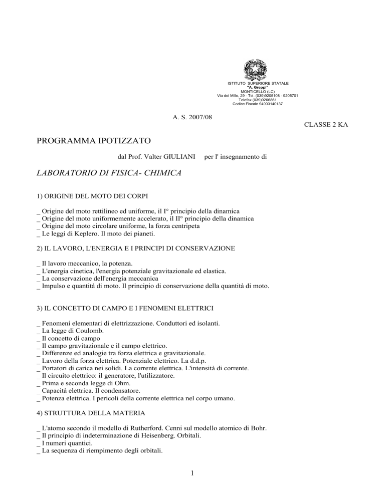 ISTITUTO SUPERIORE STATALE "A. Greppi" MONTICELLO (LC) Via dei Mille, 29 - Tel. (039)9205108 - 9205701 Telefax (039)9206861 Codice Fiscale 94003140137 A. S. 2007/08 CLASSE 2 KA PROGRAMMA IPOTIZZATO dal Prof. Valter GIULIANI per l' insegnamento di LABORATORIO DI FISICA- CHIMICA 1) ORIGINE DEL MOTO DEI CORPI _ Origine del moto rettilineo ed uniforme, il I° principio della dinamica _ Origine del moto uniformemente accelerato, il II° principio della dinamica _ Origine del moto circolare uniforme, la forza centripeta _ Le leggi di Keplero. Il moto dei pianeti. 2) IL LAVORO, L'ENERGIA E I PRINCIPI DI CONSERVAZIONE _ Il lavoro meccanico, la potenza. _ L'energia cinetica, l'energia potenziale gravitazionale ed elastica. _ La conservazione dell'energia meccanica _ Impulso e quantità di moto. Il principio di conservazione della quantità di moto. 3) IL CONCETTO DI CAMPO E I FENOMENI ELETTRICI _ Fenomeni elementari di elettrizzazione. Conduttori ed isolanti. _ La legge di Coulomb. _ Il concetto di campo _ Il campo gravitazionale e il campo elettrico. _ Differenze ed analogie tra forza elettrica e gravitazionale. _ Lavoro della forza elettrica. Potenziale elettrico. La d.d.p. _ Portatori di carica nei solidi. La corrente elettrica. L'intensità di corrente. _ Il circuito elettrico: il generatore, l'utilizzatore. _ Prima e seconda legge di Ohm. _ Capacità elettrica. Il condensatore. _ Potenza elettrica. I pericoli della corrente elettrica nel corpo umano. 4) STRUTTURA DELLA MATERIA _ L'atomo secondo il modello di Rutherford. Cenni sul modello atomico di Bohr. _ Il principio di indeterminazione di Heisenberg. Orbitali. _ I numeri quantici. _ La sequenza di riempimento degli orbitali. 1 5) I LEGAMI CHIMICI E LE SOLUZIONI ELETTROLITICHE _ La regola dell’ottetto. _ Il legame covalente _ Il legame ionico e legame metallico. _ Cationi e anioni. _ Dissociazione e ionizzazione. _ L’elettronegatività _ Soluzioni elettrolitiche importanti: acidi e basi. _ La scala di pH. Autoionizzazione dell’acqua. _ Titolazioni acido-base. _ Le costanti di acidità e basicità _ Calcoli di pH di soluzioni di acidi e basi forti. _ Calcoli di pH di soluzioni di acidi e basi deboli. 6) LA VELOCITA' DELLE REAZIONI CHIMICHE. _ La cinetica chimica _ Fattori che determinano la velocità delle reazioni. ATTIVITA' DI LABORATORIO ( Per approfondimenti consultare il sito Web: www.fisicachimica.it ) _ Uso del foglio elettronico Excel: costruire una tabella, funzioni statistiche e matematiche, grafici. _ Modellare il vetro. _ Saggi alla fiamma. _ Verifica del principio di conservazione della massa. _ Esempi di reazioni di scambio _ Riconoscimento di alcune sostanze: acido acetico, carbonati, nitrati, idrossidi. _ Analisi dei fattori che influenzano la velocità di una reazione chimica. _ Studio qualitativo e quantitativo della conducibilità di sostanze solide e di soluzioni. _ Uso degli indicatori acido base. _ Titolazione acido-base con e senza tecnologia on-line Determinazione del grado di acidità di un aceto commerciale Titolazione dell’acido fosforico contenuto nella CocaCola Titolazione dell’acido citrico contenuto in un limone _ Analisi delle misure di accelerazione e pressione atmosferica raccolte con la strumentazione on-line al parco divertimenti di Mirabilandia. Libro di testo: "Scienza della Materia per moduli Giuseppe Ruffo – Zanichelli ISBN 88-08-09819-2 Monticello, 2 Novembre 2007 prof. Valter Giuliani 2
