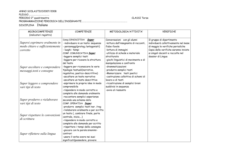 ANNO SCOLASTICO2007/2008 PLESSO……………………………….. PERIODO 2° quadrimestre PROGRAMMAZIONE PERIODICA DELL’INSEGNANTE………………………………………………………………………… DISCIPLINA CLASSI Terze Italiano MICROCOMPETENZE (indicatori registro) COMPETENZE METODOLOGIA/ATTIVITA’ VERIFICHE Saper -individuare in un testo: sequenze - personaggi(protag./antagonisti) - luoghi- tempi COMP. COMUNICATIVA Saper -leggere semplici testi -leggere per ricavare la struttura del testo -leggere per riconoscere le varie tipologie testuali(narrativo, regolativo, poetico-descrittivo) -ascoltare un testo narrativo -ascoltare un testo descrittivo -esprimere le proprie idee in modo comprensibile -rispondere in modo corretto e completo alle domande oralmente -raccontare semplici esperienze secondo una schema dato COMP. OPERATIVA Saper -produrre semplici testi nar. /reg -rielaborare oralmente e per scritto un testo (, cambiare finale, parte centrale, inizio,…) -rispondere in modo corretto e completo alle domande per scritto -rispettare i tempi delle consegne -giocare con le parole:sinonimicontrari -usare il verbo avere nei suoi significati(possedere, provare Conversazioni con gli alunni -lettura dell’insegnante di racconti, fiabe-favole -lettura di immagini -utilizzo di schede e materiale strutturato -giochi linguistici di movimento e di manipolazione e confronto -drammatizzazioni -produrre semplici testi -Memorizzare testi poetici -costruzione collettiva di schemi di lavoro e di testi -ricostruzione di semplici brani suddivisi in sequenza -avvio al riassunto Il gruppo di dipartimento individuerà collettivamente nel mese di maggio le verifiche periodiche Copia delle verifiche saranno inviate ai singoli docenti e raccolte nel dossier di Lingua Comp.CONOSCITIVA Sapersi esprimere oralmente in modo chiaro e sufficientemente corretto Saper ascoltare e comprendere messaggi,testi e consegne Saper leggere e comprendere vari tipi di testo Saper produrre e rielaborare vari tipi di testo Saper rispettare le convenzioni di scrittura Saper riflettere sulla lingua ANNO SCOLASTICO2007/2008 PLESSO……………………………….. PERIODO 2° quadrimestre PROGRAMMAZIONE PERIODICA DELL’INSEGNANTE………………………………………………………………………… DISCIPLINA Italiano emozioni, ausiliare) -riconoscere articoli/nomi/aggettivi/verbi -usare il verbo essere nei suoi significati(trovarsi, provare emozioni, ausiliare) -conoscere il modo indicativo di Essere e Avere -riconoscere la frase minima:SOGGETTO-PREDICATO CLASSI Terze