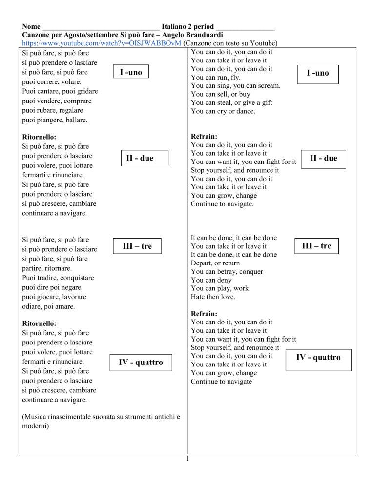 Nome ________________________________ Italiano 2 period ________________ Canzone per Agosto/settembre Si può fare – Angelo Branduardi https://www.youtube.com/watch?v=OISJWABBOvM (Canzone con testo su Youtube) You can do it, you can do it Si può fare, si può fare You can take it or leave it si può prendere o lasciare You can do it, you can do it si può fare, si può fare I -uno You can run, fly. puoi correre, volare. You can sing, you can scream. Puoi cantare, puoi gridare You can sell, or buy puoi vendere, comprare You can steal, or give a gift puoi rubare, regalare You can cry or dance. puoi piangere, ballare. Ritornello: Si può fare, si può fare puoi prendere o lasciare puoi volere, puoi lottare fermarti e rinunciare. Si può fare, si può fare puoi prendere o lasciare si può crescere, cambiare continuare a navigare. Si può fare, si può fare si può prendere o lasciare si può fare, si può fare partire, ritornare. Puoi tradire, conquistare puoi dire poi negare puoi giocare, lavorare odiare, poi amare. Ritornello: Si può fare, si può fare puoi prendere o lasciare puoi volere, puoi lottare fermarti e rinunciare. Si può fare, si può fare puoi prendere o lasciare si può crescere, cambiare continuare a navigare. Refrain: You can do it, you can do it You can take it or leave it You can want it, you can fight for it Stop yourself, and renounce it You can do it, you can do it You can take it or leave it You can grow, change Continue to navigate. II - due It can be done, it can be done You can take it or leave it It can be done, it can be done Depart, or return You can betray, conquer You can deny You can play, work Hate then love. III – tre I -uno II - due III – tre Refrain: You can do it, you can do it You can take it or leave it You can want it, you can fight for it Stop yourself, and renounce it You can do it, you can do it IV - quattro You can take it or leave it You can grow, change Continue to navigate IV - quattro (Musica rinascimentale suonata su strumenti antichi e moderni) 1 Si può fare, si può fare si può prendere o lasciare si può fare, si può fare mangiare, digiunare. Puoi dormire, puoi soffrire puoi ridere, sognare puoi cadere, puoi sbagliare e poi ricominciare. Ritornello Si può fare, si può fare puoi prendere o lasciare puoi volere, puoi lottare fermarti e rinunciare. Si può fare, si può fare puoi prendere o lasciare si può crescere, cambiare continuare a navigare. Si può fare, si può fare puoi vendere, comprare puoi partire, ritornare E poi ricominciare. si può fare, si può fare puoi correre, volare. si può piangere, ballare, continuare a navigare. Si può fare, si può fare si può prendere o lasciare si può fare, si può fare puoi chiedere, trovare. Insegnare, raccontare puoi fingere, mentire, poi distruggere, incendiare e ancora riprovare. Si può fare, si può fare Si può fare, si può fare Si può fare, si può fare Si può fare, si può fare You can do it, you can do it You can take it or leave it You can do it, you can do it V - cinque Eat or fast You can sleep, you can suffer You can laugh, dream You can fall down, you can make a mistake You can start over V - cinque Refrain: You can do it, you can do it You can take it or leave it You can want it, you can fight for it Stop yourself, and renounce it You can do it, you can do it You can take it or leave it You can grow, change Continue to navigate VI - sei You can do it, you can do it You can take it or leave it You can want it, you can fight for it Stop yourself, and renounce it You can do it, you can do it You can take it or leave it You can grow, change Continue to navigate VII - sette It can be done, it can be done You can take it or leave it You can do it, you can do it You can ask, you can find Teach, and tell stories You can pretend, lie Then destroy and set it on fire And then try again VIII - otto You can do it, you can do it You can do it, you can do it You can do it, you can do it You can do it, you can do it IX - nove 2 VI - sei VII - sette VIII - otto IX - nove Nome _________________________________ Italiano 2 Period_______________ Esercizio #1: Data _________________________________ 1) Piegate il foglio in due (Fold the paper in half) – Rally Coach leggete le parole della canzone (Compagno A legge in italiano; Compagno B legge la traduzione in inglese) Stanze 1 e 2 2) Trovate e ) Sottolineate tutti i verbi all’infinito (ARE, ERE, IRE) (Round Robin - Compagno A, 3 verbi; compagno B – 3 verbi; compagno C 3 verbi; compagno D 3 verbi) 3) Categorizzate tutti i verbi che avete trovate (Categorize all the verbs you found) –NON RIPETETE LO STESSO VERBO – auto-controlate i risultati -ARE -ERE -IRE Che cosa notate: (Observations) 1) ____________________________________________________________________ 2) ___________________________________________________________________ 3) ____________________________________________________________________ Esercizio # 2: Data __________________________________ 1) Piegate il foglio in due (Fold the paper in half) – Rally Coach leggete le parole della canzone (Compagno B legge in italiano; Compagno A legge la traduzione in inglese) Stanze 3 e 4 2) Round Robin Completate il modulo con il presente indicativo e il passato prossimo del verbo FARE (il vecchio verbo era FACERE) – seguite le forme già inserite (follow the examples already given) 3 FARE (facere) To do or to make Presente Indicativo Tempo semplice Io Tu (A) Lui, lei (B) Noi Voi (C) Loro (D) faccio facciamo Passato Prossimo Verbo ausiliare: AVERE Participio passato: fatto (A) Hai fatto (B) (C) (D) Hanno fatto Esercizio # 3 Data _____________________________________________ 1) Piegate il foglio in due (Fold the paper in half) – Rally Coach leggete le parole della canzone (Compagno B legge in italiano; Compagno A legge la traduzione in inglese) Stanze 5 e 6 2) Traducete in italiano: (ROUND ROBIN) – provate la prima volta senza guardare il testo. (Try the first round witho