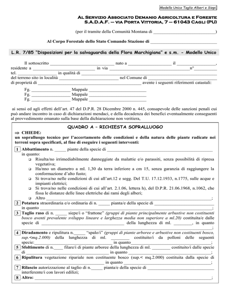 Modello Unico Taglio Alberi e Siepi. Al Servizio Associato Demanio Agricoltura e Foreste S.A.D.A.F. – via Porta Vittoria, 7 – 61043 Cagli (PU) (per il tramite della Comunità Montana di ___________________________) Al Corpo Forestale dello Stato Comando Stazione di _____________________________ L.R. 7/85 “Disposizioni per la salvaguardia della Flora Marchigiana” e s.m. - Modello Unico Il sottoscritto ____________________________ nato a ___________________ il _________________, residente a ___________________________ in via ___________________________________n°__________ tel. _________________ in qualità di ___________________________________________________________ del terreno sito in località __________________________ nel Comune di ______________________________ di proprietà di _____________________________________________ avente i seguenti riferimenti catastali: Fg. _________________ Mappale _________________________ Fg. _________________ Mappale _________________________ Fg. _________________ Mappale _________________________ ai sensi ed agli effetti dell’art. 47 del D.P.R. 28 Dicembre 2000 n. 445, consapevole delle sanzioni penali cui può andare incontro in caso di dichiarazioni mendaci, e della decadenza dei benefici eventualmente conseguenti al provvedimento emanato sulla base della dichiarazione non veritiera, QUADRO A – RICHIESTA SOPRALLUOGO CHIEDE: un sopralluogo tecnico per l’accertamento delle condizioni e della natura delle piante radicate nei terreni sopra specificati, al fine di eseguire i seguenti interventi: 1 Abbattimento n. _____ piante della specie di ______________________________________________ in quanto: Risulta/no irrimediabilmente danneggiate da malattie e/o parassiti, senza possibilità di ripresa vegetativa; Ha/nno un diametro a ml. 1,30 da terra inferiore a cm 15, senza garanzia di raggiungere la conformazione d’alto fusto; Si trova/no nelle condizioni di cui all’art.12 e segg. Del T.U. 17.12.1933, n.1775, sulle acque e impianti elettrici; Si trova/no nelle condizioni di cui all’art. 2.1.06, lettera h), del D.P.R. 21.06.1968, n.1062, che fissa le distanze delle linee elettriche dai rami degli alberi; Altro ________________________________________________________________________; 2 Potatura straordinaria e/o ordinaria di n. _____ pianta/e della specie di __________________________ in quanto ___________________________________________________________________________; 3 Taglio raso di n. _____ siepe/i o “frattone” (gruppi di piante principalmente arbustive non costituenti bosco aventi prevalente sviluppo lineare e larghezza media non superiore a ml.20) costituita/e dalle specie di ____________________________________ della lunghezza di ml. ________, in quanto ___________________________________________________________________________________; 4 Diradamento e ripulitura n._____ “spalo/i” (gruppi di piante arboree e arbustive non costituenti bosco, sup.<mq.2.000) della lunghezza di ml. ________ costituito/i da polloni delle seguenti specie:__________________________________ in quanto___________________________________; 5 Sfoltimento di n.____ filare/i di piante arboree della lunghezza di ml. ________ costituito/i dalle specie di ____________________________________ in quanto ____________________________________; 6 Ripulitura vegetazione ripariale non costituente bosco (sup.< mq.2.000) costituita dalla specie di ____________________________________ in quanto ______________________________________; 7 Rilascio autorizzazione al taglio di n._____ pianta/e della specie di _____________________________ interferente/i con lavori edilizi; 8 Altro: _____________________________________________________________________________; QUADRO B – DENUNCIA INIZIO LAVORI COMUNICA l’inizio dei lavori di: 1 Taglio di n. ______ pianta/e d’alto fusto di ________________________________________ posta/e in: ٱfilare ٱgruppo ٱisolata/e del/dei seguente/i diametro/i: da cm. ___________ a cm. ___________ in quanto risultano secche in piedi per esaurimento del ciclo vegetativo o per cause naturali; 2 Potatura ordinaria di n. _____ pianta/e di ____________________________________________ del/dei seguente/i diametro/i: da cm. ___________ a cm. ___________; 3 Potatura ordinaria o risagomatura di n._____ siepe/i (gruppi di piante principalmente arbustive non costituenti bosco aventi prevalente sviluppo lineare e larghezza media non superiore a ml.20) della lunghezza di ml.________ composta da ___________________________________________________; Si allegano: planimetria catastale in scala; altro di n. _____ pianta/e di __________________________________________ abbattuta/e da 4 Rimozione _______________________________________________ avversità atmosferiche o cause naturali, poste in: ٱbosco ٱgruppo ٱisolata/e 5 Altro: _______________________________________________________________________________________________ _______________________________________________________________________________________ DICHIARA che i lavori avranno inizio non prima di 30 gg. dalla data di arrivo al protocollo della presente denuncia (e quindi dal _______________________) salvo diversa indicazione che il vostro Ufficio vorrà comunicarmi, e che gli stessi termineranno entro un anno. Si allegano: □ Planimetria catastale; □ Altro: _______________________________________________ Solo per l’autorizzazione all’abbattimento di cui al punto 7 (taglio di piante interferenti con attività edilizia): Atto a firma del Dirigente del Servizio Urbanistica del Comune in seno al quale dovrà essere comprovata l’effettiva necessità all’esecuzione dei lavori predetti e dichiarato che, per la realizzazione degli stessi, non esistono ulteriori soluzioni, tecnicamente valide, diverse da quella comportante l’abbattimento di piante protette (da specificare nel numero e nella specie); Planimetria di progetto vistata dal predetto Dirigente, dove saranno evidenziate le piante protette i