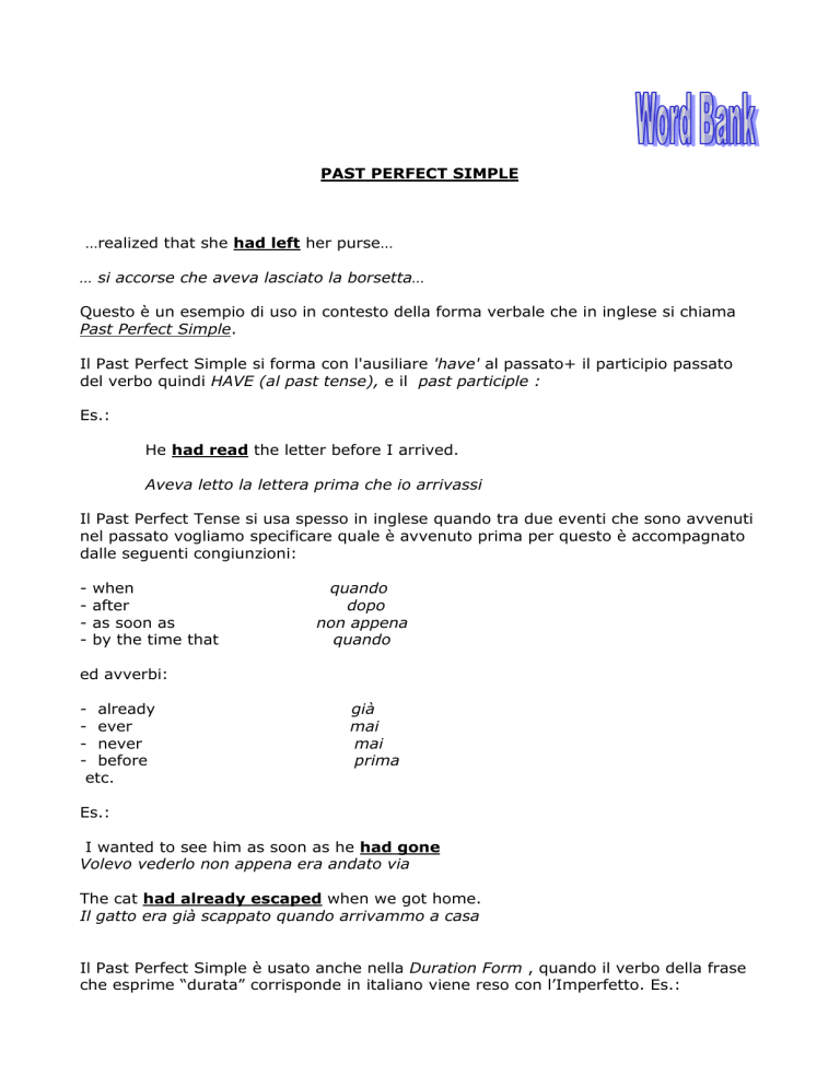 PAST PERFECT SIMPLE …realized that she had left her purse… … si accorse che aveva lasciato la borsetta… Questo è un esempio di uso in contesto della forma verbale che in inglese si chiama Past Perfect Simple. Il Past Perfect Simple si forma con l'ausiliare 'have' al passato+ il participio passato del verbo quindi HAVE (al past tense), e il past participle : Es.: He had read the letter before I arrived. Aveva letto la lettera prima che io arrivassi Il Past Perfect Tense si usa spesso in inglese quando tra due eventi che sono avvenuti nel passato vogliamo specificare quale è avvenuto prima per questo è accompagnato dalle seguenti congiunzioni: - when after as soon as by the time that quando dopo non appena quando ed avverbi: - already - ever - never - before etc. già mai mai prima Es.: I wanted to see him as soon as he had gone Volevo vederlo non appena era andato via The cat had already escaped when we got home. Il gatto era già scappato quando arrivammo a casa Il Past Perfect Simple è usato anche nella Duration Form , quando il verbo della frase che esprime “durata” corrisponde in italiano viene reso con l’Imperfetto. Es.: Lo conoscevo da due anni Ero lì dalle sette I had known him for two years I had been there since seven o’clock Esempi Se per esempio dico: I went to visit the Tower of London We spoke about it in class. In questo caso non sappiamo in quale ordine si sono svolte le due azioni Grazie all’uso del Past Perfect possiamo rendere chiara la sequenza: I went to visit the Tower of London We had discussed it in class. Quando narriamo degli eventi del passato spesso diciamo prima quello che è successo dopo per questioni di stile. Un altro esempio: .When I decided to go to Ireland Sheila lived in Dublin When I decided to go to Ireland Sheila had lived in Dublin, so that she could help me to find a job Così sappiamo che la discussione è avvenuta prima, anche se la frase che la descrive viene dopo. . Abbiamo parlato della Tower of London prima in classe e poi sono andato a vederla Questo può essere molto utile quando si racconta una storia o si mettono in relazione degli eventi passati In qualsiasi punto della storia, si può saltare indietro in un evento precedente, grazie all’uso del Past Perfect Sheila viveva ancora in Irlanda quando io ho deciso di andarci Sheila non viveva più in Irlanda, ma ci aveva vissuto precedentemente, così da Quando pensi di aver compreso l’argomento potermi aiutare a trovare un lavoro. puoi eseguire gli esercizi