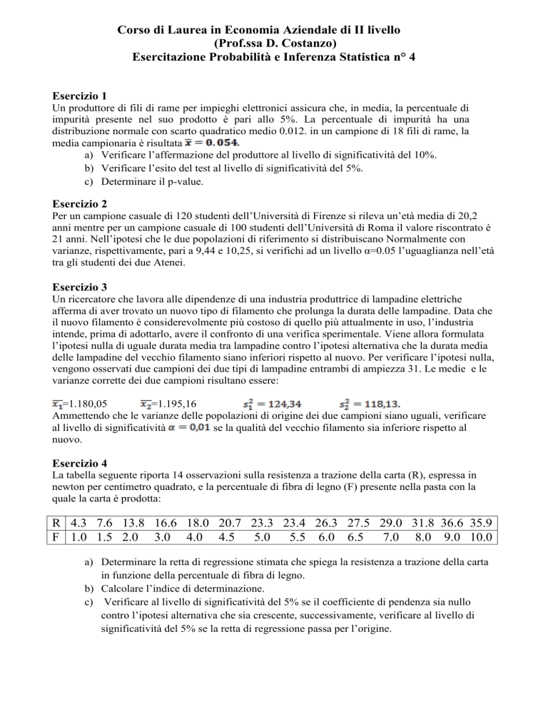 Corso di Laurea in Economia Aziendale di II livello (Prof.ssa D. Costanzo) Esercitazione Probabilità e Inferenza Statistica n° 4 Esercizio 1 Un produttore di fili di rame per impieghi elettronici assicura che, in media, la percentuale di impurità presente nel suo prodotto è pari allo 5%. La percentuale di impurità ha una distribuzione normale con scarto quadratico medio 0.012. in un campione di 18 fili di rame, la media campionaria è risultata a) Verificare l’affermazione del produttore al livello di significatività del 10%. b) Verificare l’esito del test al livello di significatività del 5%. c) Determinare il p-value. Esercizio 2 Per un campione casuale di 120 studenti dell’Università di Firenze si rileva un’età media di 20,2 anni mentre per un campione casuale di 100 studenti dell’Università di Roma il valore riscontrato è 21 anni. Nell’ipotesi che le due popolazioni di riferimento si distribuiscano Normalmente con varianze, rispettivamente, pari a 9,44 e 10,25, si verifichi ad un livello α=0.05 l’uguaglianza nell’età tra gli studenti dei due Atenei. Esercizio 3 Un ricercatore che lavora alle dipendenze di una industria produttrice di lampadine elettriche afferma di aver trovato un nuovo tipo di filamento che prolunga la durata delle lampadine. Data che il nuovo filamento è considerevolmente più costoso di quello più attualmente in uso, l’industria intende, prima di adottarlo, avere il confronto di una verifica sperimentale. Viene allora formulata l’ipotesi nulla di uguale durata media tra lampadine contro l’ipotesi alternativa che la durata media delle lampadine del vecchio filamento siano inferiori rispetto al nuovo. Per verificare l’ipotesi nulla, vengono osservati due campioni dei due tipi di lampadine entrambi di ampiezza 31. Le medie e le varianze corrette dei due campioni risultano essere: =1.180,05 =1.195,16 Ammettendo che le varianze delle popolazioni di origine dei due campioni siano uguali, verificare al livello di significatività se la qualità del vecchio filamento sia inferiore rispetto al nuovo. Esercizio 4 La tabella seguente riporta 14 osservazioni sulla resistenza a trazione della carta (R), espressa in newton per centimetro quadrato, e la percentuale di fibra di legno (F) presente nella pasta con la quale la carta è prodotta: R 4.3 7.6 13.8 16.6 18.0 20.7 23.3 23.4 26.3 27.5 29.0 31.8 36.6 35.9 F 1.0 1.5 2.0 3.0 4.0 4.5 5.0 5.5 6.0 6.5 7.0 8.0 9.0 10.0 a) Determinare la retta di regressione stimata che spiega la resistenza a trazione della carta in funzione della percentuale di fibra di legno. b) Calcolare l’indice di determinazione. c) Verificare al livello di significatività del 5% se il coefficiente di pendenza sia nullo contro l’ipotesi alternativa che sia crescente, successivamente, verificare al livello di significatività del 5% se la retta di regressione passa per l’origine.