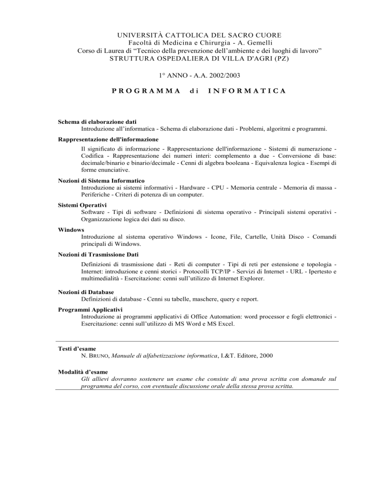 UNIVERSITÀ CATTOLICA DEL SACRO CUORE Facoltà di Medicina e Chirurgia - A. Gemelli Corso di Laurea di “Tecnico della prevenzione dell’ambiente e dei luoghi di lavoro” STRUTTURA OSPEDALIERA DI VILLA D'AGRI (PZ) 1° ANNO - A.A. 2002/2003 PROGRAMMA di INFORMATICA Schema di elaborazione dati Introduzione all’informatica - Schema di elaborazione dati - Problemi, algoritmi e programmi. Rappresentazione dell'informazione Il significato di informazione - Rappresentazione dell'informazione - Sistemi di numerazione Codifica - Rappresentazione dei numeri interi: complemento a due - Conversione di base: decimale/binario e binario/decimale - Cenni di algebra booleana - Equivalenza logica - Esempi di forme enunciative. Nozioni di Sistema Informatico Introduzione ai sistemi informativi - Hardware - CPU - Memoria centrale - Memoria di massa Periferiche - Criteri di potenza di un computer. Sistemi Operativi Software - Tipi di software - Definizioni di sistema operativo - Principali sistemi operativi Organizzazione logica dei dati su disco. Windows Introduzione al sistema operativo Windows - Icone, File, Cartelle, Unità Disco - Comandi principali di Windows. Nozioni di Trasmissione Dati Definizioni di trasmissione dati - Reti di computer - Tipi di reti per estensione e topologia Internet: introduzione e cenni storici - Protocolli TCP/IP - Servizi di Internet - URL - Ipertesto e multimedialità - Esercitazione: cenni sull’utilizzo di Internet Explorer. Nozioni di Database Definizioni di database - Cenni su tabelle, maschere, query e report. Programmi Applicativi Introduzione ai programmi applicativi di Office Automation: word processor e fogli elettronici Esercitazione: cenni sull’utilizzo di MS Word e MS Excel. Testi d’esame N. BRUNO, Manuale di alfabetizzazione informatica, I.&T. Editore, 2000 Modalità d’esame Gli allievi dovranno sostenere un esame che consiste di una prova scritta con domande sul programma del corso, con eventuale discussione orale della stessa prova scritta.