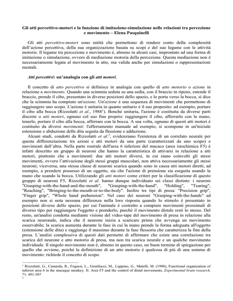Gli atti percettivo-motori e la funzione di imitazione-simulazione nelle relazioni tra percezione e movimento – Elena Pasquinelli Gli atti percettivo-motori sono entità che permettono di rendere conto della complessità dell’azione percettiva, della sua organizzazione basata su scopi e del suo legame con le attività motorie. Il legame tra percezione e movimento è, almeno in alcuni casi, improntato ad una forma di imitazione o simulazione, ovvero di mediazione motoria della percezione. Questa mediazione non è necessariamente legata al movimento in atto, ma valida anche per simulazioni o rappresentazioni mentali. Atti percettivi: un’analogia con gli atti motori. Il concetto di atto percettivo si definisce in analogia con quello di atto motorio o azione in relazione a movimento. Quando una scimmia seduta su una sedia, con il braccio in riposo, estende il braccio, prende il cibo, presentato in diverse posizioni dello spazio, e lo porta verso la bocca, si dice che la scimmia ha compiuto un'azione. Un'azione è una sequenza di movimenti che permettono di raggiungere uno scopo. L'azione è unitaria in quanto unitario è il suo proposito: ad esempio, portare il cibo alla bocca (Rizzolatti et al., 19881). Benché unitaria, l'azione è costituita da diverse parti discrete o atti motori, ognuno col suo fine proprio: raggiungere il cibo, afferrarlo con la mano, tenerlo, portare il cibo alla bocca, afferrare con la bocca. A sua volta, ognuno di questi atti motori è costituito da diversi movimenti: l'afferramento manuale ad esempio, si scompone in un'iniziale estensione e abduzione delle dita seguita da flessione e adduzione. Alcuni studi, condotti da Rizzolatti et al.2, evidenziano l'esistenza di un correlato neurale per questa differenziazione tra azioni e atti motori da una parte (caratterizzati da uno scopo) e movimenti dall’altra. Nella parte rostrale dell'area 6 inferiore del macaco (area istochimica F5) è infatti descritto un gruppo di neuroni che hanno la caratteristica di attivarsi in relazione a atti motori, piuttosto che a movimenti: due atti motori diversi, in cui siano coinvolti gli stessi movimenti, ovvero l’attivazione degli stessi gruppi muscolari, non attiva necessariamente gli stessi neuroni; viceversa, una stessa classe di neuroni scarica quando sono in causa atti motori diretti, ad esempio, a prendere possesso di un oggetto, sia che l'azione di prensione sia eseguita usando la mano che usando la bocca. Utilizzando gli atti motori come criteri per la classificazione di questo gruppo di neuroni F5, Rizzolatti et al. hanno dunque individuato sei classi distinte: i neuroni "Grasping-with-the-hand-and-the-mouth", "Grasping-with-the-hand", "Holding", "Tearing", "Reaching", "Bringing-to-the-mouth-or-to-the-body". Inoltre tre tipi di presa: "Precision grip", "Finger grip", "Whole hand prehension". Nel caso dei neuroni "Grasping-with-the-hands" ad esempio non si nota nessuna differenza nella loro risposta quando lo stimolo è presentato in posizioni diverse dello spazio, per cui l'animale è costretto a compiere movimenti prossimali di diverso tipo per raggiungere l'oggetto e prenderlo, purché il movimento distale resti lo stesso. Del resto, un'analisi condotta mediante visione del video-tape del movimento di presa in relazione alla scarica neuronale, indica che il neurone inizia a scaricare prima che avvenga un movimento osservabile; la scarica aumenta durante la fase in cui la mano prende la forma adeguata all'oggetto (estensione delle dita) e raggiunge il massimo durante la fase flessoria che caratterizza la fine della presa. L’analisi complessiva di questi dati permette di affermare che esiste una correlazione tra scarica del neurone e atto motorio di presa, ma non tra scarica neurale e un qualche movimento individuale. Il singolo movimento non è, almeno in questo caso, un buon termine di spiegazione per quello che avviene, poiché la definizione di un atto motorio è qualcosa di più di una somma di movimento: richiede il concetto di scopo. 1 Rizzolatti, G., Camarda, R., Fogassi, L., Gentilucci, M., Luppino, G., Matelli, M. (1988), Functional organization of inferior area 6 in the macaque monkey. II. Area F5 and the control of distal movements, Experimental brain research, 71: 491-507 2 E’ possibile pensare gli atti percettivi in analogia con questa descrizione delle azioni e degli atti motori: un'azione percettiva sarebbe dunque un'unità basata su di uno scopo e composta da atti percettivi discreti, anch'essi in relazione ad uno scopo. L'atto percettivo può essere composto a sua volta da percezioni diverse, che concorrono all'adempimento dell'atto percettivo, ma non sono né sufficienti a esaurirne la descrizione, perché non ne specificano lo scopo, né necessarie, perché le modalità di attuazione possono variare. Il concetto chiave, come nel caso del movimento, è quello di scopo o funzione. In altri termini: le singole percezioni non sarebbero sufficienti a rendere conto degli atti percettivi, i quali si organizzano in relazione ad una funzione o scopo. Quello degli atti percettivi e delle funzioni percettive sarebbe dunque un possibile sistema per classificare e descrivere la percezione, capace di tenere conto della complessità delle relazioni che i sistemi percettivi mettono in campo negli effettivi contesti dell’azione. Il rafforzamento dell’analogia: i neuroni specchio. Il lavoro di Rizzolatti e dei suoi colleghi permette di rendere l'analogia più consistente, grazie all'individuazione di un correlato neurale anche per alcuni atti percettivi. Un particolare gruppo di neuroni F5 infatti, oltre a scaricare durante i movimenti attivi della scimmia, si attiva anche quando la scimmia osserva lo sperimentatore che compie movimenti significativi con le mani3. Di frequente vi è una chiara somiglianza tra movimento osservato e movimento eseguito4. Questa scoperta va sotto il nome di neuroni specchio. Gli stimoli visivi più efficaci nello stimolare i neu