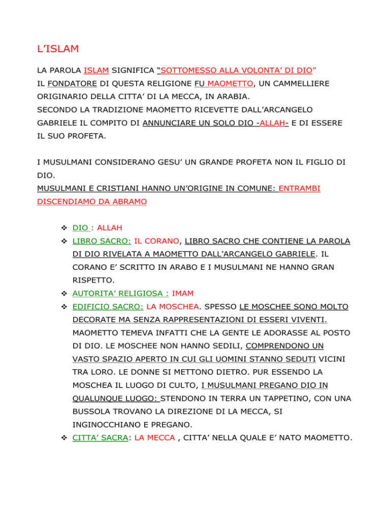 L’ISLAM LA PAROLA ISLAM SIGNIFICA “SOTTOMESSO ALLA VOLONTA’ DI DIO” IL FONDATORE DI QUESTA RELIGIONE FU MAOMETTO, UN CAMMELLIERE ORIGINARIO DELLA CITTA’ DI LA MECCA, IN ARABIA. SECONDO LA TRADIZIONE MAOMETTO RICEVETTE DALL’ARCANGELO GABRIELE IL COMPITO DI ANNUNCIARE UN SOLO DIO -ALLAH- E DI ESSERE IL SUO PROFETA. I MUSULMANI CONSIDERANO GESU’ UN GRANDE PROFETA NON IL FIGLIO DI DIO. MUSULMANI E CRISTIANI HANNO UN’ORIGINE IN COMUNE: ENTRAMBI DISCENDIAMO DA ABRAMO DIO : ALLAH LIBRO SACRO: IL CORANO, LIBRO SACRO CHE CONTIENE LA PAROLA DI DIO RIVELATA A MAOMETTO DALL’ARCANGELO GABRIELE. IL CORANO E’ SCRITTO IN ARABO E I MUSULMANI NE HANNO GRAN RISPETTO. AUTORITA’ RELIGIOSA : IMAM EDIFICIO SACRO: LA MOSCHEA. SPESSO LE MOSCHEE SONO MOLTO DECORATE MA SENZA RAPPRESENTAZIONI DI ESSERI VIVENTI. MAOMETTO TEMEVA INFATTI CHE LA GENTE LE ADORASSE AL POSTO DI DIO. LE MOSCHEE NON HANNO SEDILI, COMPRENDONO UN VASTO SPAZIO APERTO IN CUI GLI UOMINI STANNO SEDUTI VICINI TRA LORO. LE DONNE SI METTONO DIETRO. PUR ESSENDO LA MOSCHEA IL LUOGO DI CULTO, I MUSULMANI PREGANO DIO IN QUALUNQUE LUOGO: STENDONO IN TERRA UN TAPPETINO, CON UNA BUSSOLA TROVANO LA DIREZIONE DI LA MECCA, SI INGINOCCHIANO E PREGANO. CITTA’ SACRA: LA MECCA , CITTA’ NELLA QUALE E’ NATO MAOMETTO. GIORNO SACRO : IL VENERDI’, IN QUESTO GIORNO I MUSULMANI SONO TENUTI AD ANDARE ALLA MOSCHEA. A DIFFERENZA DI EBREI E CRISTIANI QUESTO PERO’ NON E’ GIORNO DI RIPOSO DAL LAVORO. I CINQUE PILASTRI DELL’ISLAM: SONO CINQUE OBBLIGHI CHE I MUSULMANI DEVONO RISPETTARE: o PROFESSIONE DI FEDE o PREGHIERA o DIGIUNO DI RAMADAN o ELEMOSINA AI POVERI o PELLEGRINAGGIO A LA MECCA REGOLE ALIMENTARI: LA LEGGE ISLAMICA STABILISCE QUALI CIBI SI POSSONO MANGIARE. I MUSULMANI NON POSSONO MANGIARE: CARNE DI MAIALE, ANIMALI UCCISI E MACELLATI NON SEGUENDO LE REGOLE RITUALI, NON POSSONO BERE ALCOOL. IL RAMADAN: IL RAMADAN E’ IL MESE SACRO DEDICATO AL RICORDO DELLA RIVELAZIONE DI DIO A MAOMETTO. DURANTE QUESTO PERIODO , CHE INIZIA IL NOVE DI LUGLIO E TERMINA L’OTTO DI AGOSTO, I MUSULMANI DEVONO DIGIUNARE ( NE BERE NE MANGIARE) DAL MATTINA ALLA SERA. FESTE PRINCIPALI: LE DUE FESTE PIU’ IMPORTANTI SONO: o LA PICCOLA FESTA: SEGNA LA FINE DEL MESE DI RAMADAN: CI SI RECA ALLA MOSCHEA PER PREGARE E POI SI FESTEGGIA CON UN PASTO E SCAMBIO DI REGALI E CARTOLINE DI AUGURI, SE POSSIBILE SI INDOSSANO ABITI NUOVI. o LA GRANDE FESTA: CHIAMATA ANCHE “ FESTA DEI SACRIFICI ” IN RICORDO DI ABRAMO CHE OFFRI’ IL FIGLIO A DIO. DURANTE QUESTA FESTA E’ RACCOMANDABILE OFFRIRE UN CAPO DI BESTIAME LA CUI CARNE SARA’ DISTRIBUITA AI POVERI.
