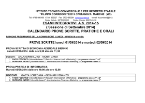 ISTITUTO DI ISTRUZIONE SUPERIORE “Domenico Alberto Azuni” Istituto Professionale per i Servizi Commerciali e per i Servizi dell’Enogastronomia e dell’Ospitalità Alberghiera Istituto Tecnico Grafica e Comunicazione Via Maglias, 132 (Sede Centrale) - 09122 CAGLIARI - Tel. 070 270630 – Fax 070 270756 Via Nora s.n. (Sede Associata) – 09010 PULA (CA) Tel. 0709245452 – Fax 0709249399 e-mail: [email protected] P.E.C. : [email protected] Sito web: azunicagliari.gov.it C.M.: CAIS00200C - C.F. : 80005650926 - Circolare n. 1 Ai docenti SEDE Oggetto: Formazione commissioni esami di idoneità ed integrazione Sono costituite le seguenti commissioni per gli esami di idoneità ed integrazione, che avranno inizio il giorno martedì 6 settembre con la riunione preliminare alle ore 08.30 in aula magna per la sede di Cagliari e in Presidenza (a Pula) per la sede di Pula. SEDE DI CAGLIARI GRAFICO TECNOLOGICO E PROFESSIONALE Allievi: Frailis Paola, Giusti Micol, Ionta Stefano (integrazione alla quarta). Allievi: Ghiani Francesco Antonio (idoneità alla quinta). Allievi: Masala Ambra (idoneità alla quarta). Italiano e Storia: DEDONI Mauro; Inglese: ZANDA Basilia Maria; Francese: CONGIU Maria Francesca; Diritto ed economia: PINTUS Angela Maria; Tecniche professionali commerciale: PIRAS Antonio; Tecniche professionali grafica: da nominare; Matematica: PERRA Annalisa; Tecnologie e Disegno: LAMPIS Giampaolo; Teoria della comunicazione: LAI Bruno; Informatica e laboratorio: MASCIA M. Rita; Economia Aziendale: Piras Antonio; Progettazione multimediale FERRARI Francesco; Storia dell’Arte: da nominare; Scienze motorie: GAMBELLA Luigi; Scienze della terra: MELIS Adelaide; Chimica: MELIS M. Assunta. ENOGASTRONOMICO Allievi: Marcialis Valentina Sara, Perini Calà Clara, Argiolas Mattia, Cocco Denise, Tuveri Martina (idoneità alla terza); Serra Sara (integrazione alla terza). Allievi: Maier Philippe, Nieddu Melanie Roberta (idoneità alla quarta). Italiano e Storia: MULAS Maria Silvana; Inglese: CAMEDDA Laura; Francese: LIGUORI Maurizia; Diritto ed economia: SANJUST Elisabetta; Diritto e Tecniche Amministrative: MASIA Mauro; Matematica: PORCELLI Renata; Fisica: DESSI’ Roberto; Chimica: MELIS Maria Assunta; Scienze della terra: CANEPA Carlo; Scienza degli alimenti: LOI Immacolata; Laboratorio servizi cucina: PINO Gianluca; Laboratorio Servizi Sala Bar: UDA Fabrizio; Laboratorio Servizi Accoglienza: LAMPIS Caterina; Educazione Fisica: ORNANO Maria Cristina. ISTITUTO DI ISTRUZIONE SUPERIORE “Domenico Alberto Azuni” Istituto Professionale per i Servizi Commerciali e per i Servizi dell’Enogastronomia e dell’Ospitalità Alberghiera Istituto Tecnico Grafica e Comunicazione Via Maglias, 132 (Sede Centrale) - 09122 CAGLIARI - Tel. 070 270630 – Fax 070 270756 Via Nora s.n. (Sede Associata) – 09010 PULA (CA) Tel. 0709245452 – Fax 0709249399 e-mail: [email protected] P.E.C. : [email protected] Sito web: azunicagliari.gov.it C.M.: CAIS00200C - C.F. : 80005650926 - SEDE DI PULA Allievi: Melis Nicola Cristiano (idoneità 3 cucina); Ristagno Jacqueline (integrazione terza cucina); Pinna Arianna (idoneità terza sala); Salis Eleonora (integrazione 5 accoglienza). Presidente: NIFFOI Tonina M. Italiano e Storia: COLLU Simonetta; Inglese: AMAT Giuseppina; Francese: TRUDU Adriana; Matematica: SCANU M. Cristina; Diritto ed Economia: PUDDU Ignazia; Fisica: MARROCU Pasqualino; CHIMICA e SCIENZE DELLA TERRA: Coppello Carla; Scienza alimentazione: NIFFOI Tonina M.; Laboratorio Servizi Cucina: PODDIGHE Graziella; Laboratorio Servizi Sala Bar: LEDDA Maurizio; Laboratorio Servizi Accoglienza: FOSCARINI Tommaso; Scienze motorie: FRATTA Stefano; Tecniche comunicazione: da nominare; Tecniche Amministrative: Vacca Alessandra. Cagliari, 1 settembre 2016 IL DIRIGENTE SCOLASTICO Vincenzo Porrà