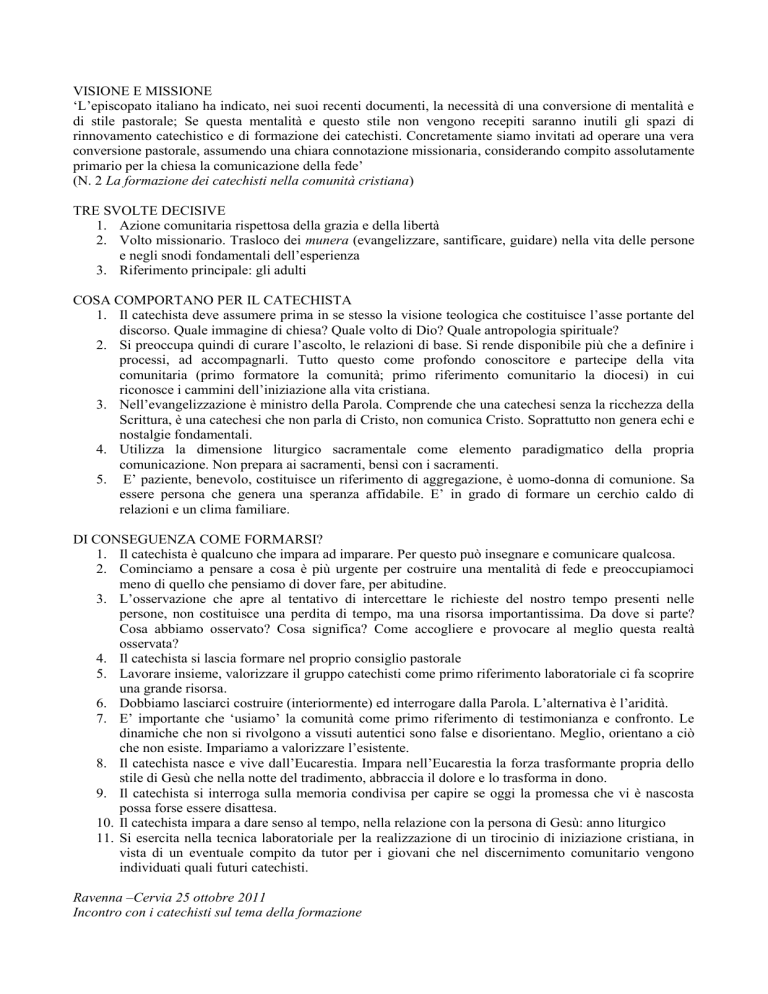 VISIONE E MISSIONE ‘L’episcopato italiano ha indicato, nei suoi recenti documenti, la necessità di una conversione di mentalità e di stile pastorale; Se questa mentalità e questo stile non vengono recepiti saranno inutili gli spazi di rinnovamento catechistico e di formazione dei catechisti. Concretamente siamo invitati ad operare una vera conversione pastorale, assumendo una chiara connotazione missionaria, considerando compito assolutamente primario per la chiesa la comunicazione della fede’ (N. 2 La formazione dei catechisti nella comunità cristiana) TRE SVOLTE DECISIVE 1. Azione comunitaria rispettosa della grazia e della libertà 2. Volto missionario. Trasloco dei munera (evangelizzare, santificare, guidare) nella vita delle persone e negli snodi fondamentali dell’esperienza 3. Riferimento principale: gli adulti COSA COMPORTANO PER IL CATECHISTA 1. Il catechista deve assumere prima in se stesso la visione teologica che costituisce l’asse portante del discorso. Quale immagine di chiesa? Quale volto di Dio? Quale antropologia spirituale? 2. Si preoccupa quindi di curare l’ascolto, le relazioni di base. Si rende disponibile più che a definire i processi, ad accompagnarli. Tutto questo come profondo conoscitore e partecipe della vita comunitaria (primo formatore la comunità; primo riferimento comunitario la diocesi) in cui riconosce i cammini dell’iniziazione alla vita cristiana. 3. Nell’evangelizzazione è ministro della Parola. Comprende che una catechesi senza la ricchezza della Scrittura, è una catechesi che non parla di Cristo, non comunica Cristo. Soprattutto non genera echi e nostalgie fondamentali. 4. Utilizza la dimensione liturgico sacramentale come elemento paradigmatico della propria comunicazione. Non prepara ai sacramenti, bensì con i sacramenti. 5. E’ paziente, benevolo, costituisce un riferimento di aggregazione, è uomo-donna di comunione. Sa essere persona che genera una speranza affidabile. E’ in grado di formare un cerchio caldo di relazioni e un clima familiare. DI CONSEGUENZA COME FORMARSI? 1. Il catechista è qualcuno che impara ad imparare. Per questo può insegnare e comunicare qualcosa. 2. Cominciamo a pensare a cosa è più urgente per costruire una mentalità di fede e preoccupiamoci meno di quello che pensiamo di dover fare, per abitudine. 3. L’osservazione che apre al tentativo di intercettare le richieste del nostro tempo presenti nelle persone, non costituisce una perdita di tempo, ma una risorsa importantissima. Da dove si parte? Cosa abbiamo osservato? Cosa significa? Come accogliere e provocare al meglio questa realtà osservata? 4. Il catechista si lascia formare nel proprio consiglio pastorale 5. Lavorare insieme, valorizzare il gruppo catechisti come primo riferimento laboratoriale ci fa scoprire una grande risorsa. 6. Dobbiamo lasciarci costruire (interiormente) ed interrogare dalla Parola. L’alternativa è l’aridità. 7. E’ importante che ‘usiamo’ la comunità come primo riferimento di testimonianza e confronto. Le dinamiche che non si rivolgono a vissuti autentici sono false e disorientano. Meglio, orientano a ciò che non esiste. Impariamo a valorizzare l’esistente. 8. Il catechista nasce e vive dall’Eucarestia. Impara nell’Eucarestia la forza trasformante propria dello stile di Gesù che nella notte del tradimento, abbraccia il dolore e lo trasforma in dono. 9. Il catechista si interroga sulla memoria condivisa per capire se oggi la promessa che vi è nascosta possa forse essere disattesa. 10. Il catechista impara a dare senso al tempo, nella relazione con la persona di Gesù: anno liturgico 11. Si esercita nella tecnica laboratoriale per la realizzazione di un tirocinio di iniziazione cristiana, in vista di un eventuale compito da tutor per i giovani che nel discernimento comunitario vengono individuati quali futuri catechisti. Ravenna –Cervia 25 ottobre 2011 Incontro con i catechisti sul tema della formazione